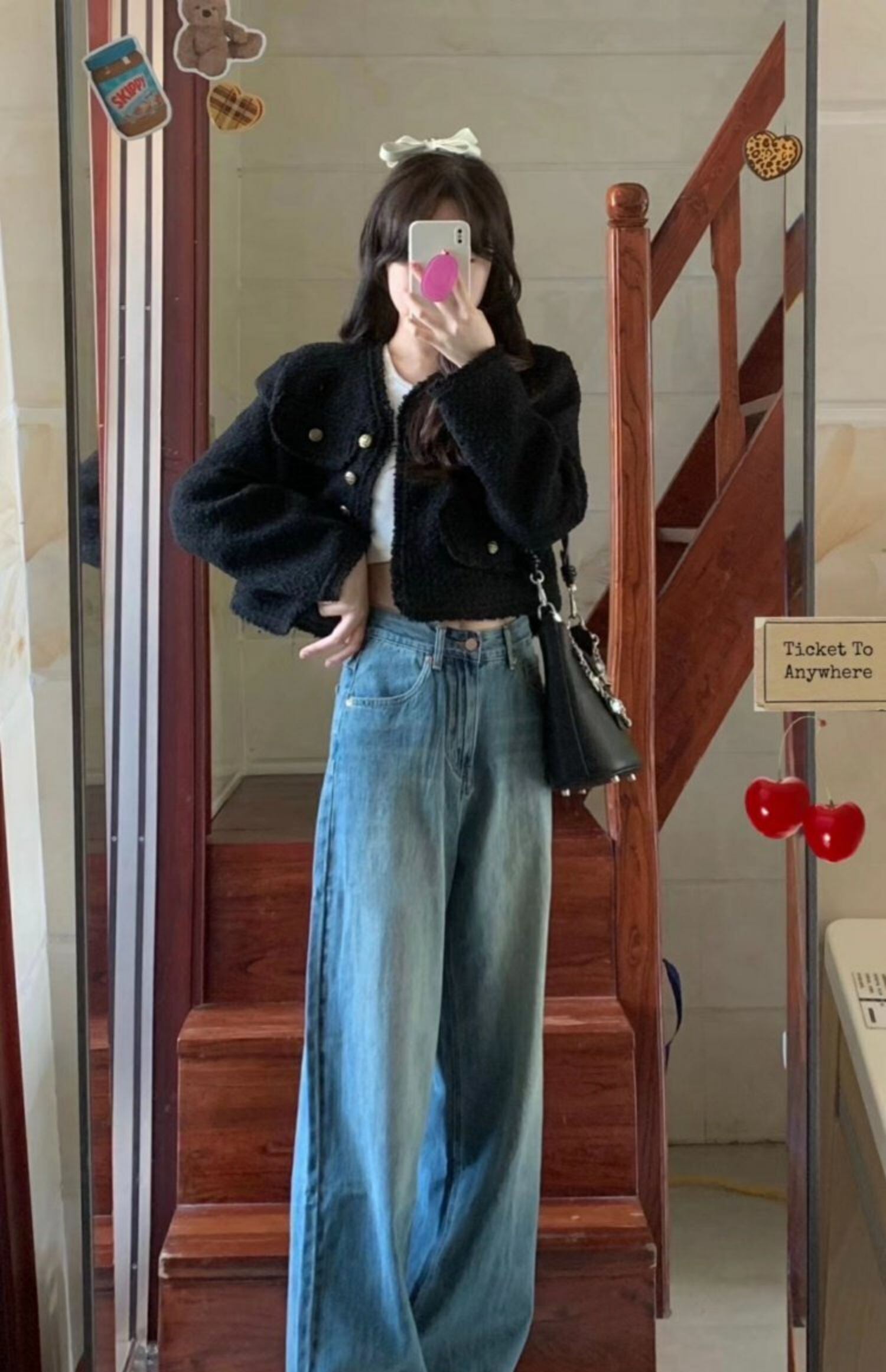 色:ジーンズ,黒いジャケット