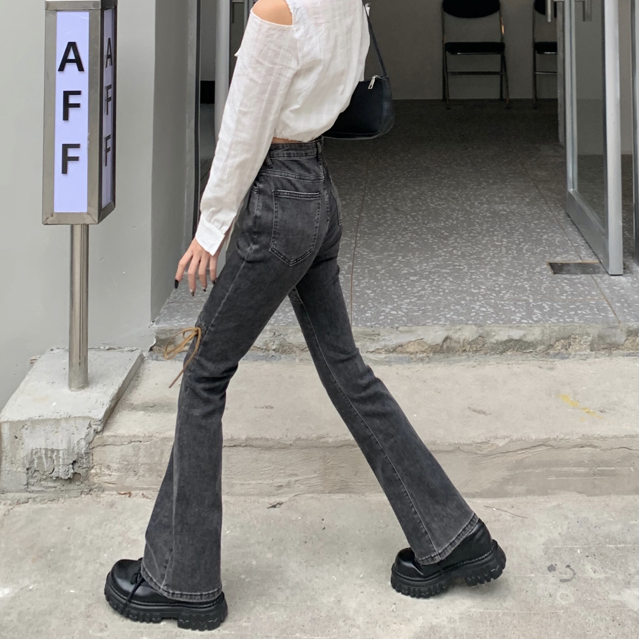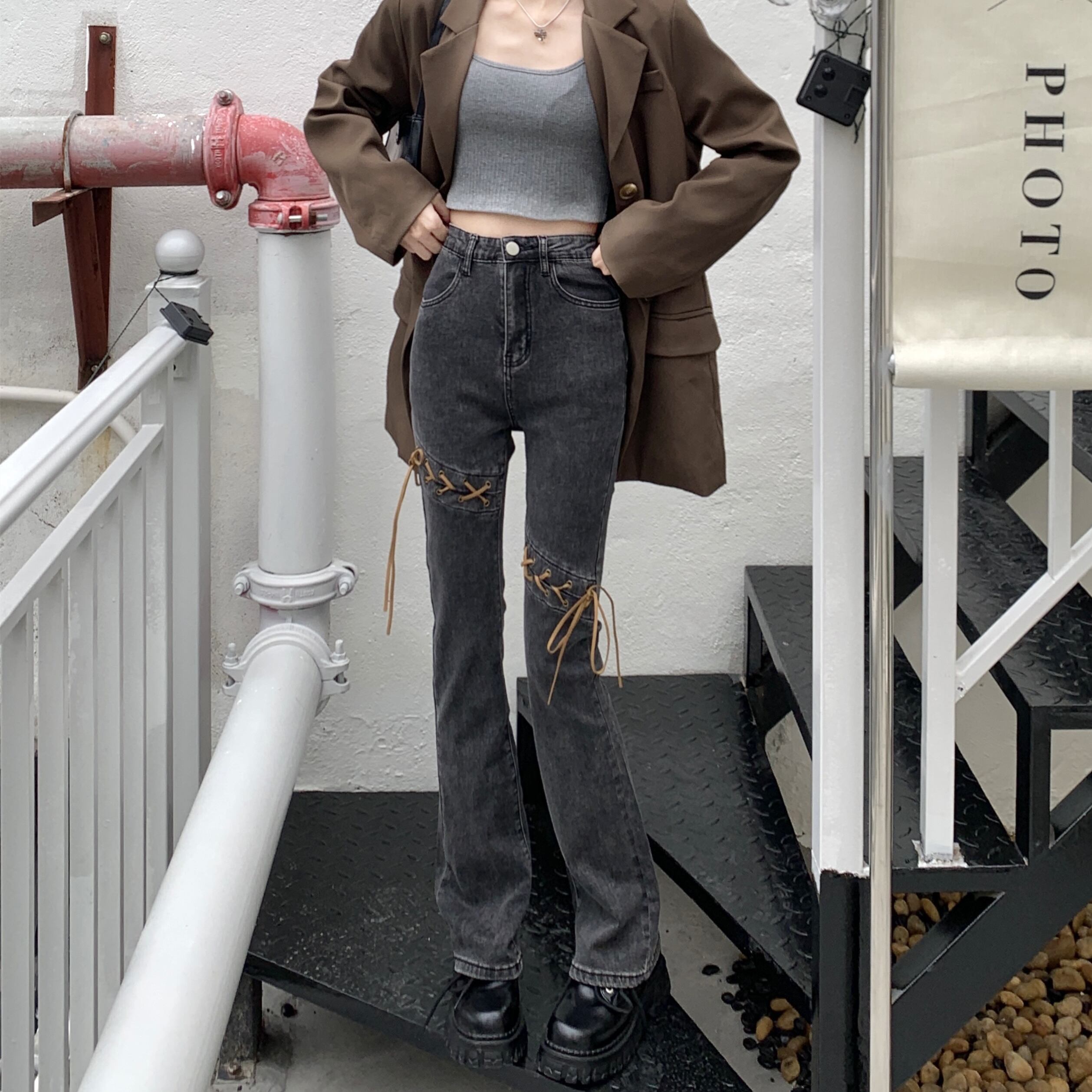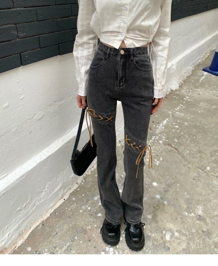 韓国ファッションスタンダードスリムフィットハイウェストウェストジーンズ スプリング秋物バンドパンツ レトロ 春物 オータム スタイル ウエスト MONROE18466097656