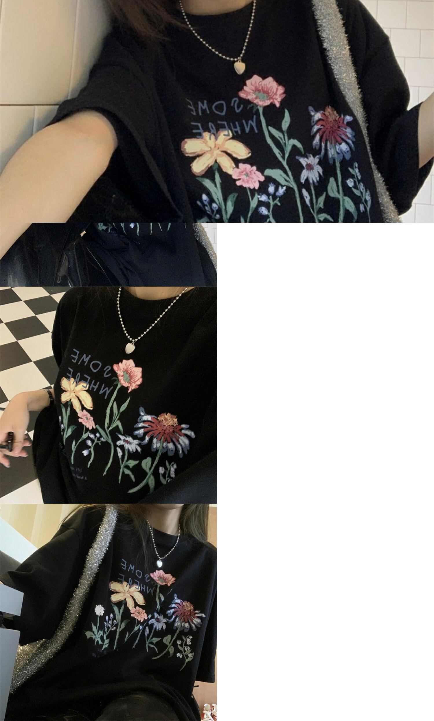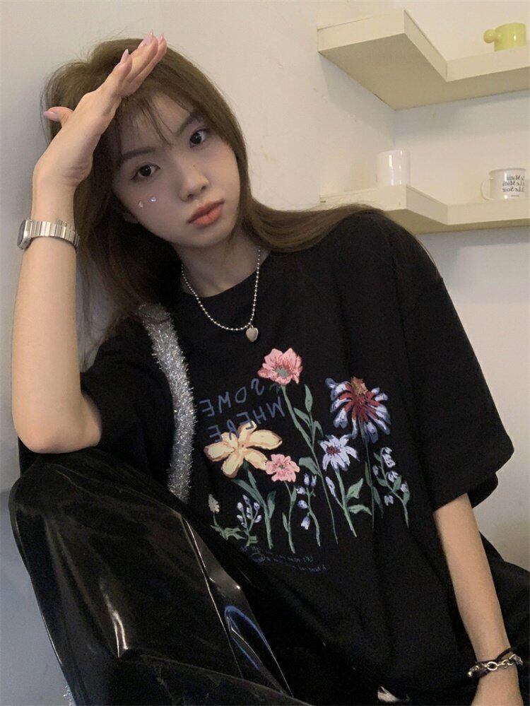 ブラックスタンダードTシャツシャツ 夏服ルーズ薄手Flowerデザイン プリント柄ゆったり レトロ 夏物 フラワーデザイン MONROE43924292439