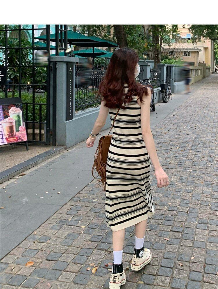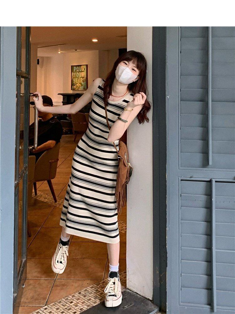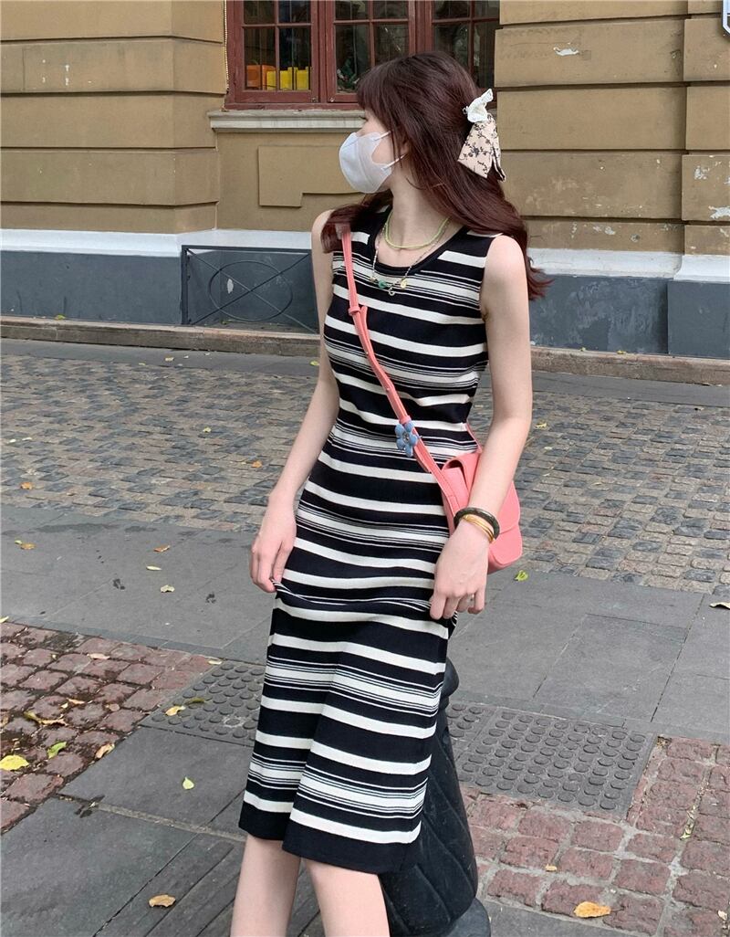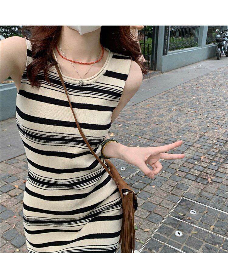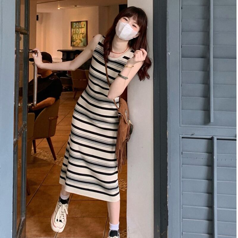 スタイルノースリーブロングスカート ウェストスリムワンピース夏服ストライプ 夏物 ウエスト MONROE81228296657