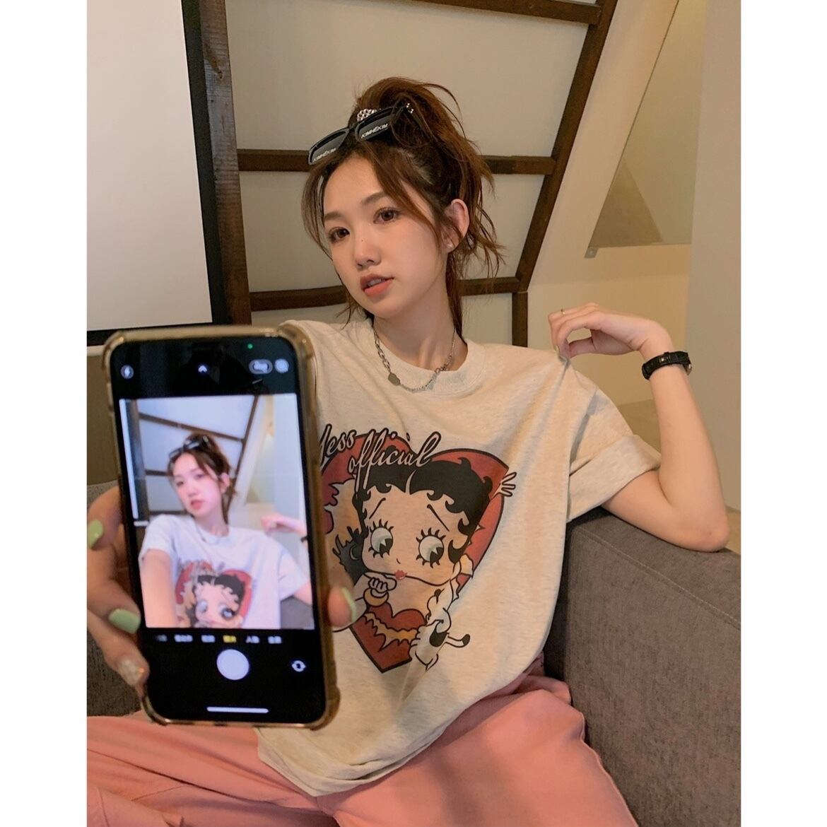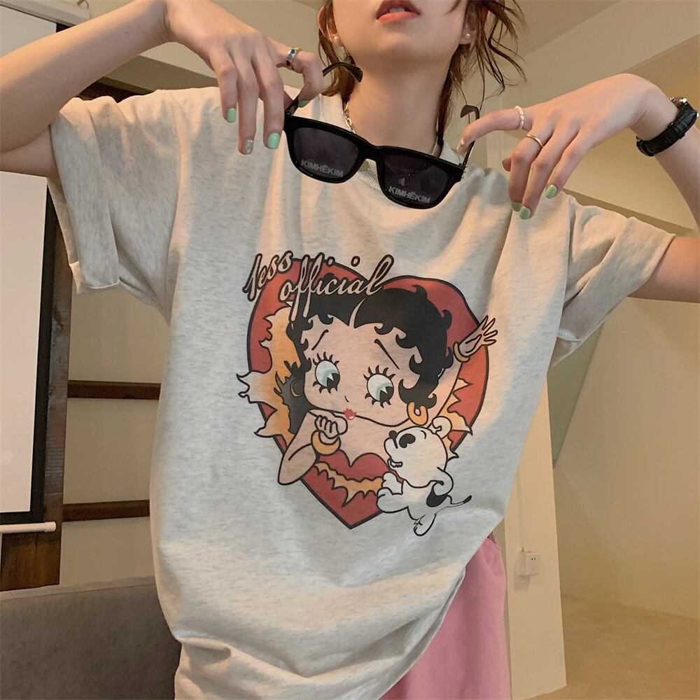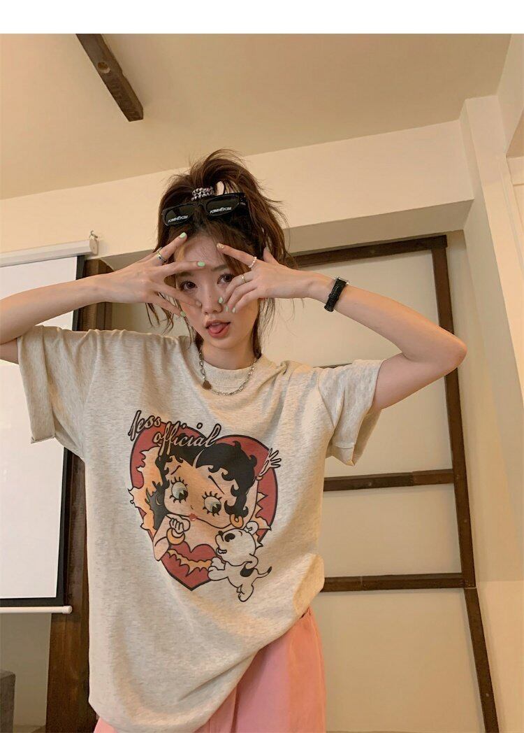 スタンダードTシャツシャツ ゆったり夏服NEWプリントトップス レッド レトロ 夏物 ミドル丈 MONROE69692666177