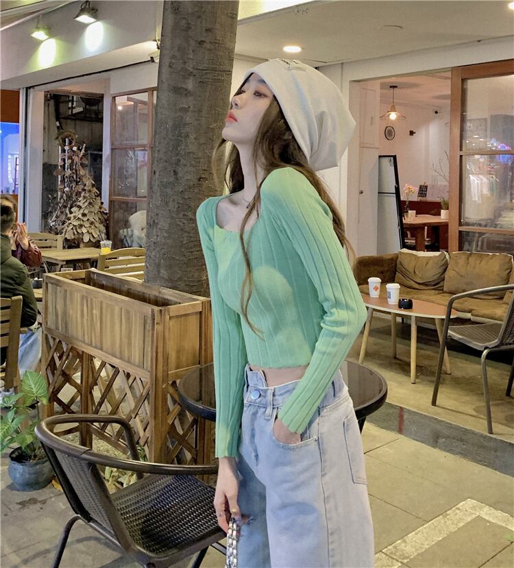 スリムフィット薄手カラーニットゆったりシャツ スプリングショートトップス ロング ストリート 春物 スクウェア 長袖 MONROE88349790884