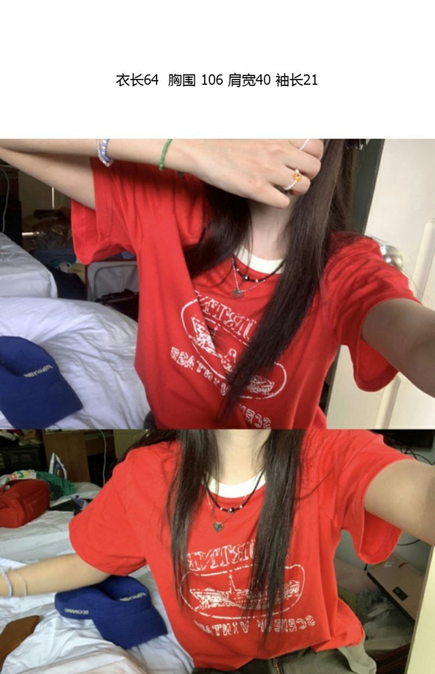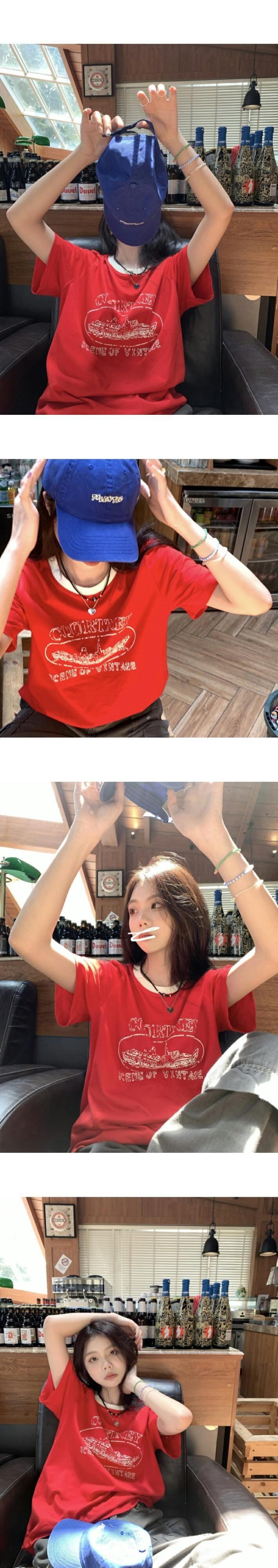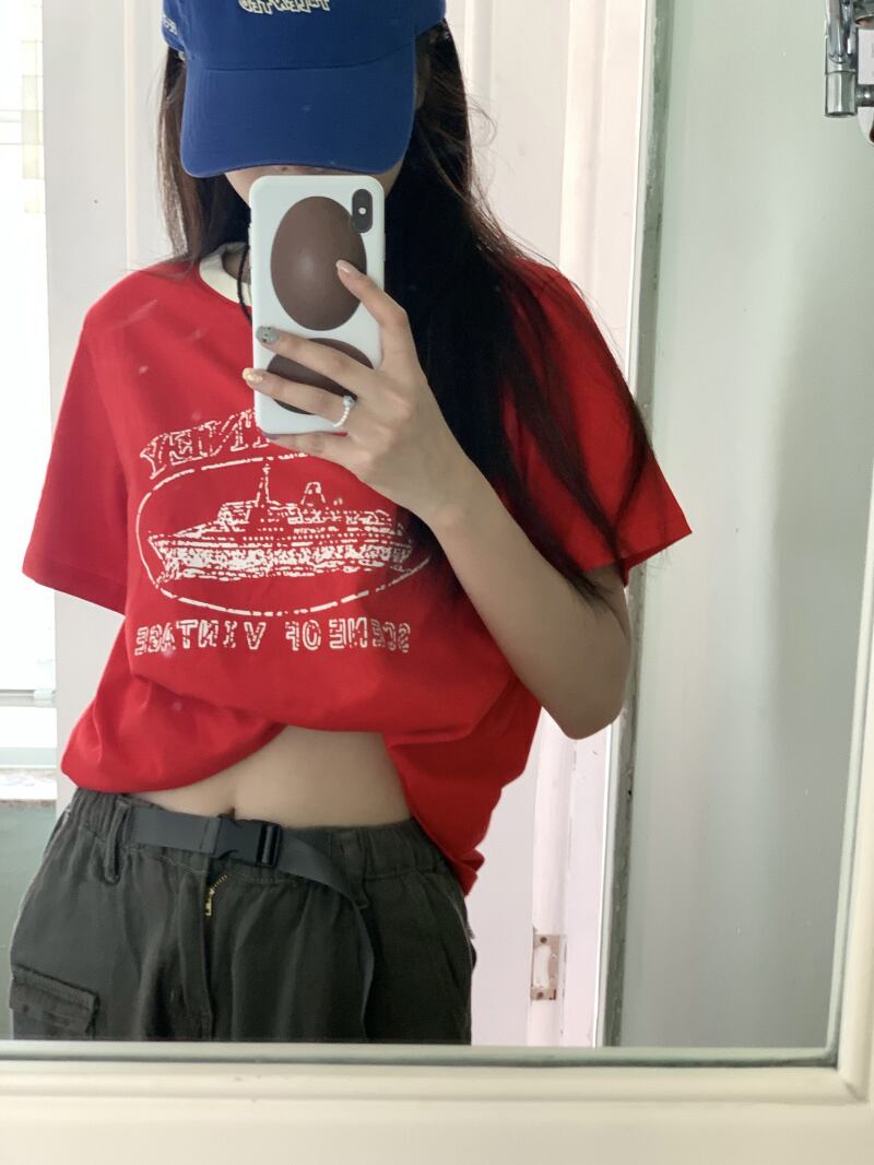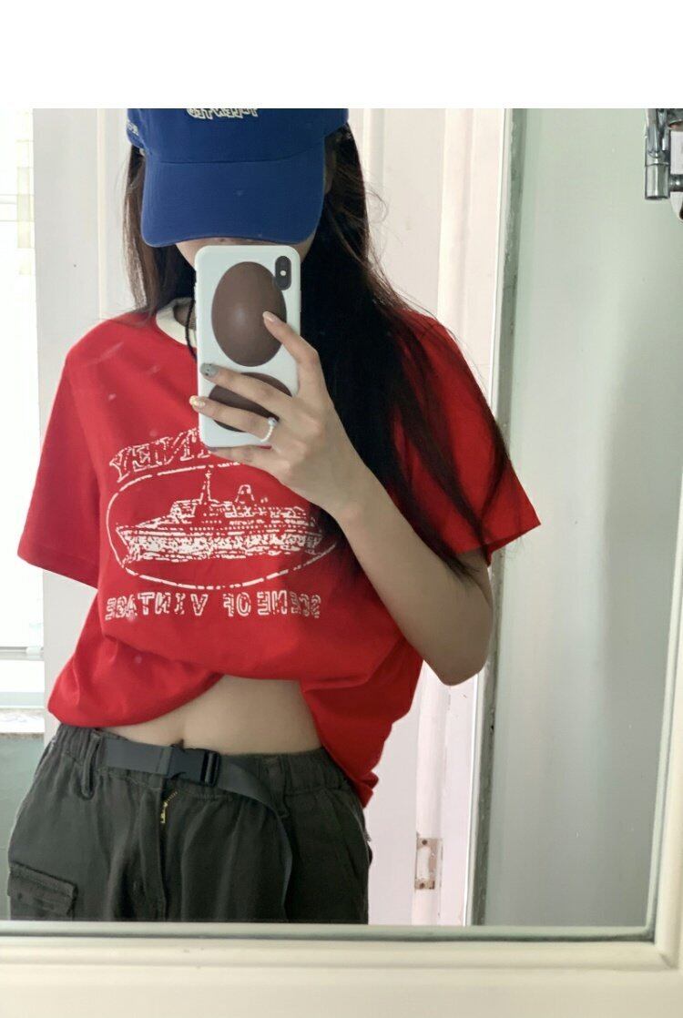 レッドカジュアルTシャツシャツ ルーズラウンドネックプリントゆったりスプリング夏服NEWトップス 春物 夏物 Oネック MONROE7256062599