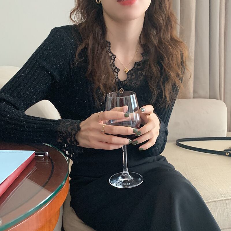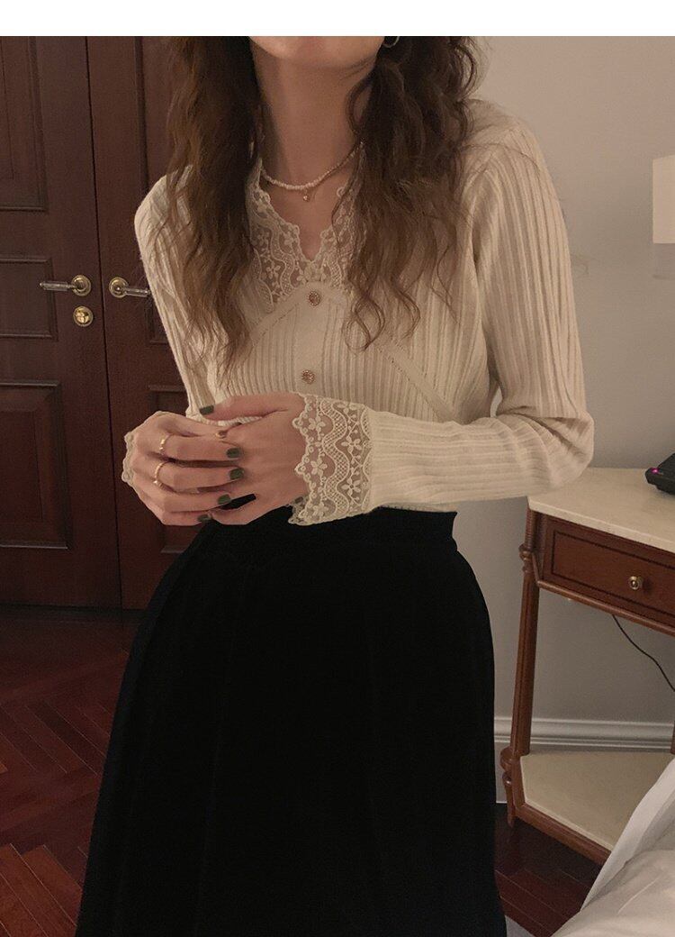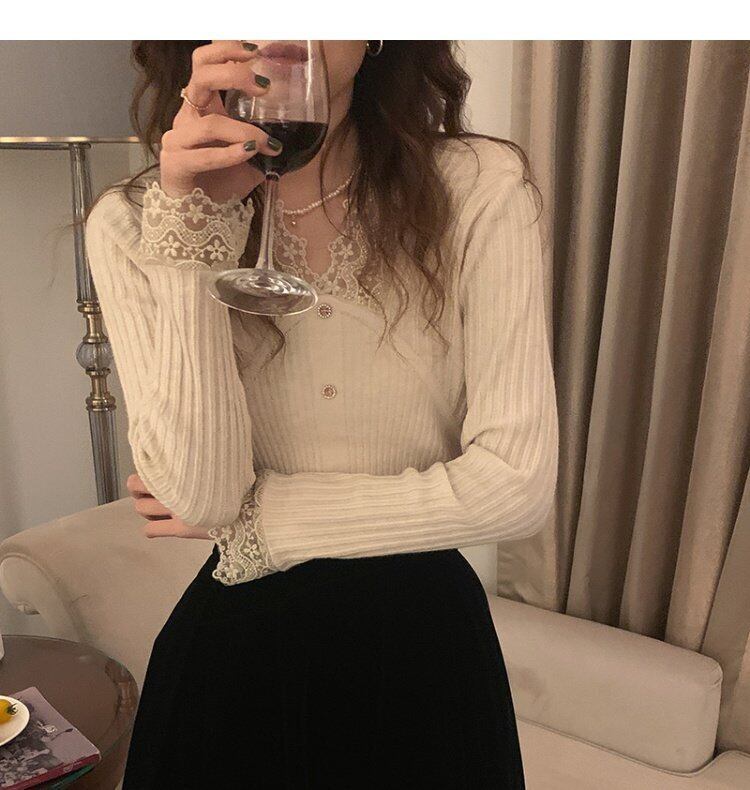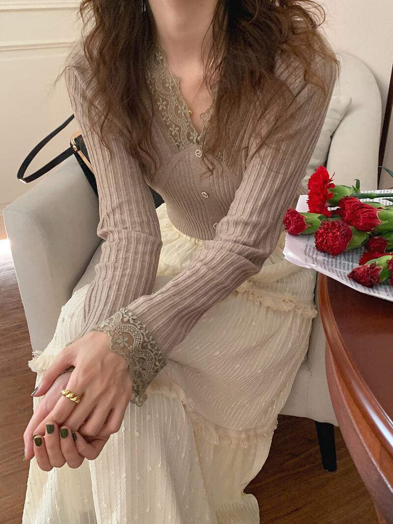 レースVネックゆったりシャツ 秋物ウィンターセーター ベージュニットスリムトップス オータム 冬物 MONROE90778320609