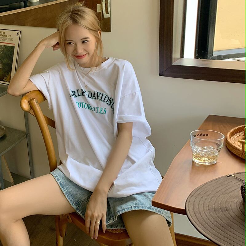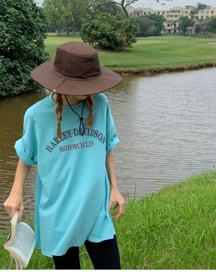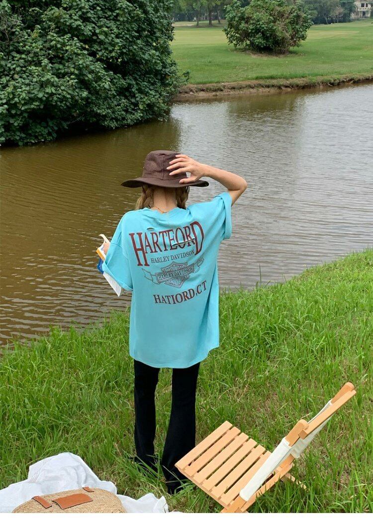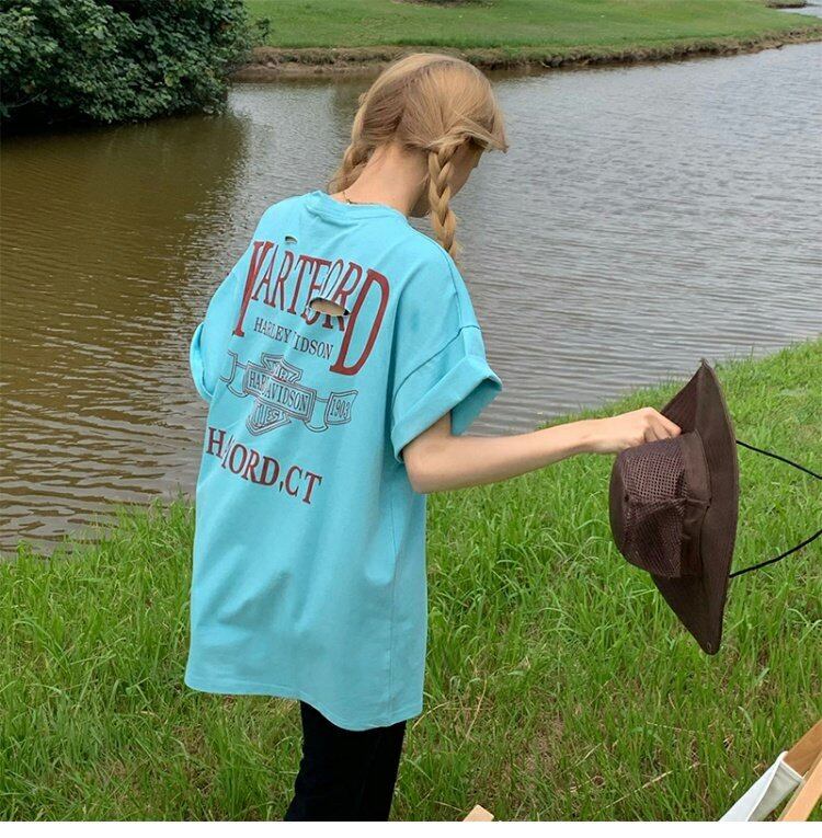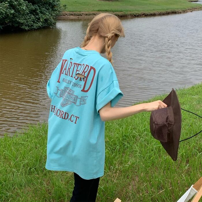 スタンダードプリントTシャツシャツ ブルーゆったりスプリングカジュアルトップス レトロ 春物 MONROE91046891219
