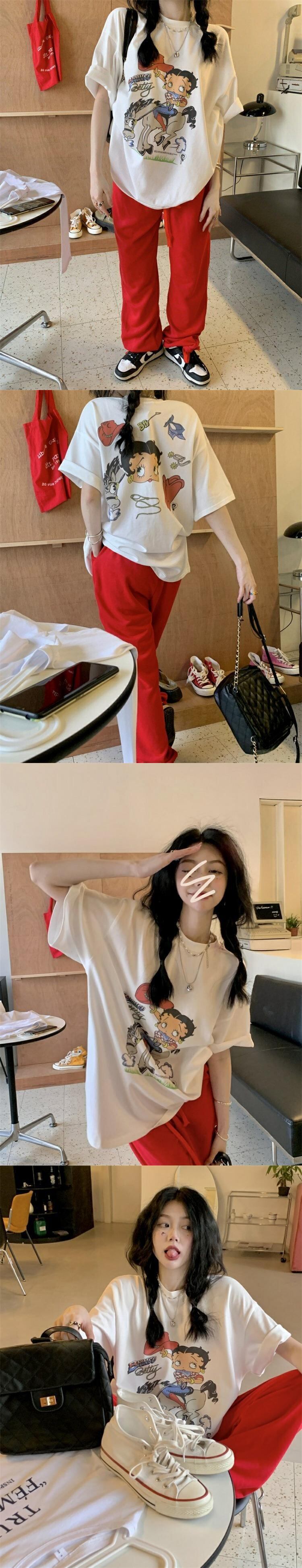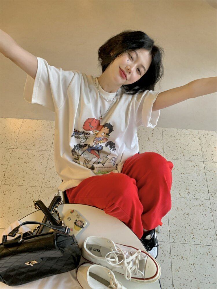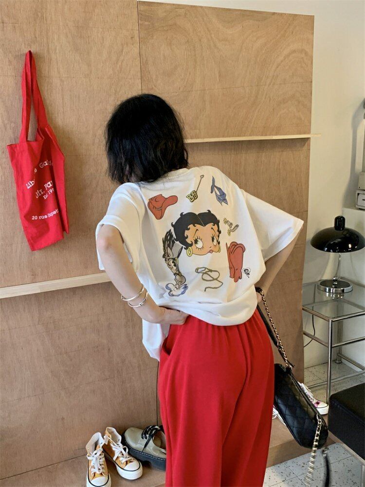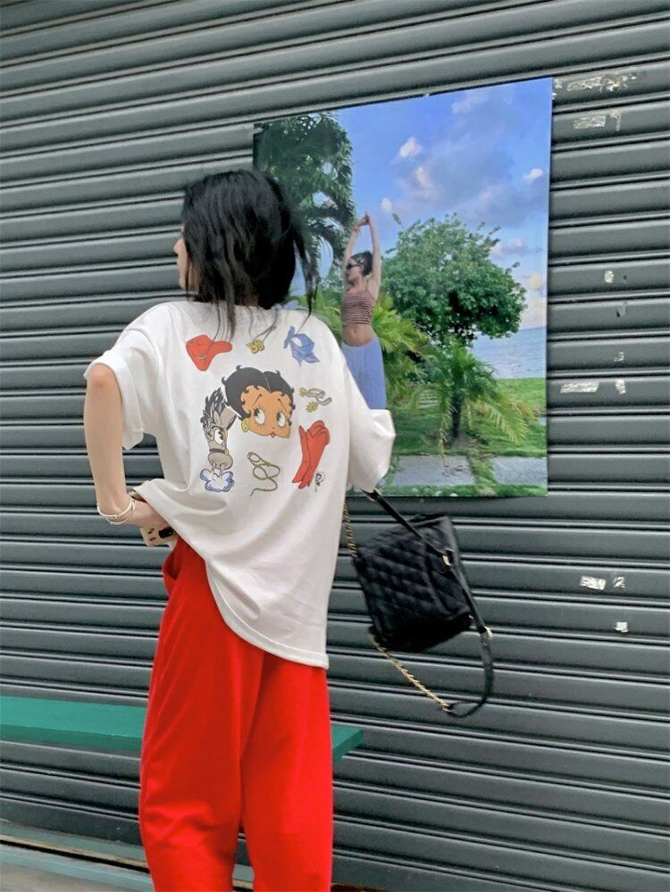 スタンダードバックプリントTシャツシャツ スプリング夏服ルーズ薄手ゆったりラウンドネック韓国ファッション レトロ 春物 夏物 Oネック スタイル MONROE72263097735