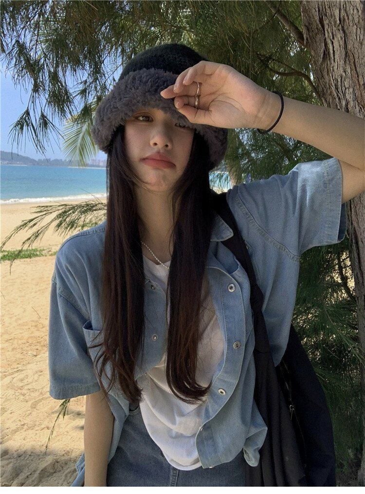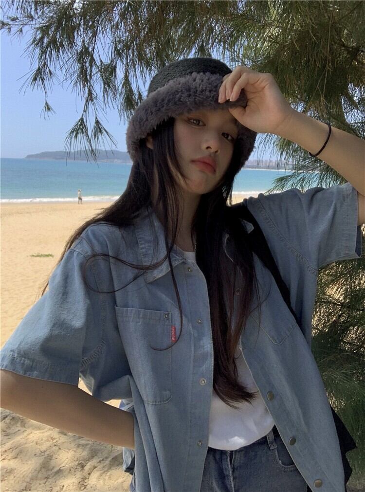 色:ホワイトコットンT,ブルーデニムシャツ,擦り切れたデニムショートパンツ