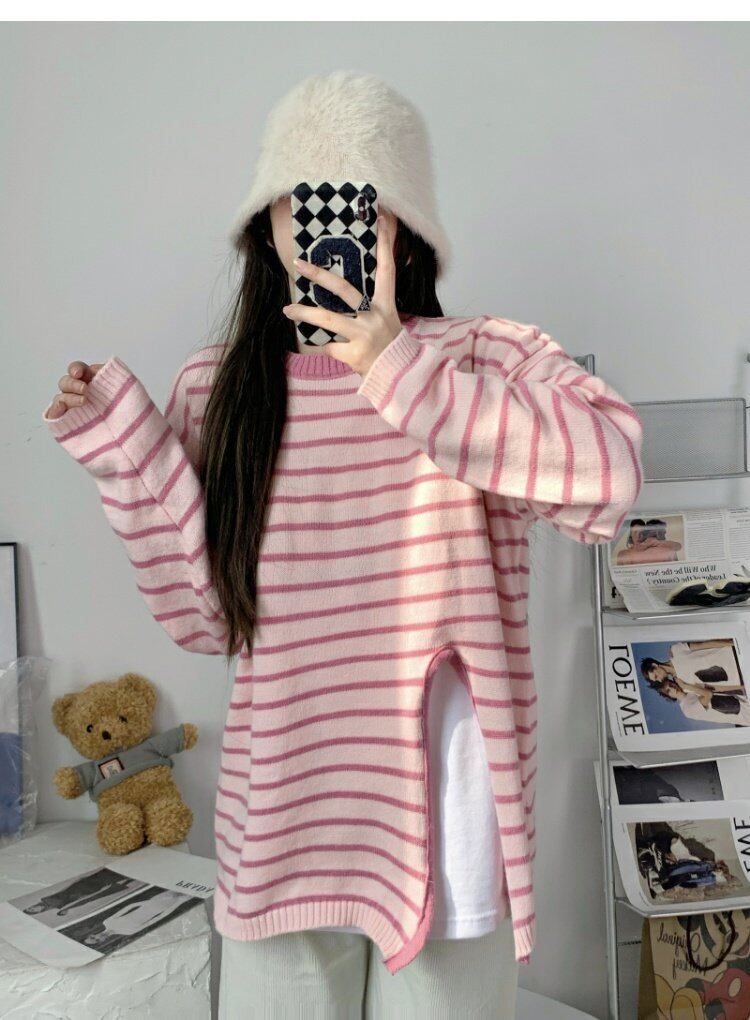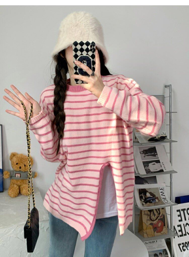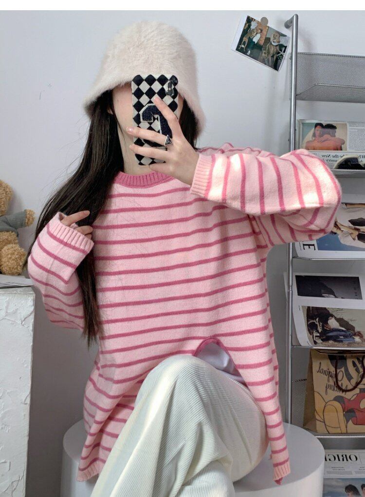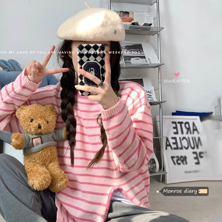 秋物ウィンター韓国ファッションNEWストライプセーター カラールーズトップス ピンク オータム 冬物 スタイル MONROE6343246479