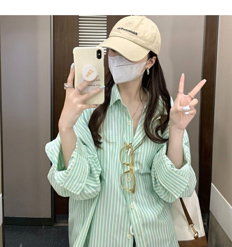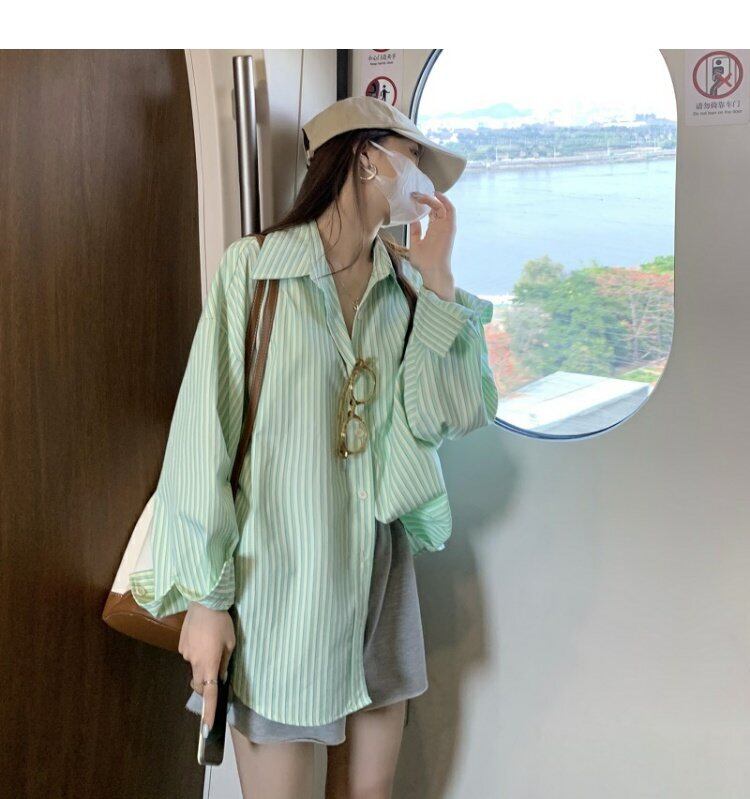 グリーンストライプシャツ スプリングルーズ薄手コート ロング 春物 長袖 MONROE61599290791
