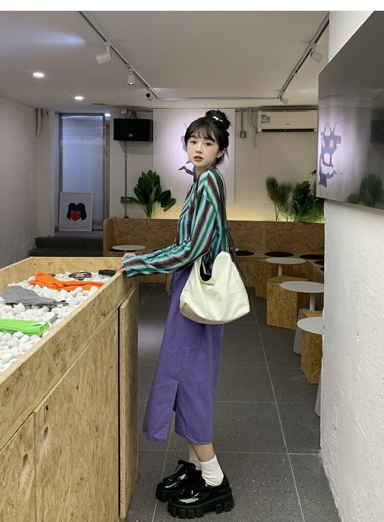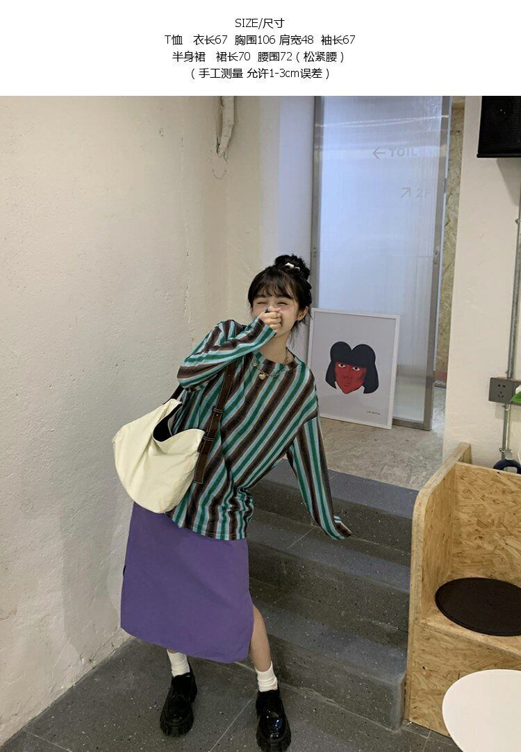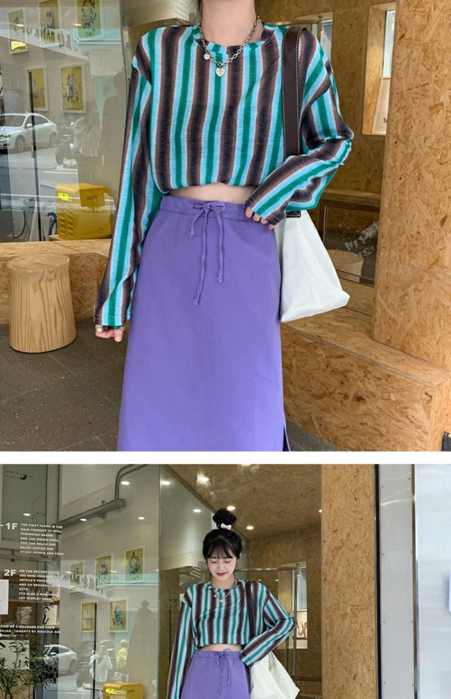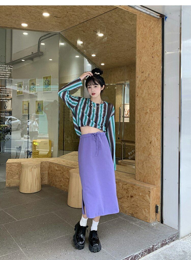 色:ストライプTシャツ,紫のスカート