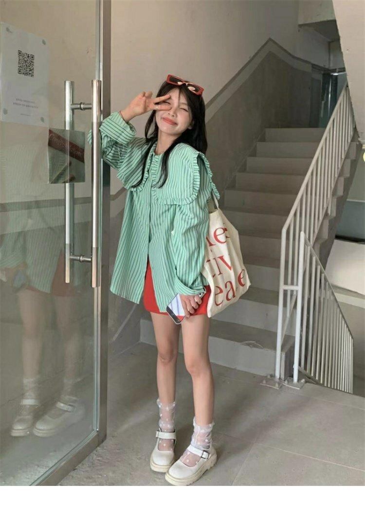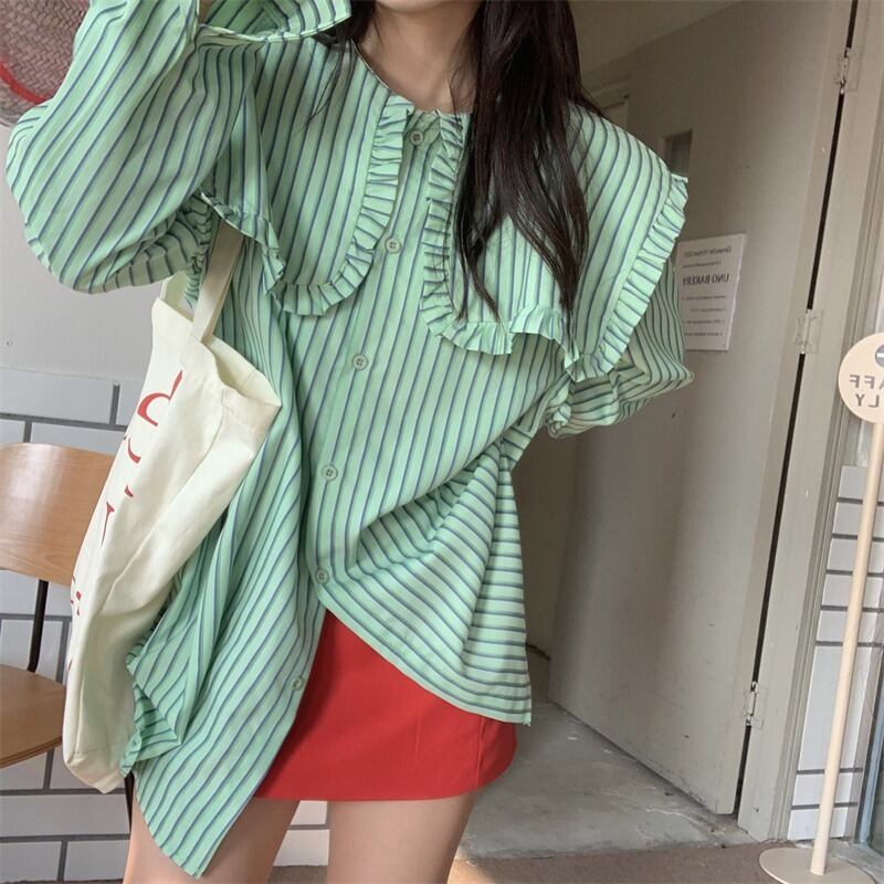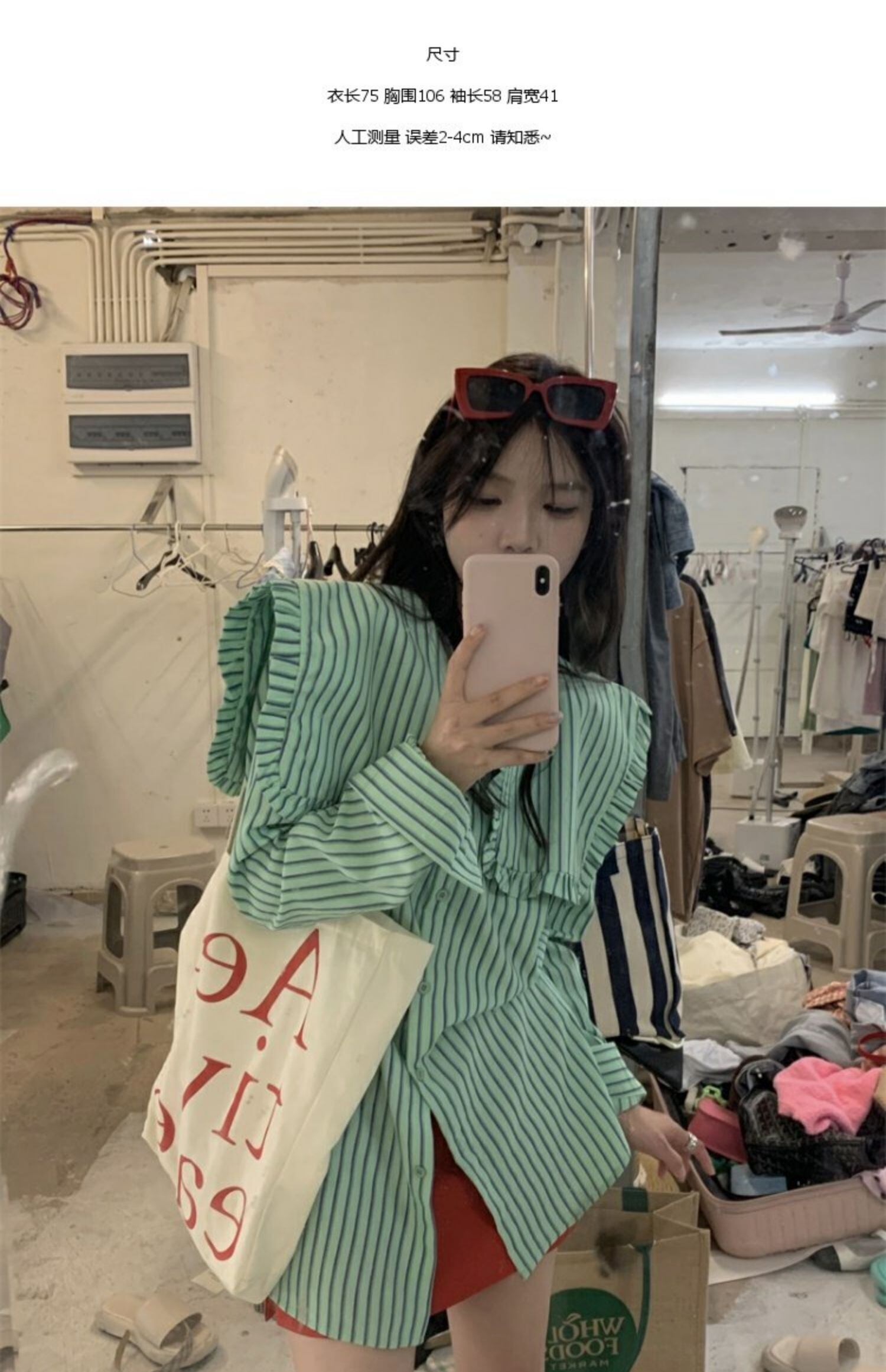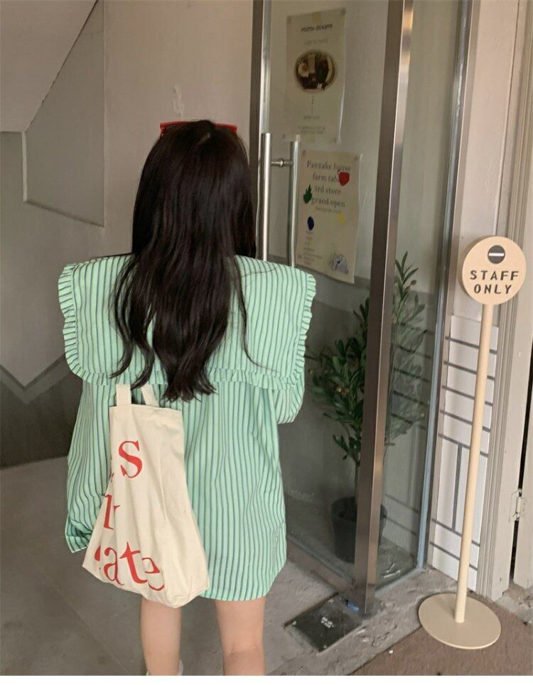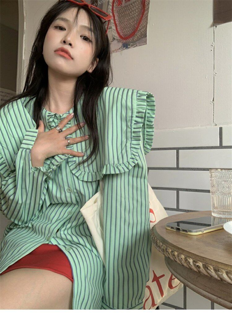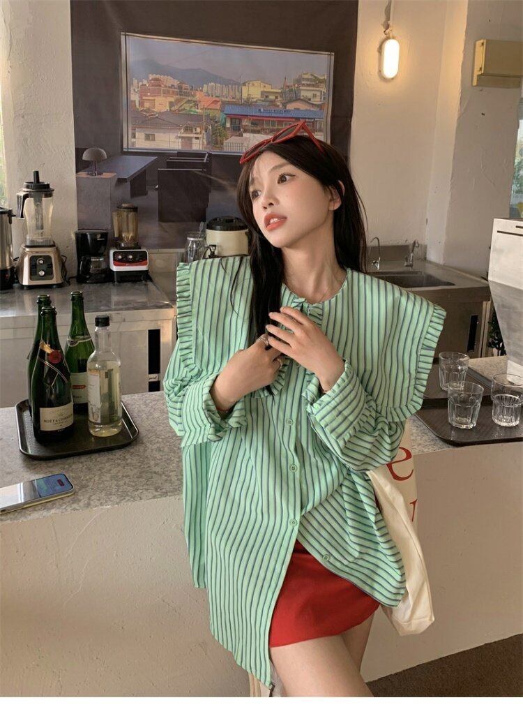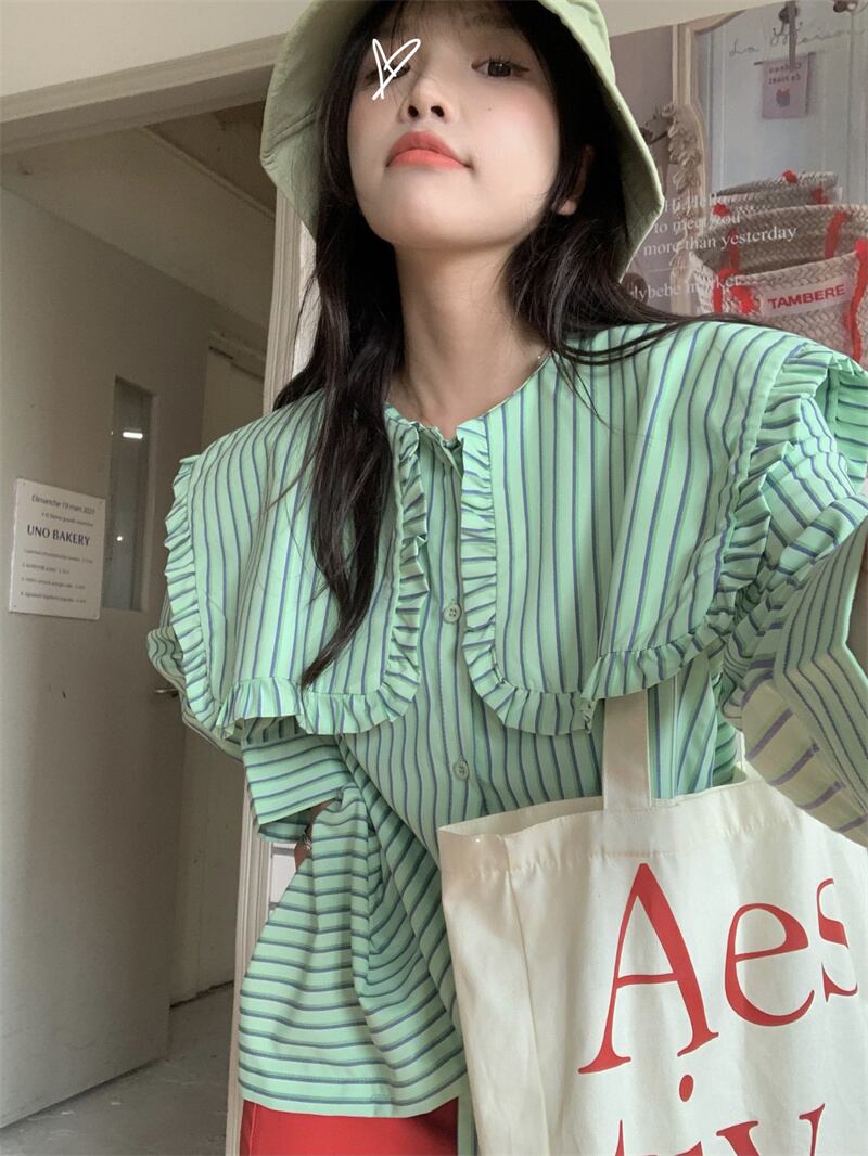 ネイビーカラーシャツ 夏服ルーズ薄手トップス ストライプゆったり 夏物 MONROE45184499290