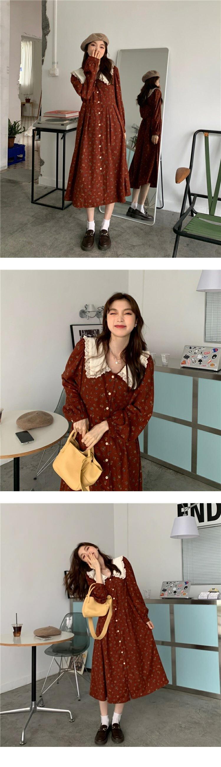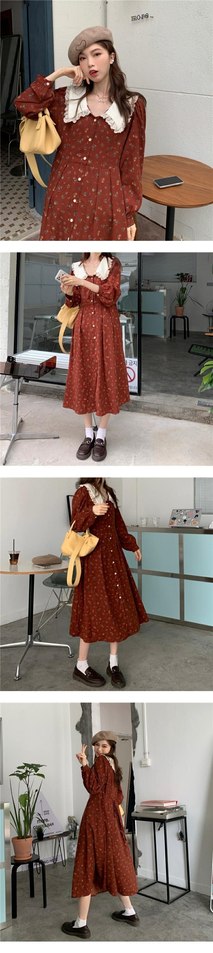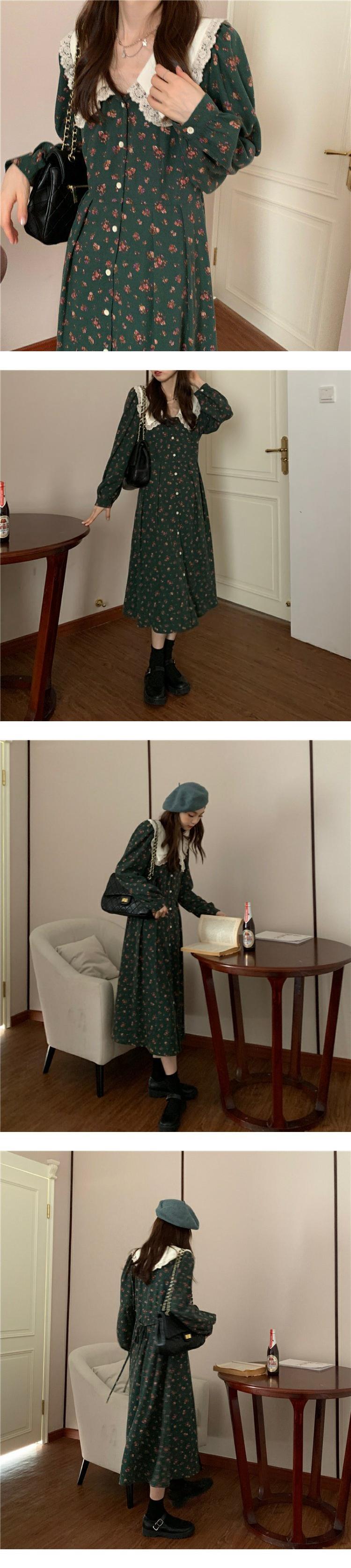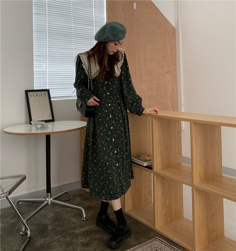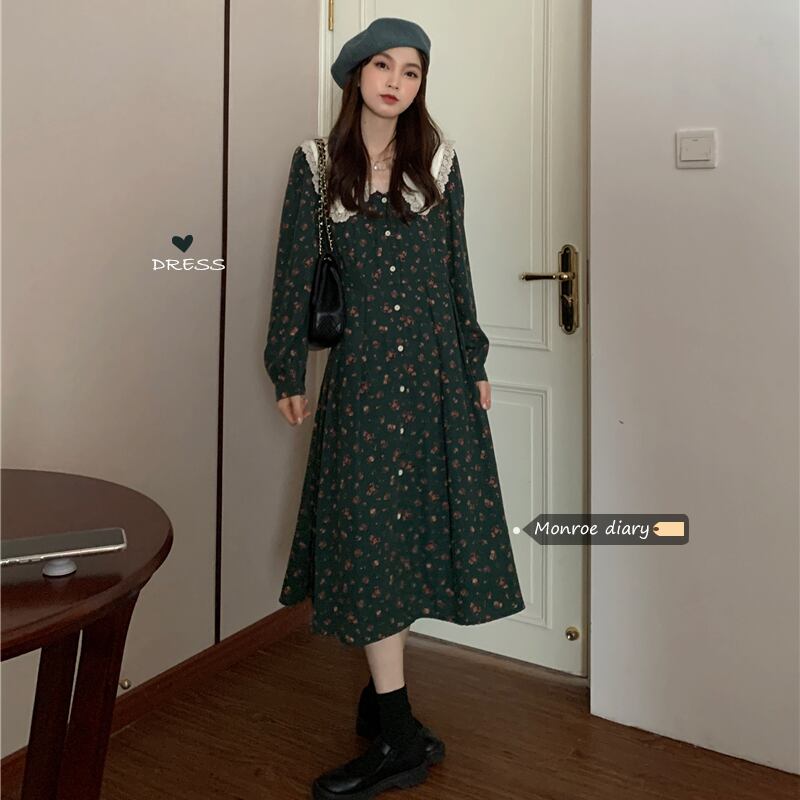 スタンダードフローラルワンピーススプリング秋物スタイルウェスト薄手ロングスカート レトロ ストリート 春物 オータム 花柄 ウエスト MONROE24073779332