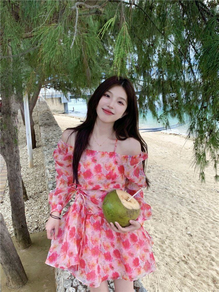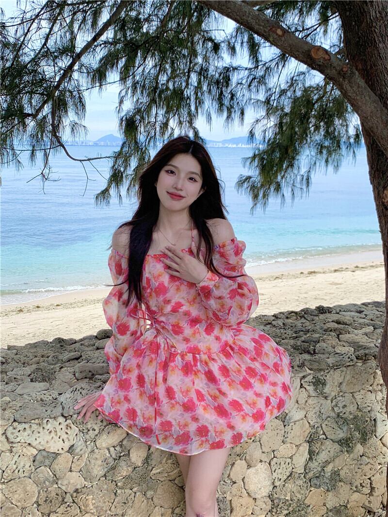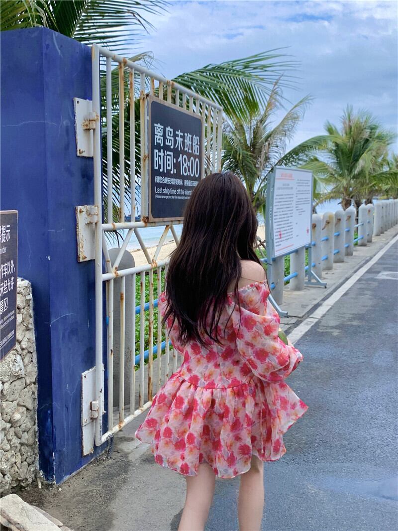 フローラルワンピース夏服ウェストスリーブショートスカート 大人ガーリー スウィート キュート カジュアル 夏物 花柄 ウエスト ミドル丈 MONROE65036757710