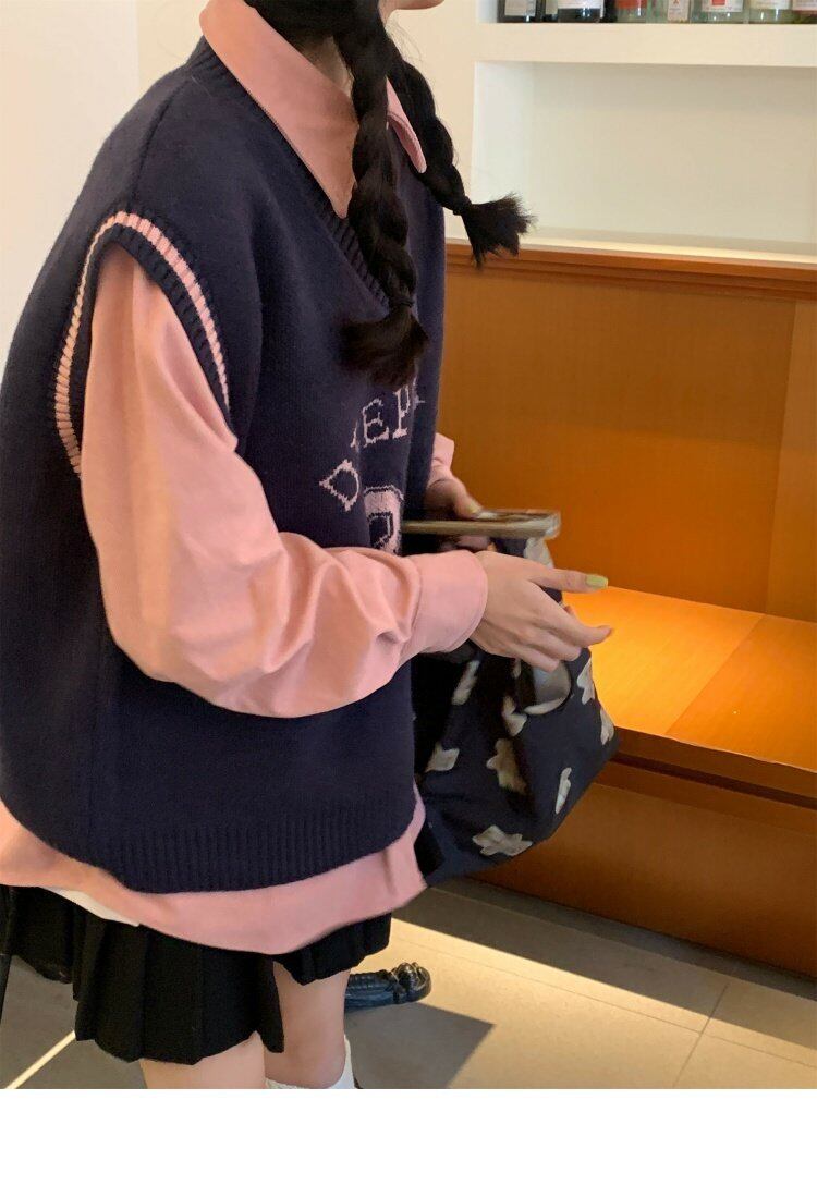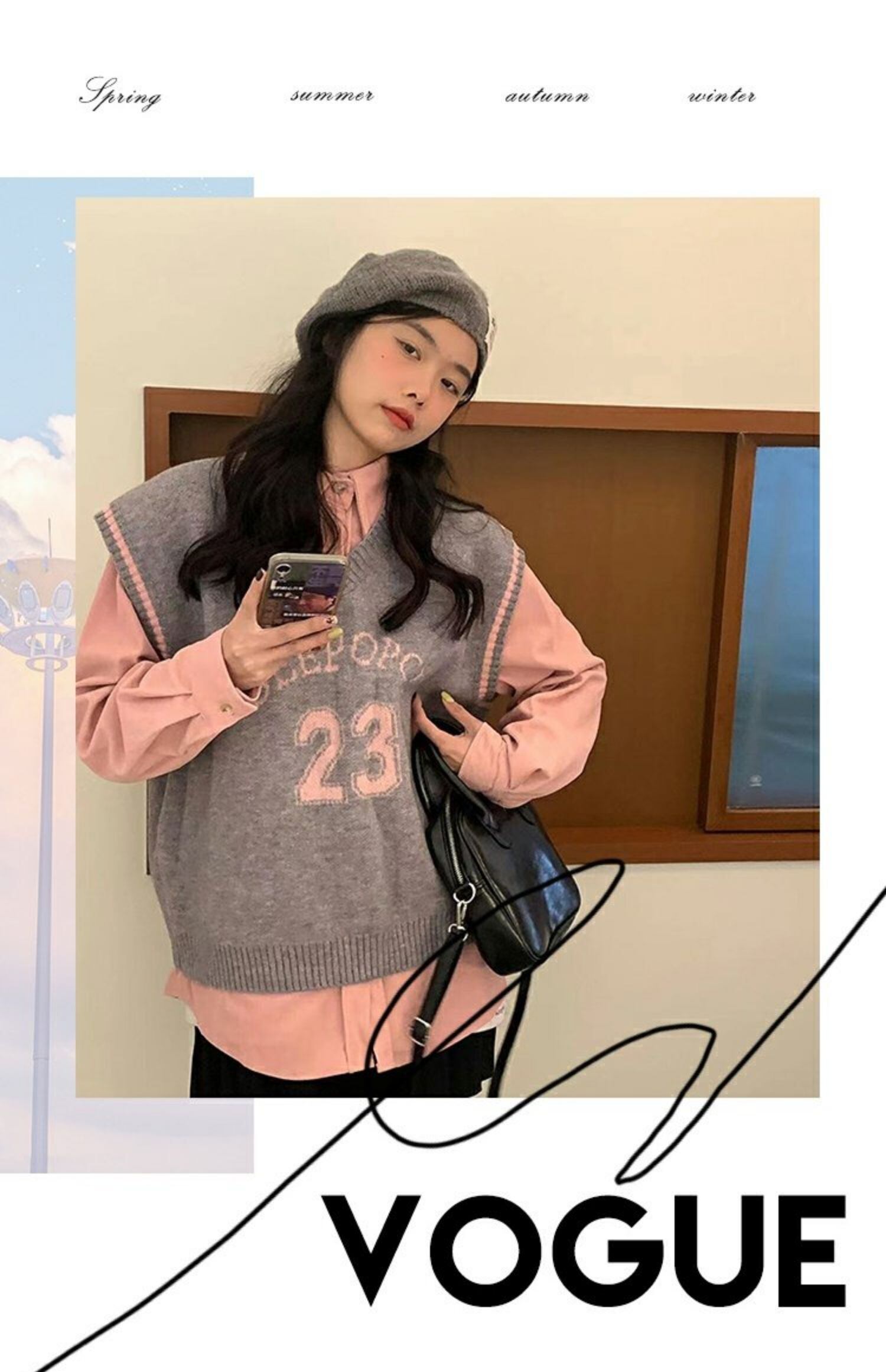 色:ダークブルーのチョッキ,グレーのベスト,ピンクのシャツ