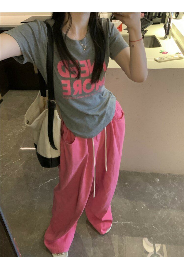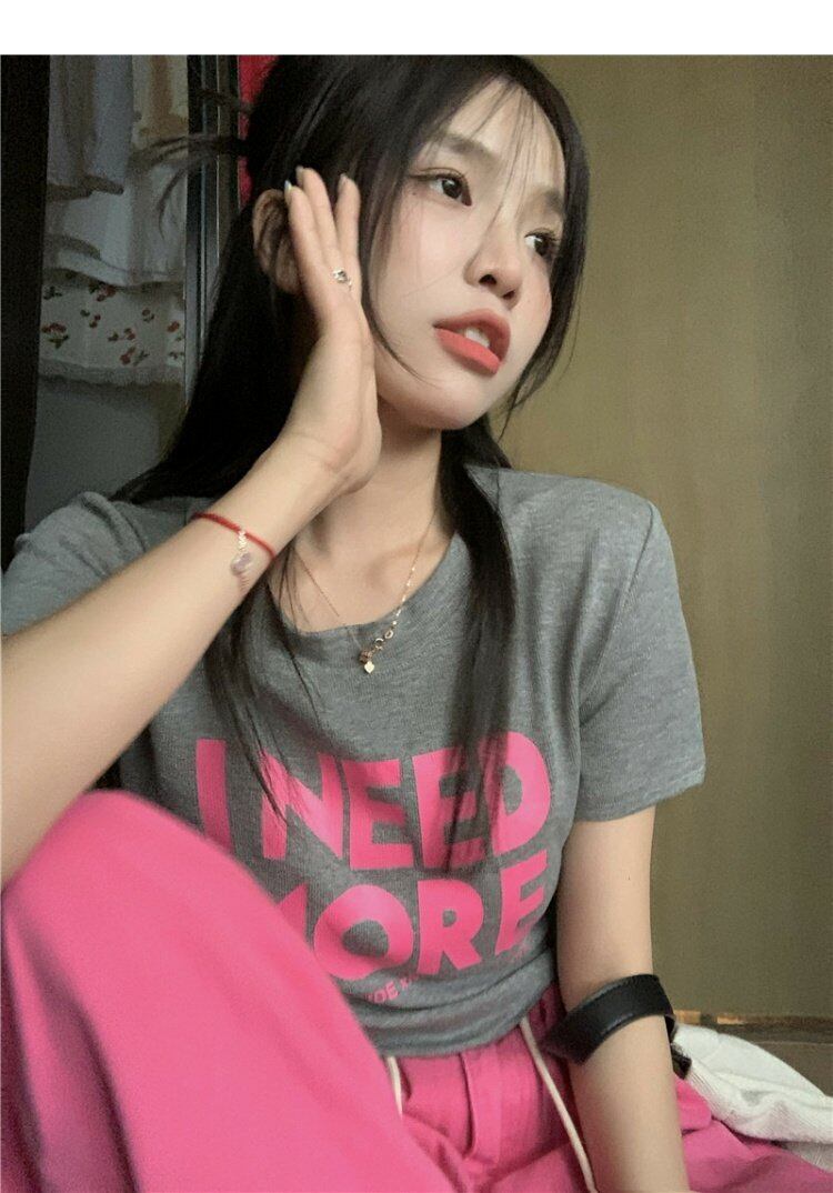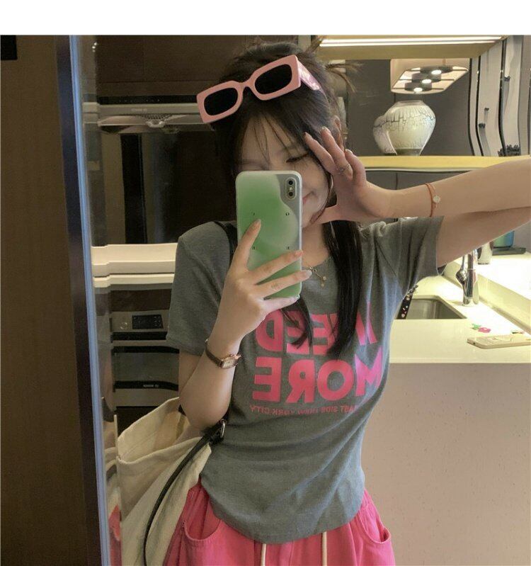 韓国ファッションプリント薄手グレーTシャツシャツ スタンダードゆったり夏服カジュアルトップス レトロ 夏物 スタイル MONROE79420320409