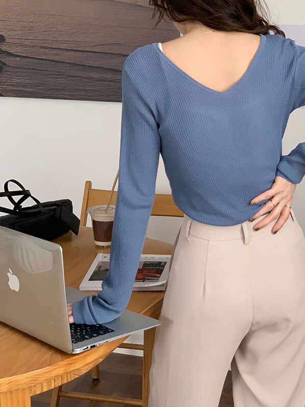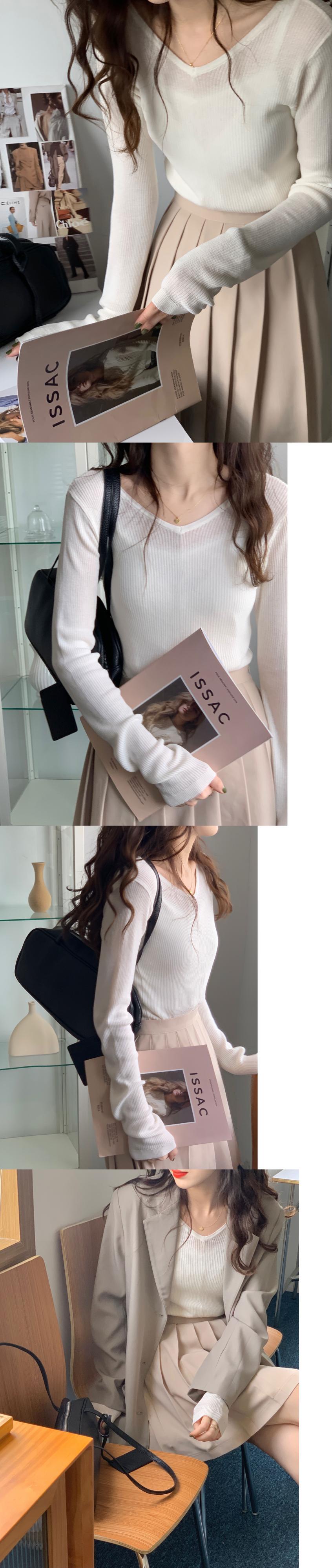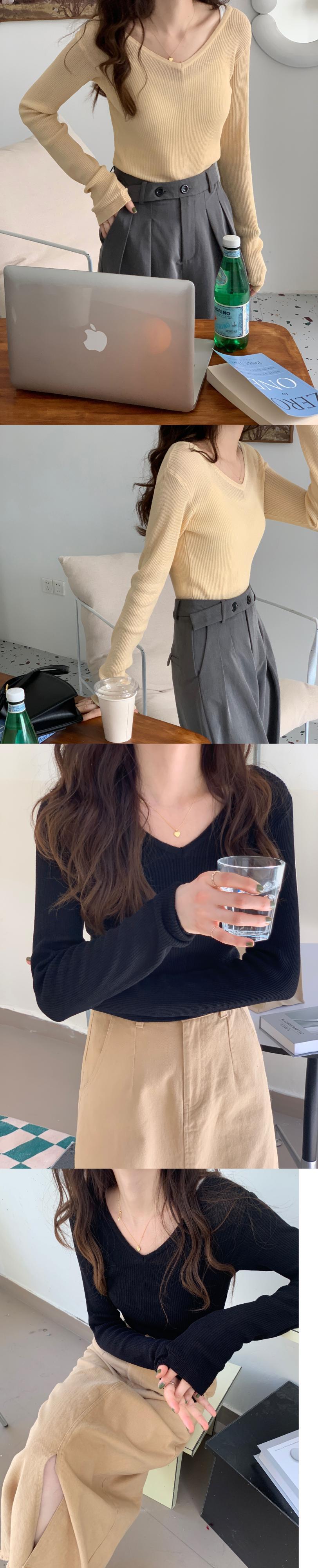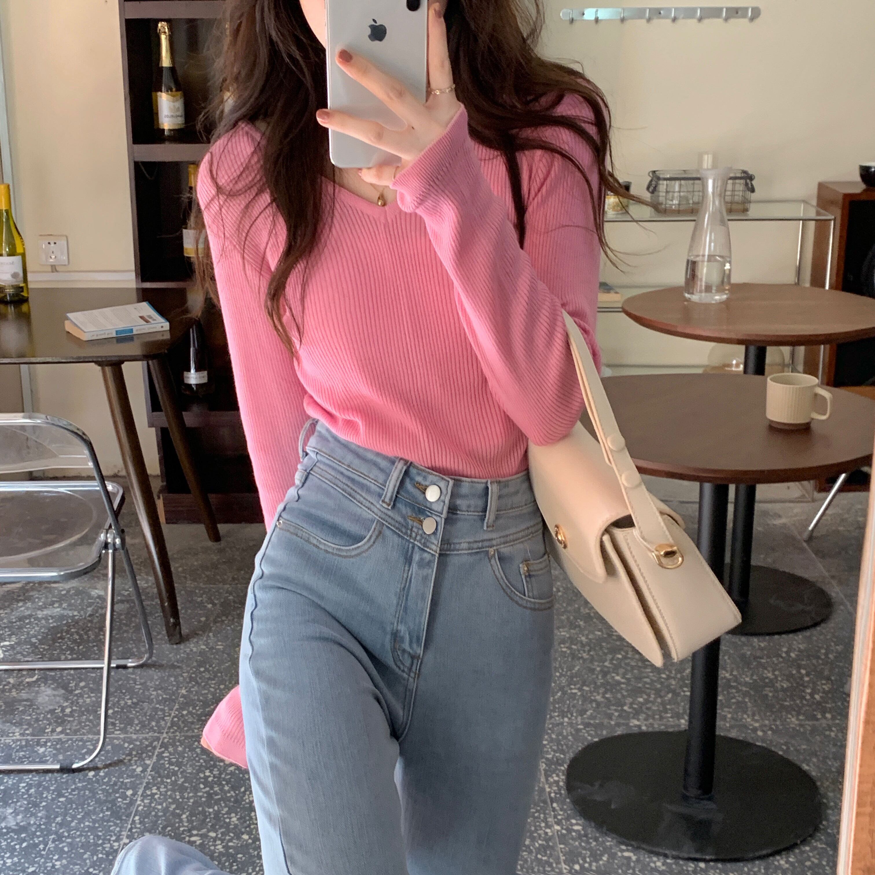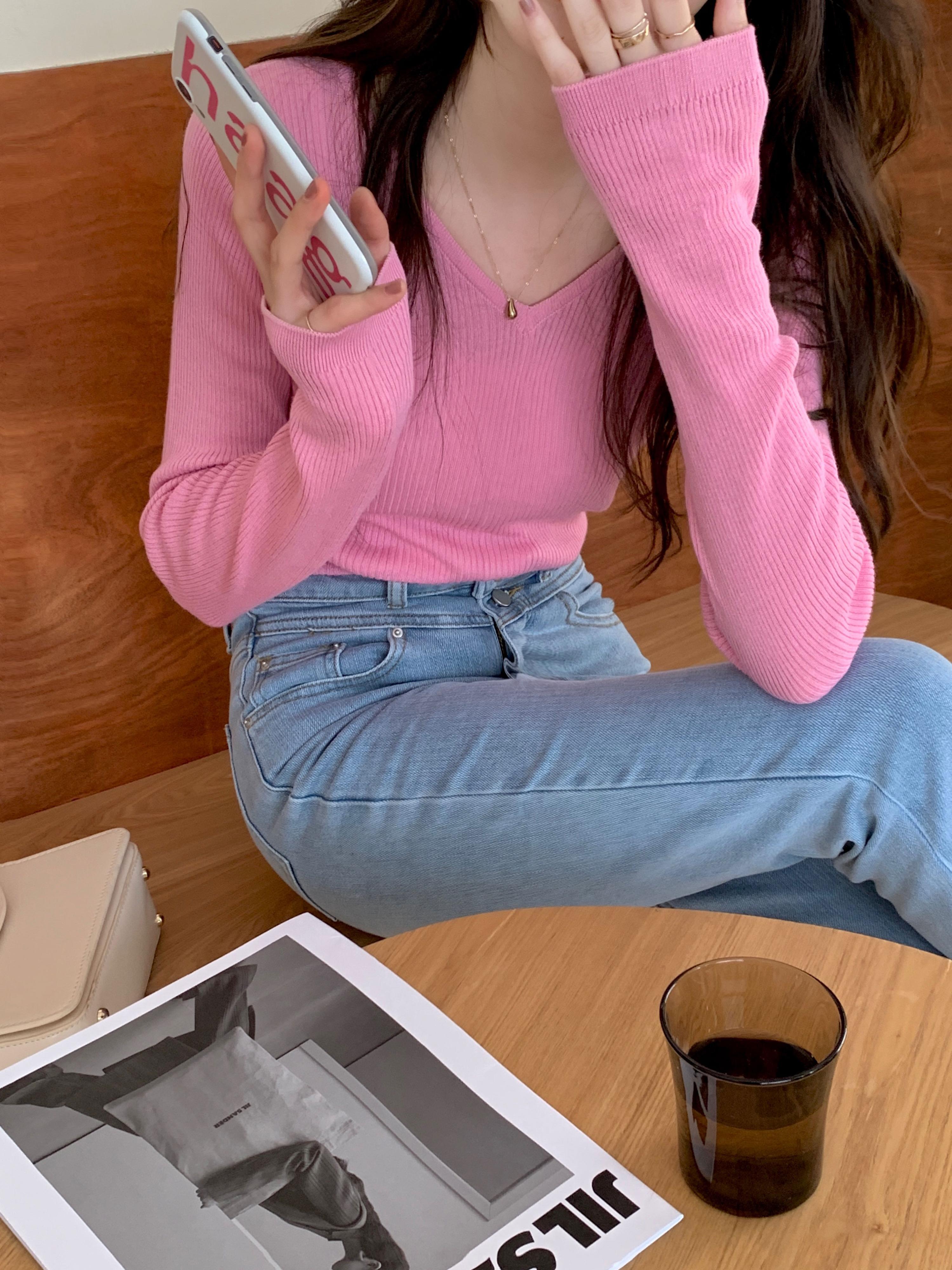 VネックTシャツシャツ 秋物韓国ファッションゆったりスタイルNEW ロング ピンク オータム 長袖 MONROE42579803937