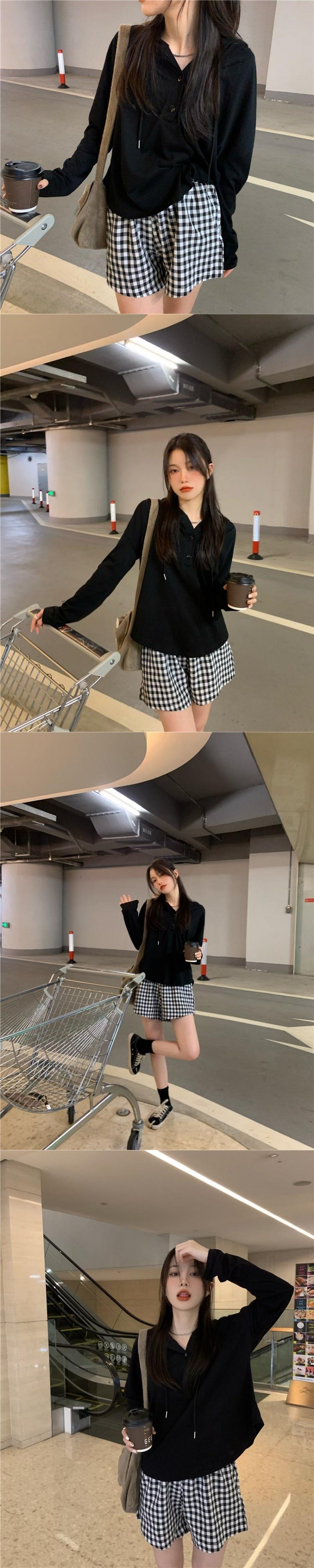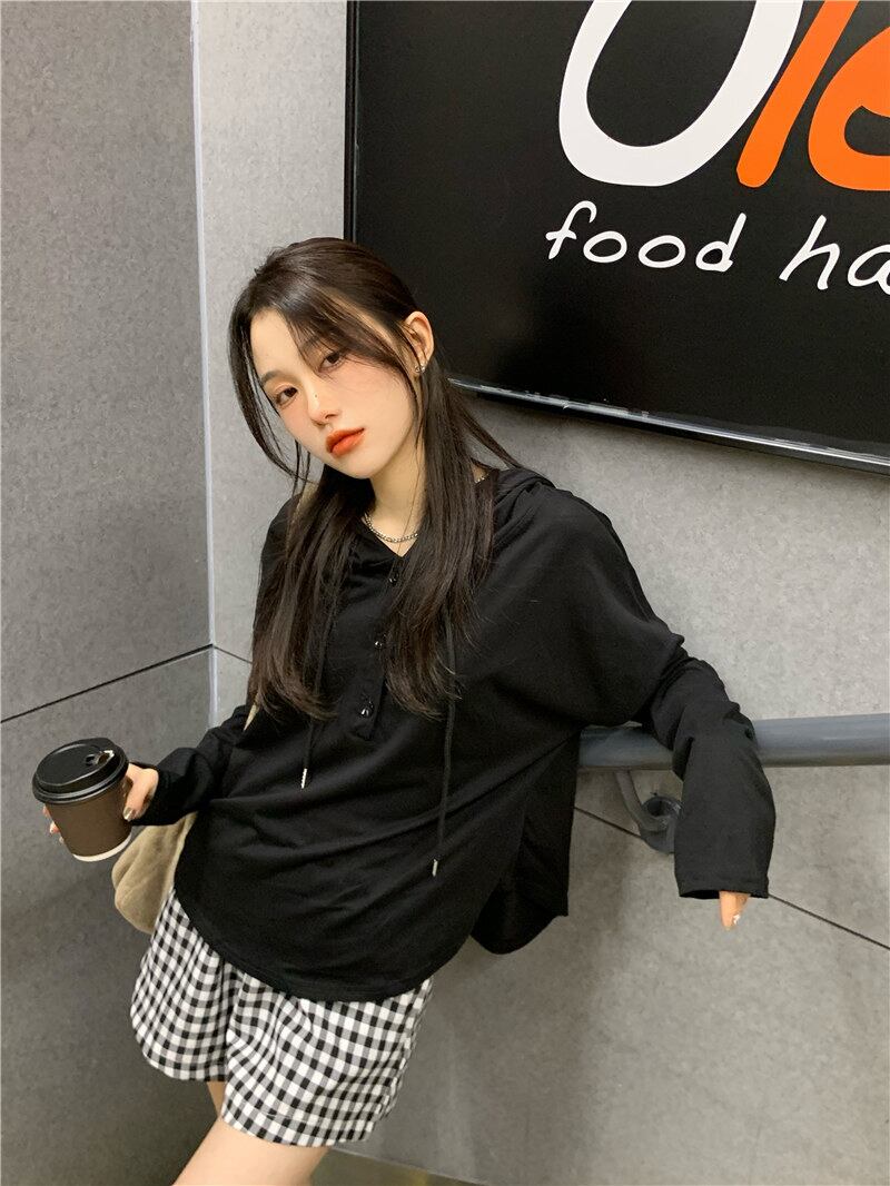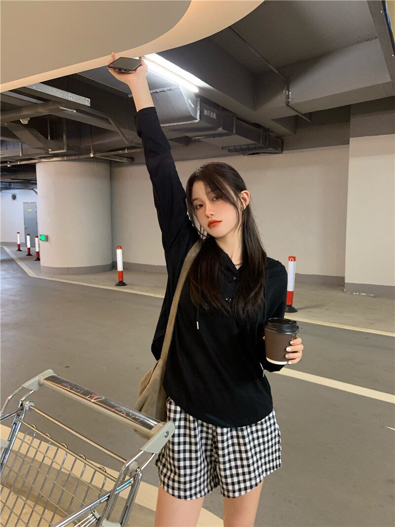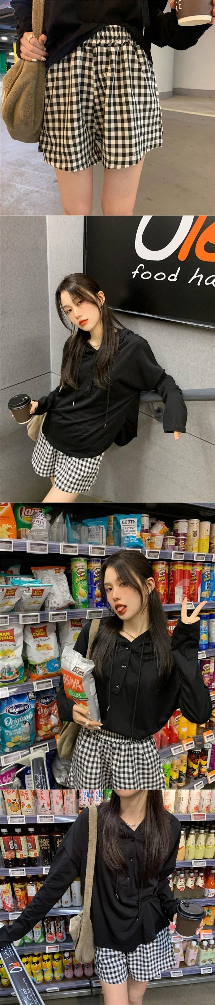 スプリング韓国ファッションカジュアルルーズフードギャザーTシャツ格子柄薄手ストレッチウェストショーツ ロング エラスティック 伸縮 春物 スタイル 長袖 ウエスト MONROE82776442647