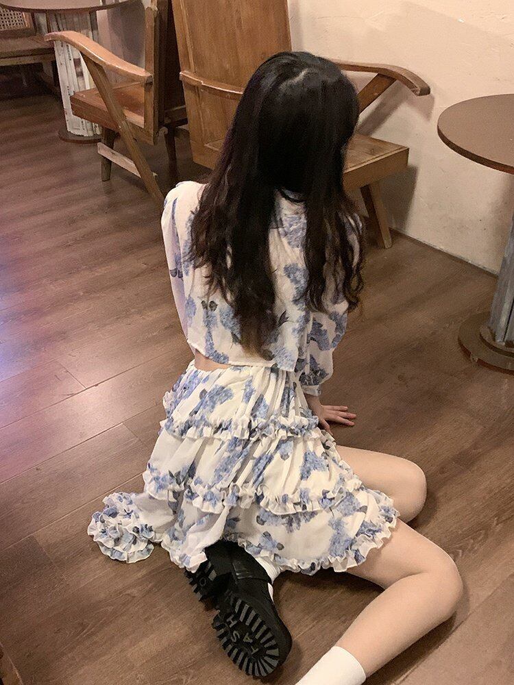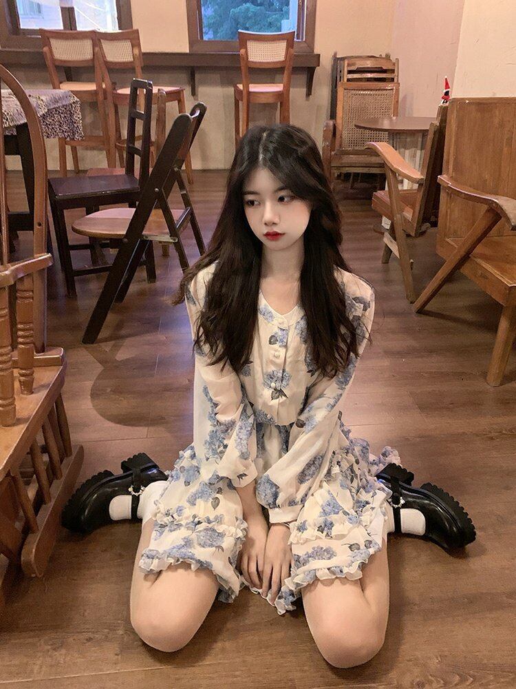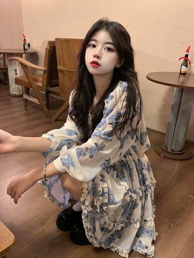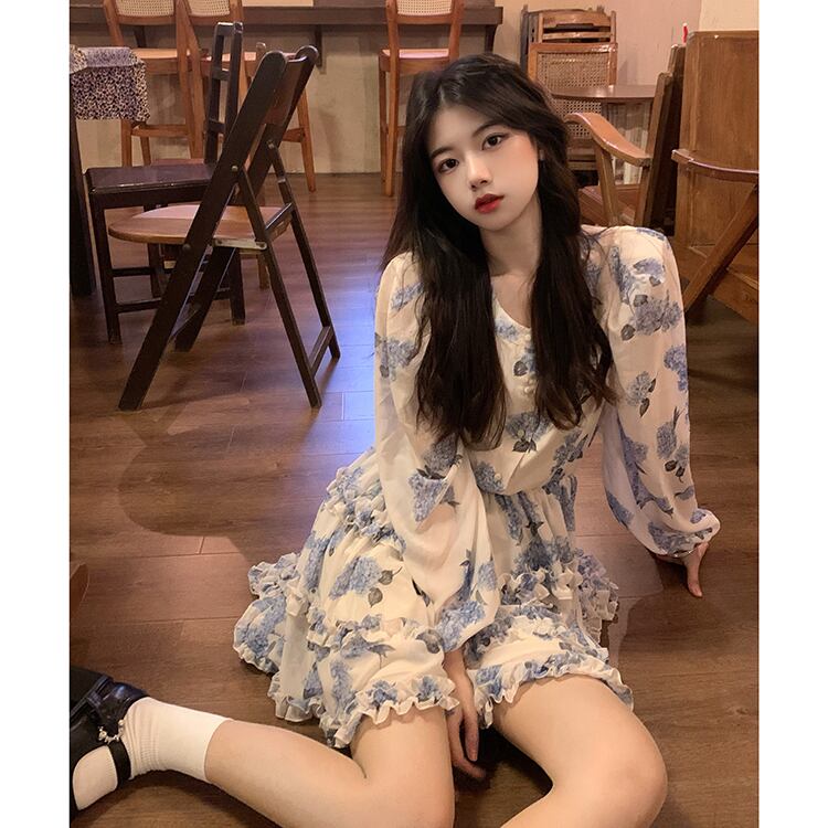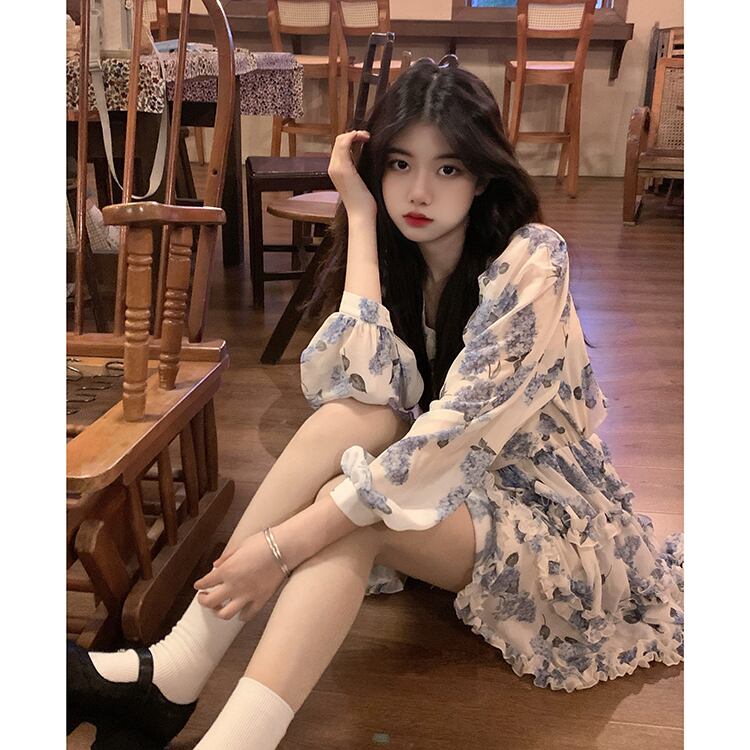 シフォンフローラルスカート スプリングウェスト長袖スリーブAラインワンピース ロング 春物 花柄 ウエスト MONROE92295207198