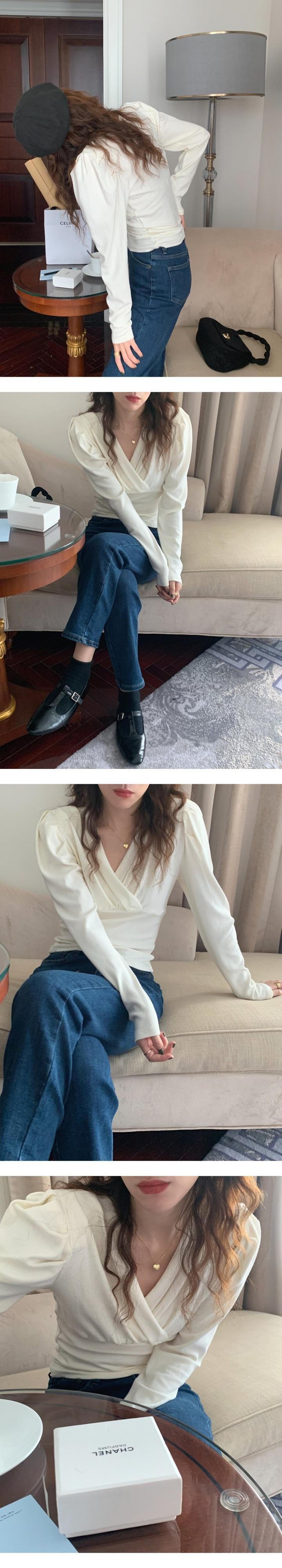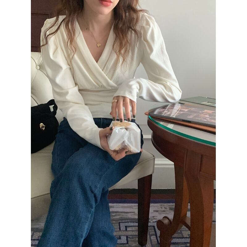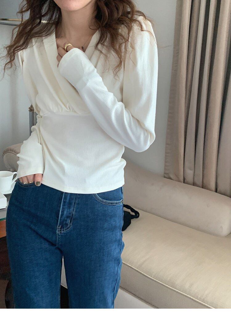 スリムクロスVネック薄手Tシャツシャツ 秋物韓国ファッションゆったりトップス ロング オータム スタイル 長袖 MONROE85908453204