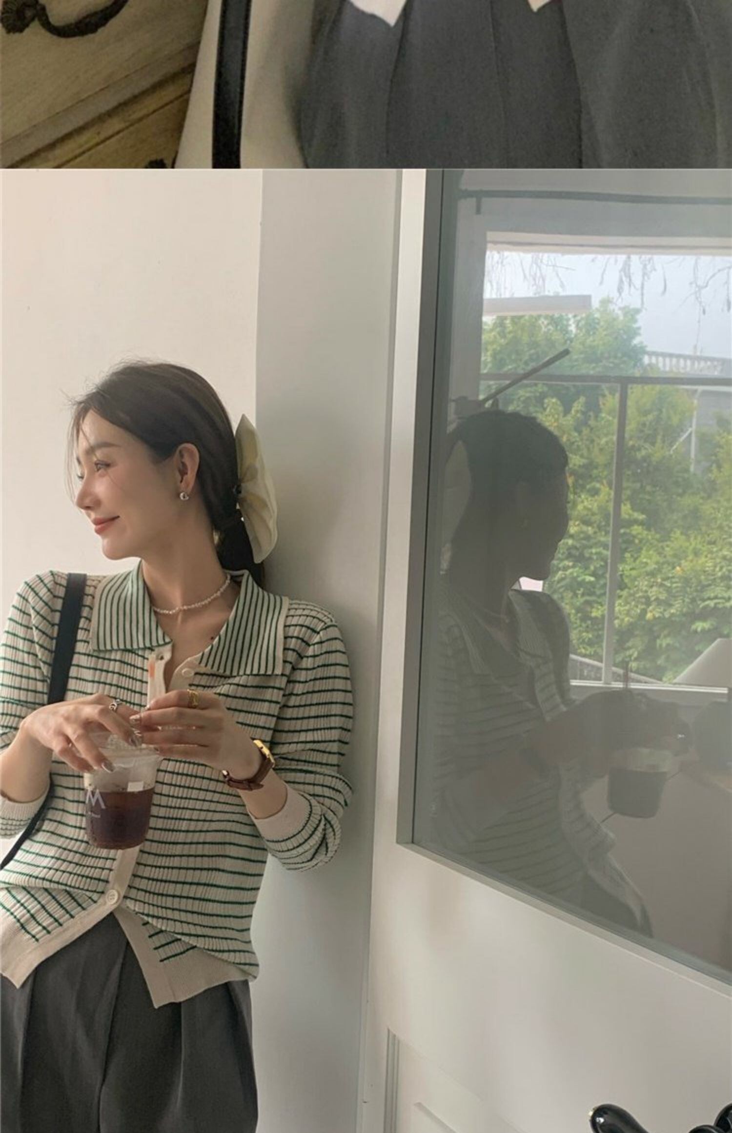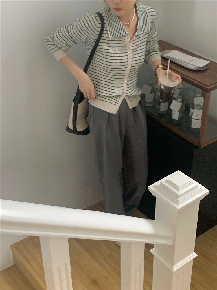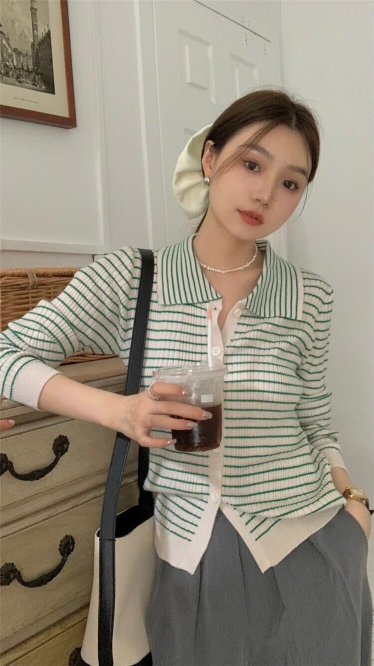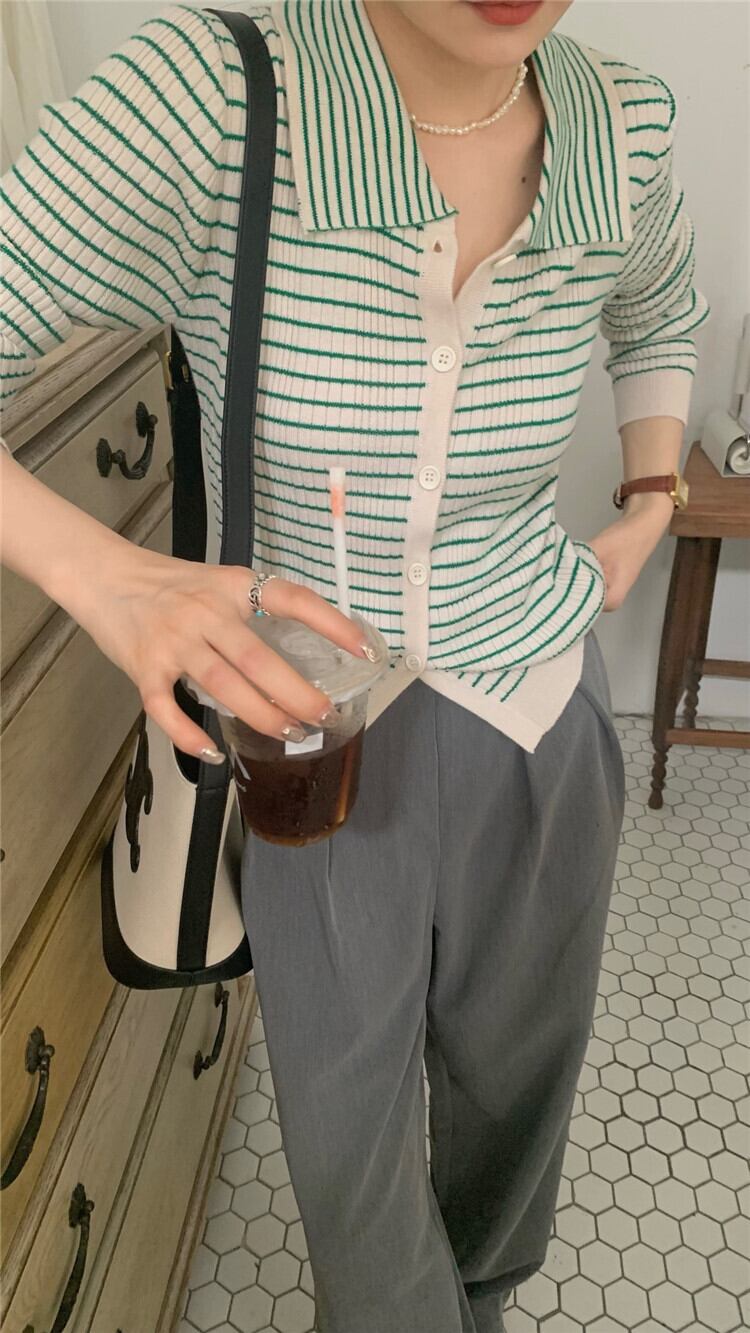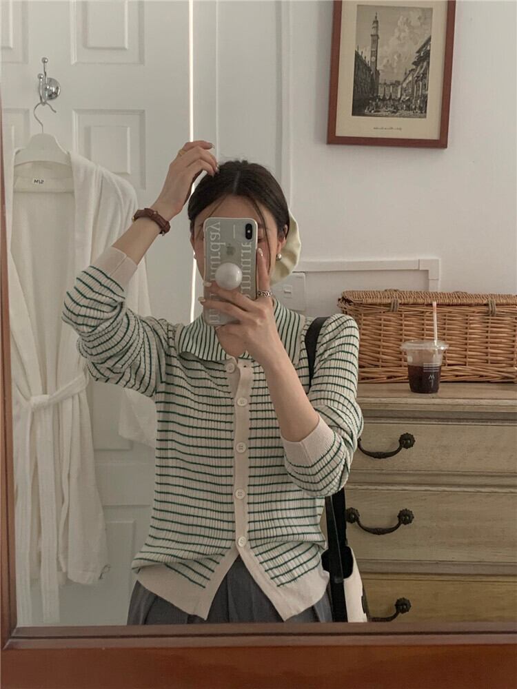 カラースタンダードストライプニットセーター 長袖スリーブトップス 夏服スタイルカーディガンショートジャケット ロング レトロ 夏物 MONROE71648694020