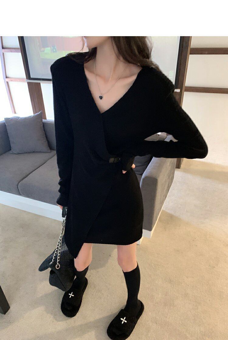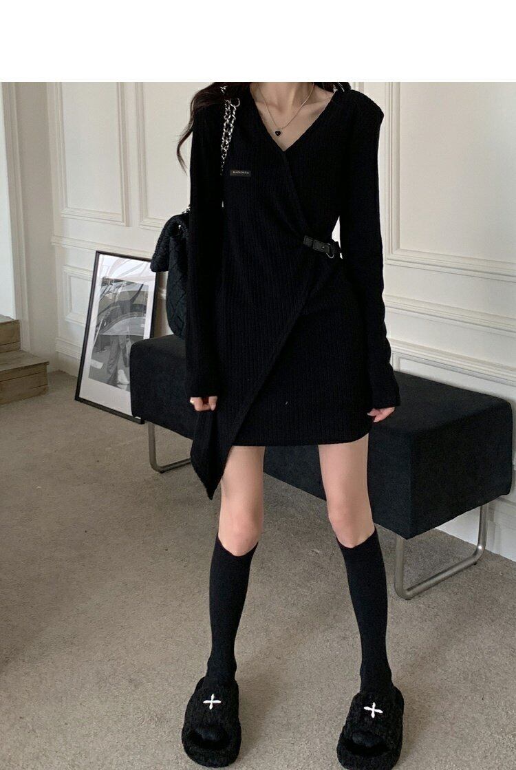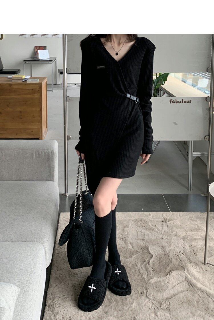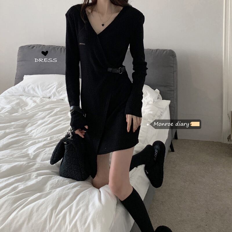 韓国ファッションブラックワンピーススプリング秋物Vネックスリムスカート ロング ストリート 春物 オータム スタイル 長袖 MONROE44434491608