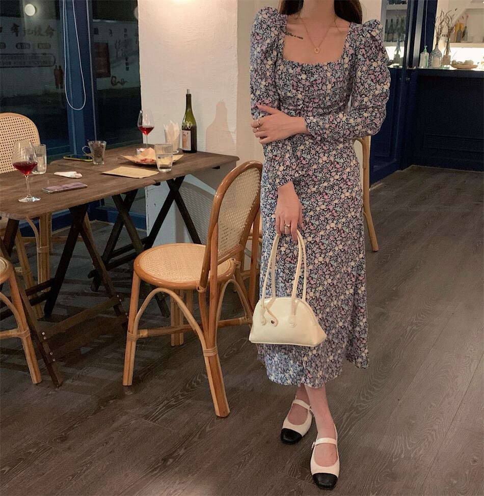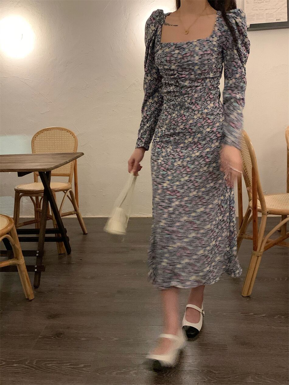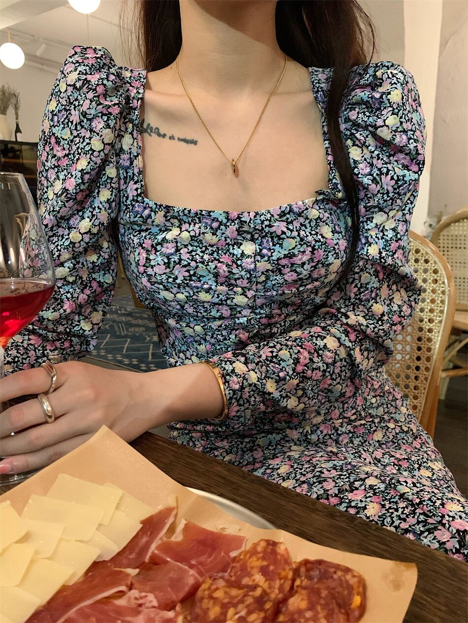 スプリング秋物カラーストラップ 薄手フローラルワンピース 春物 オータム 花柄 スクウェア MONROE12318654103