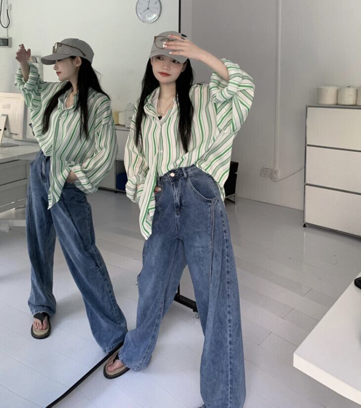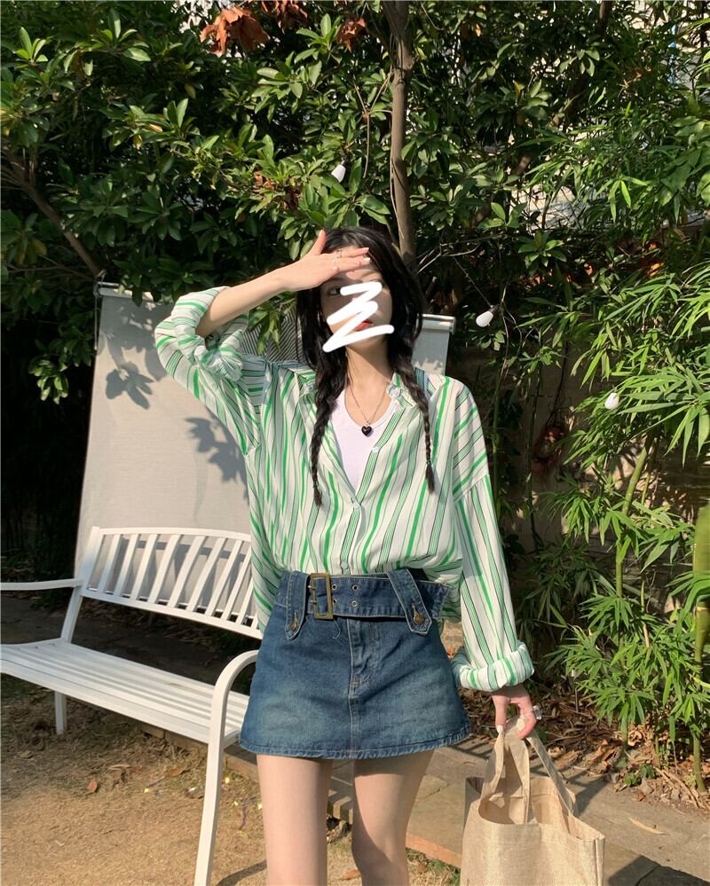 韓国ファッションストライプシャツ ブラウス ジャケット スプリングトップス 春物 スタイル ミドル丈 MONROE99113708175