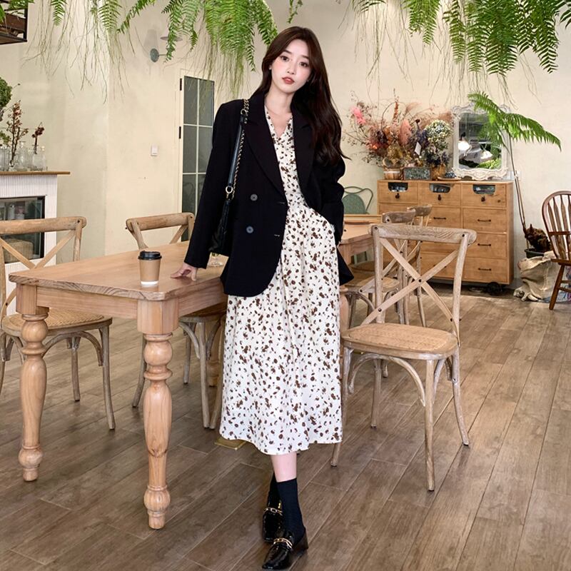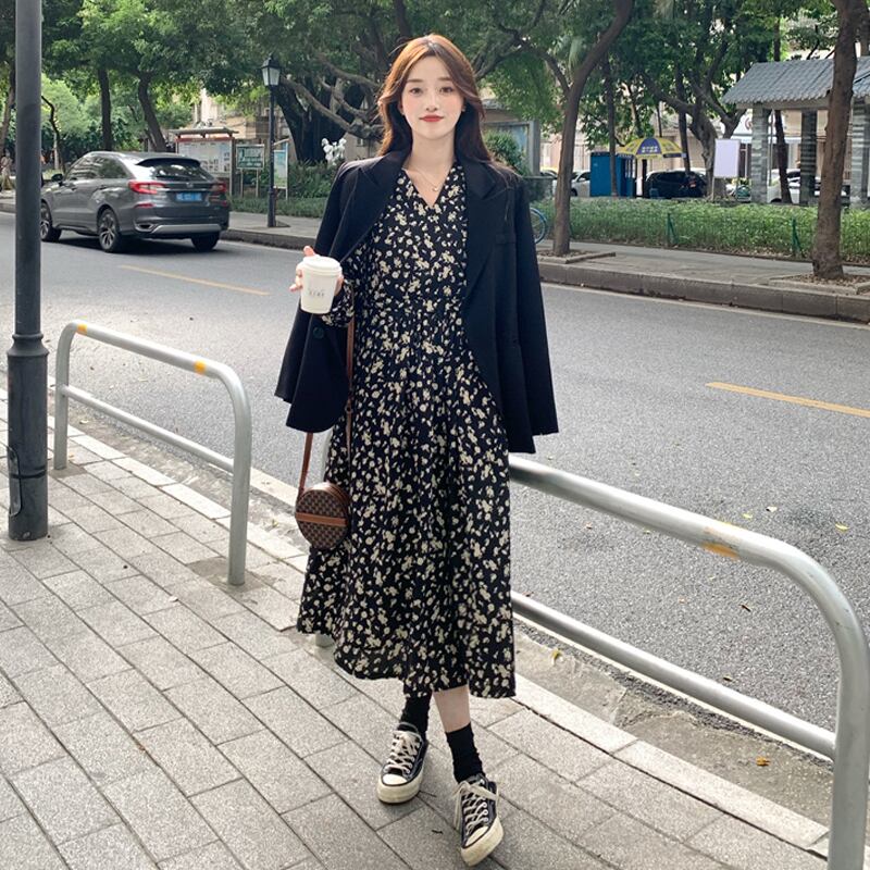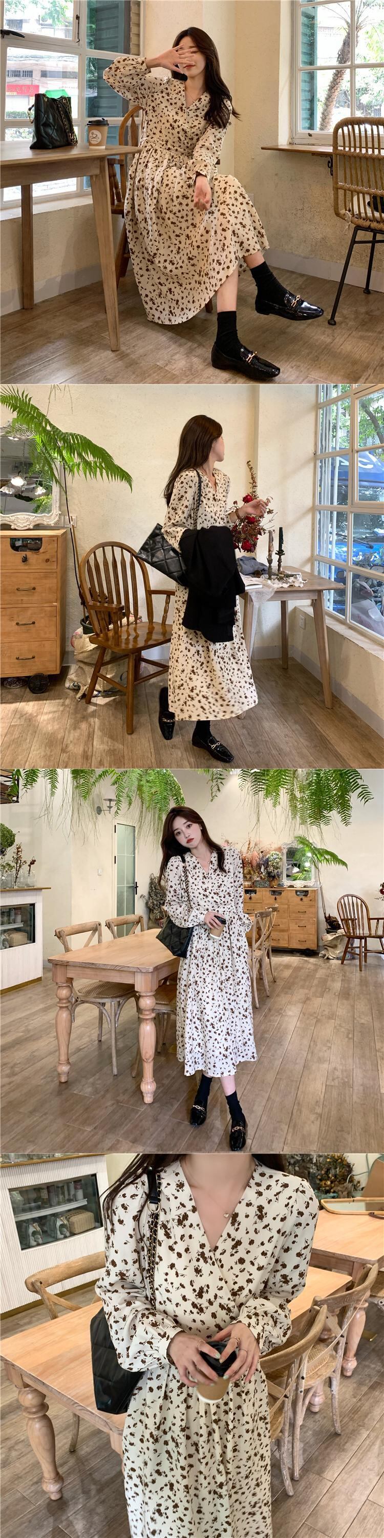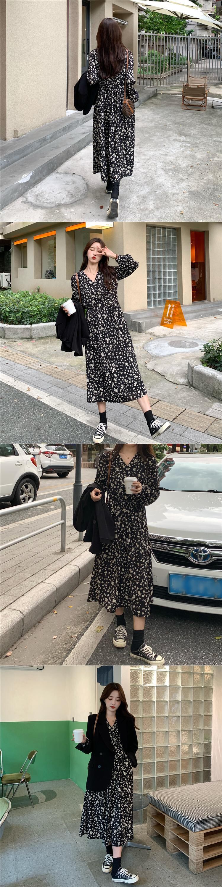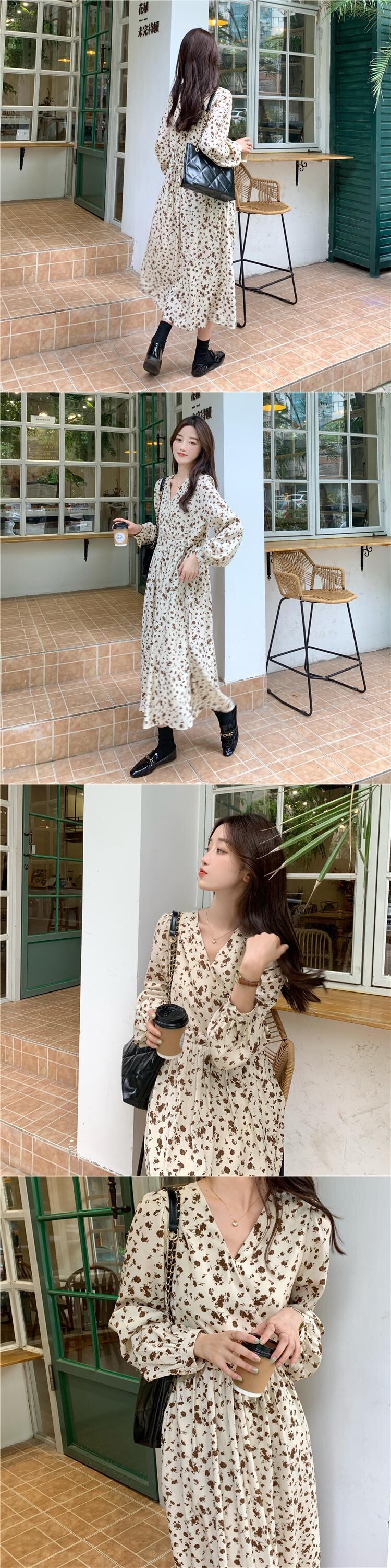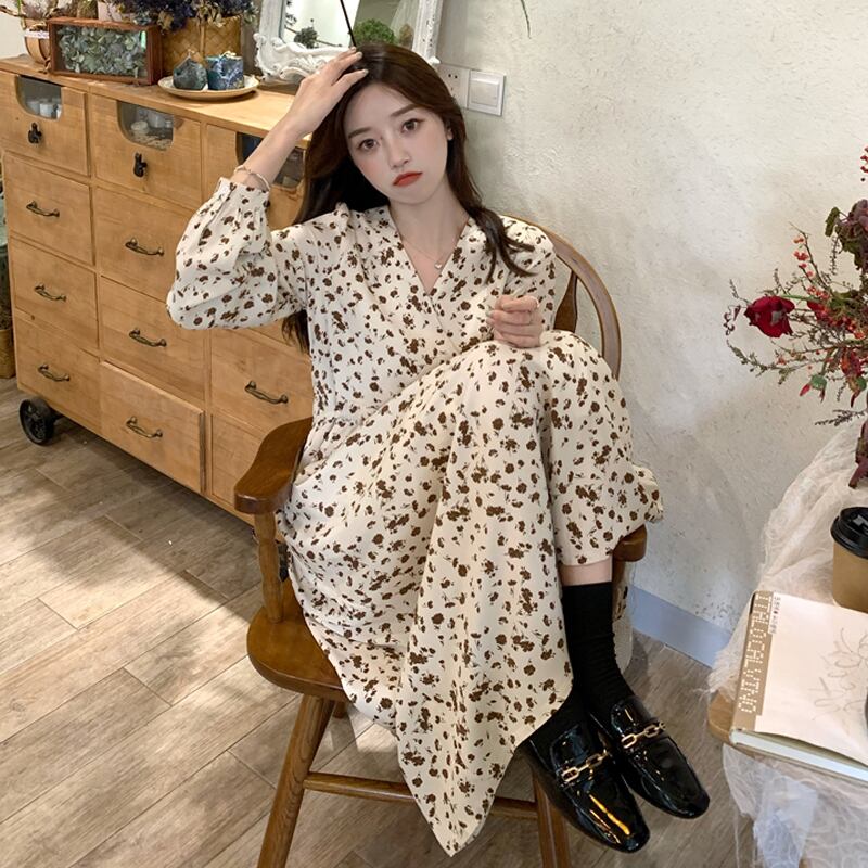 Vネックフローラルワンピーススプリングスタイルロングスカート 大人ガーリー スウィート キュート カジュアル 春物 花柄 SYJ54431537431