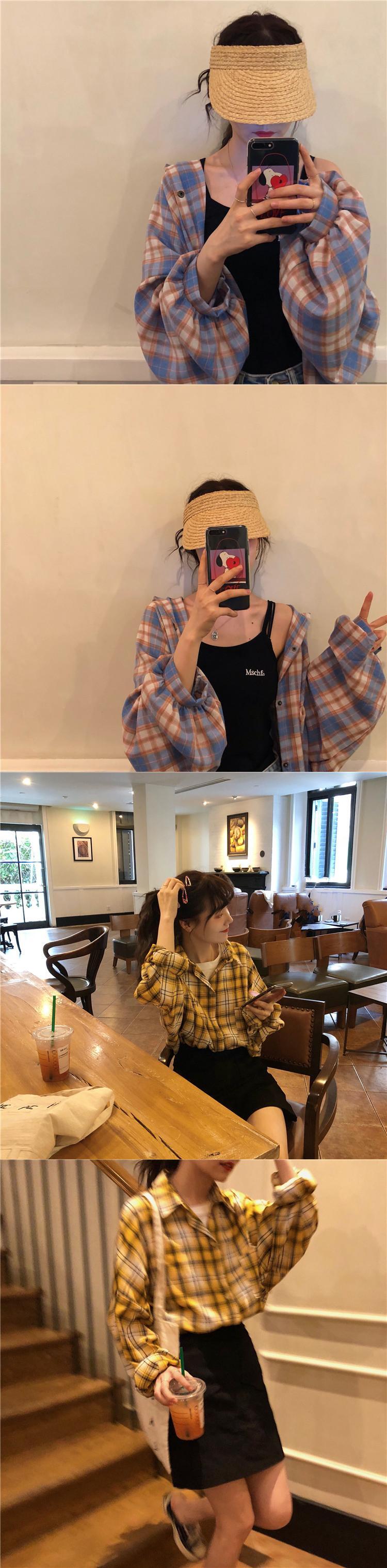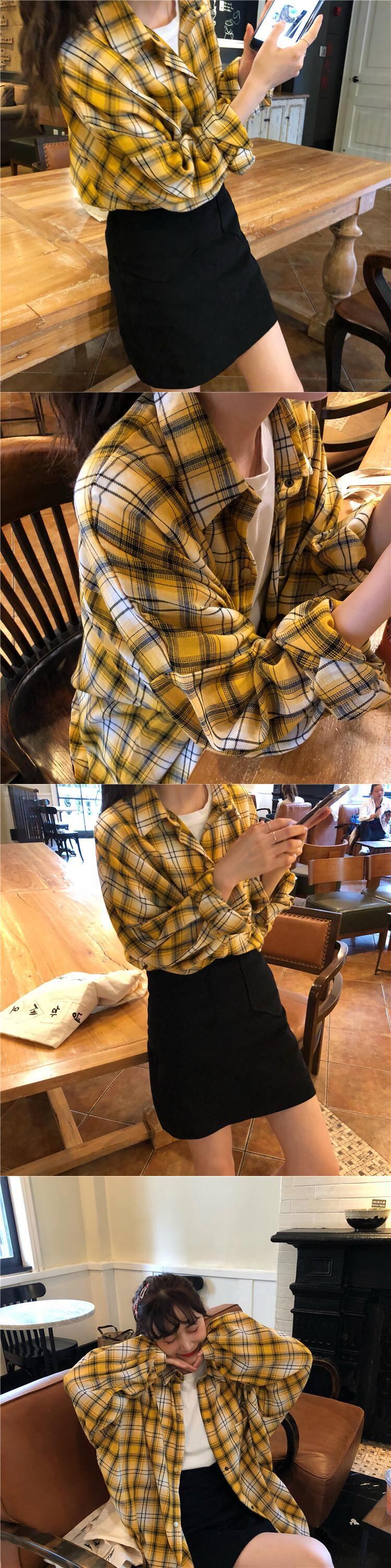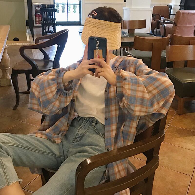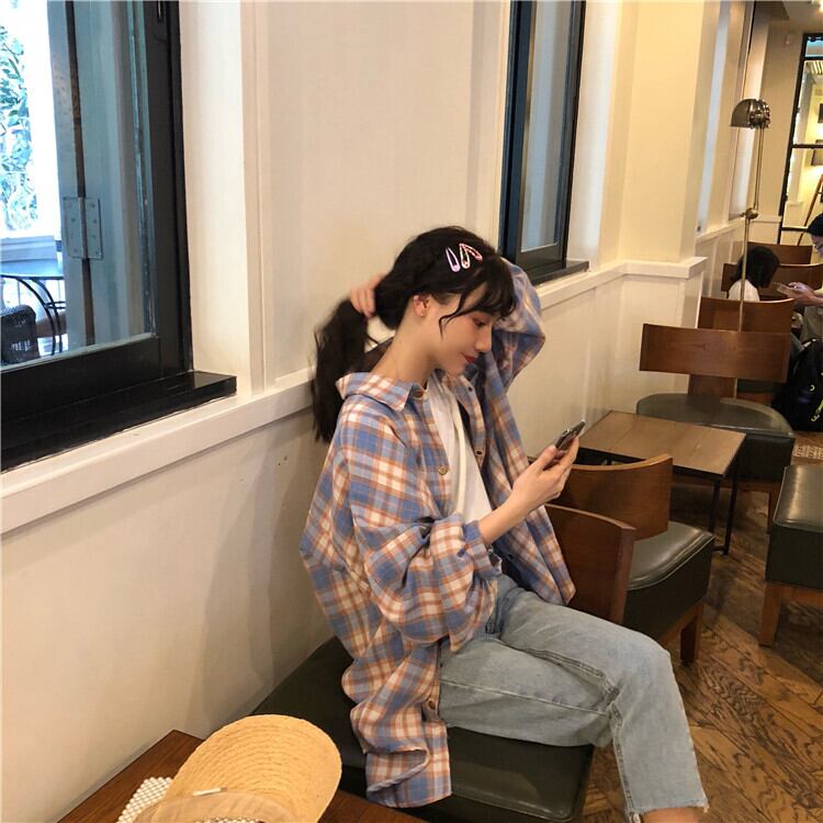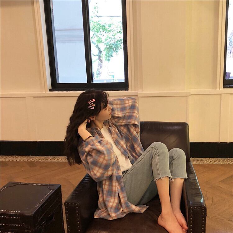 格子柄長袖スリーブシャツ ジャケット スプリングルーズトップス ロング 春物 パープル SYJ88474109764