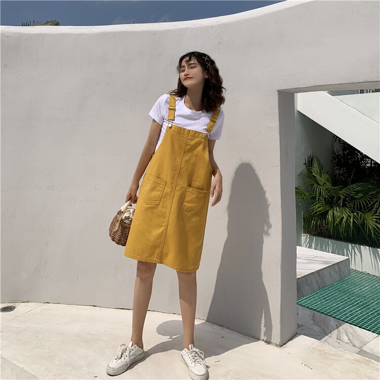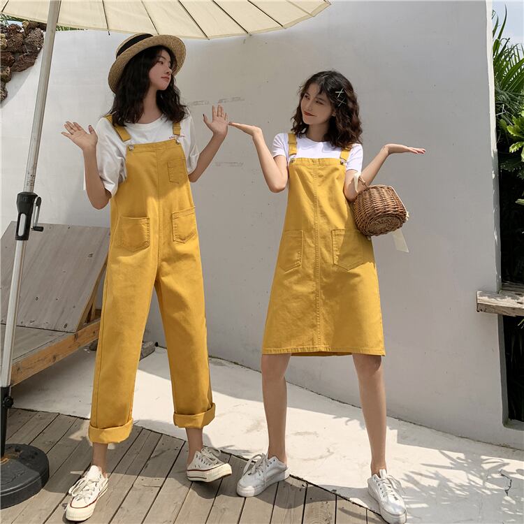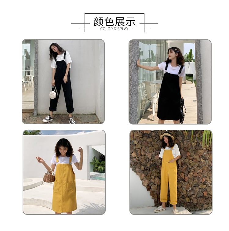 色:黄色のオーバーオール1枚,黒よだれかけシングルピース,ブラックストラップドレスワンピース,黄色のストラップドレスワンピース