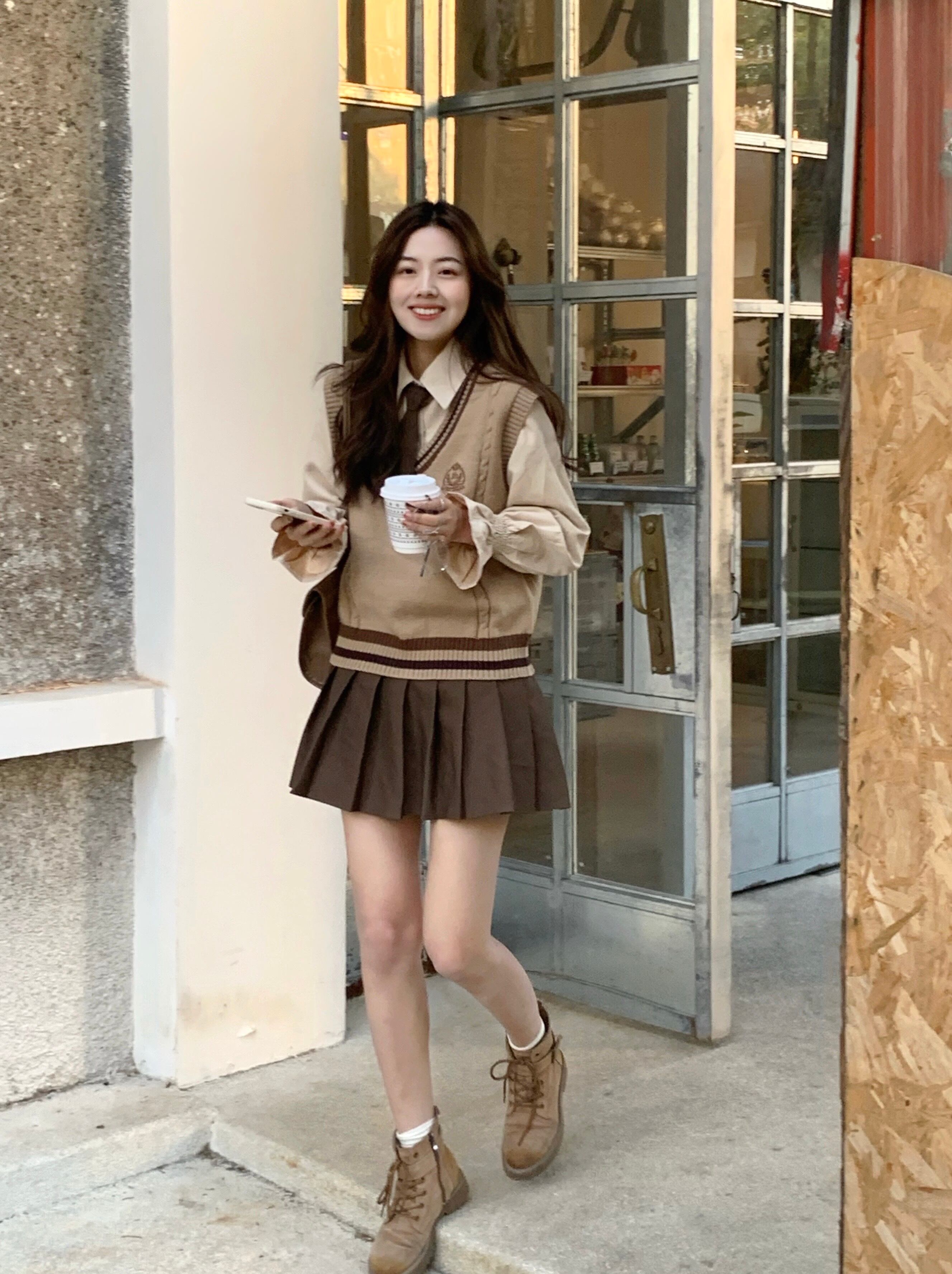 色:カーキベストワンピース,カーキシャツ+ネクタイ