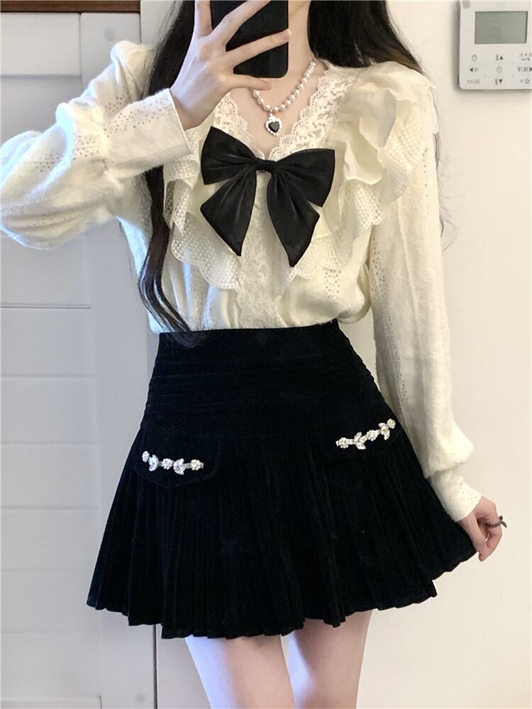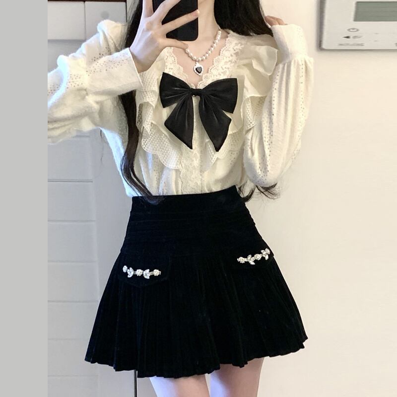 リボンVネックシャツ スプリングトップス ロング 大人ガーリー スウィート キュート カジュアル 春物 長袖 SYJ19163552888