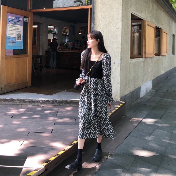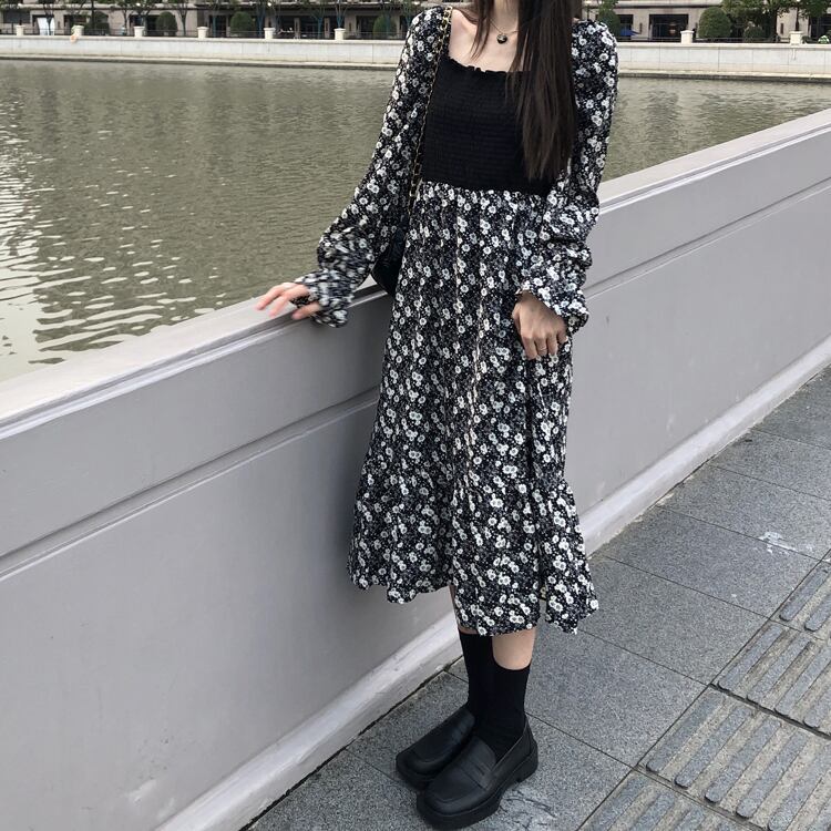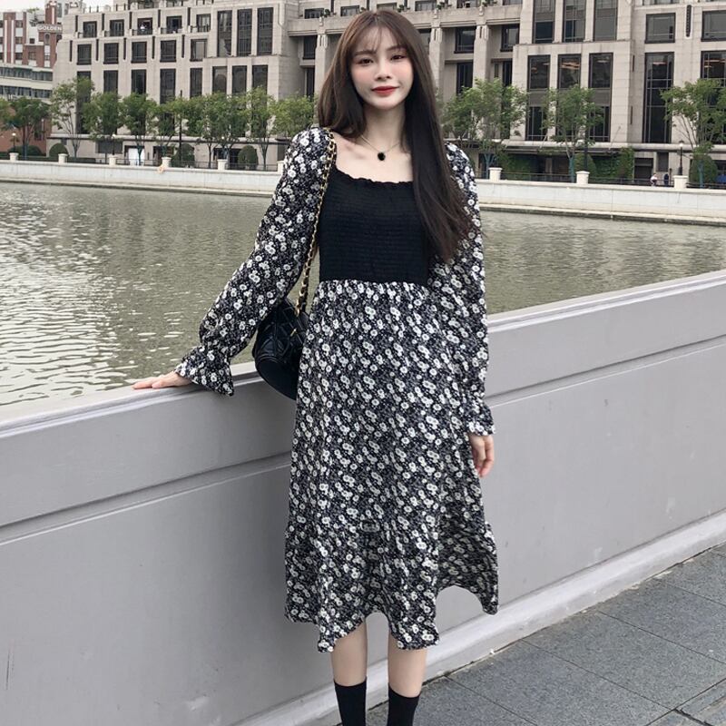 ロングフローラルシフォンワンピーススプリング秋物スタンダードウェストスカート レトロ 春物 オータム 花柄 長袖 ウエスト SYJ20018691641