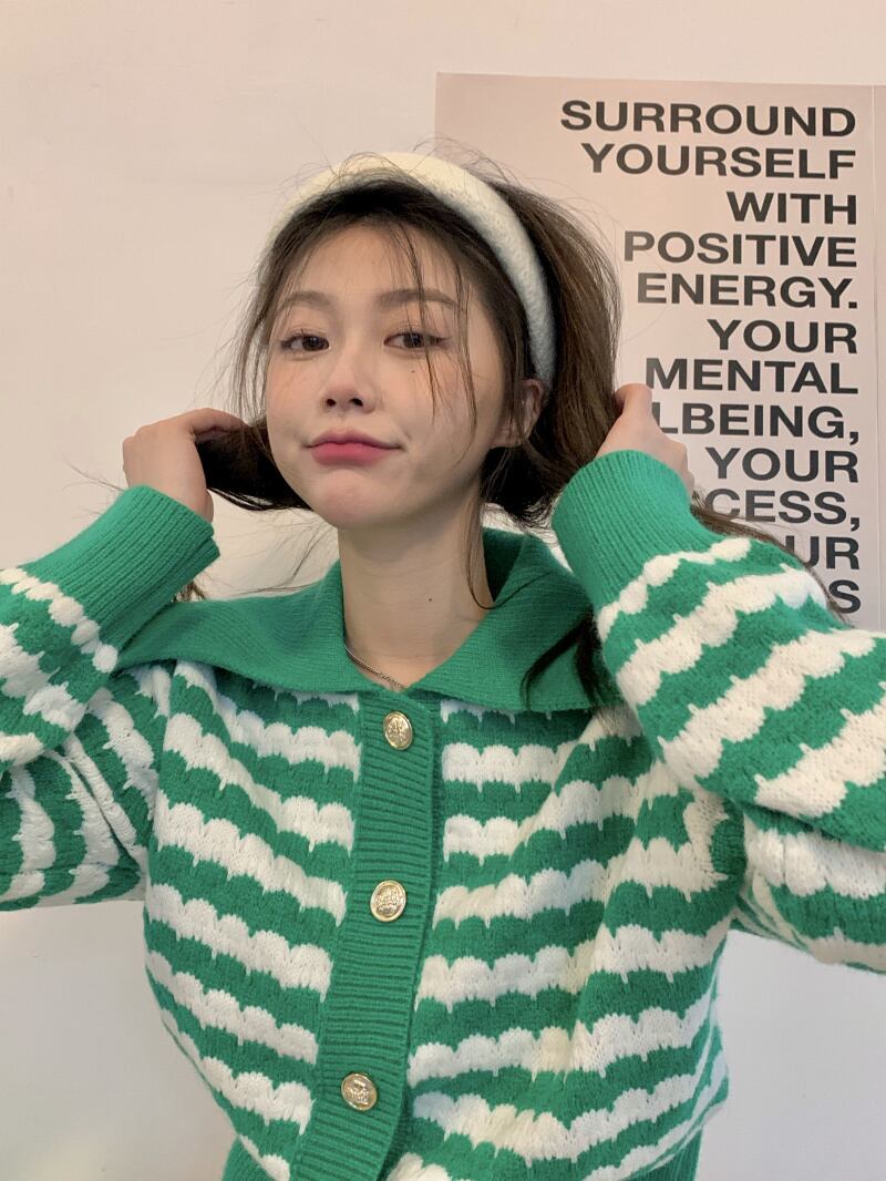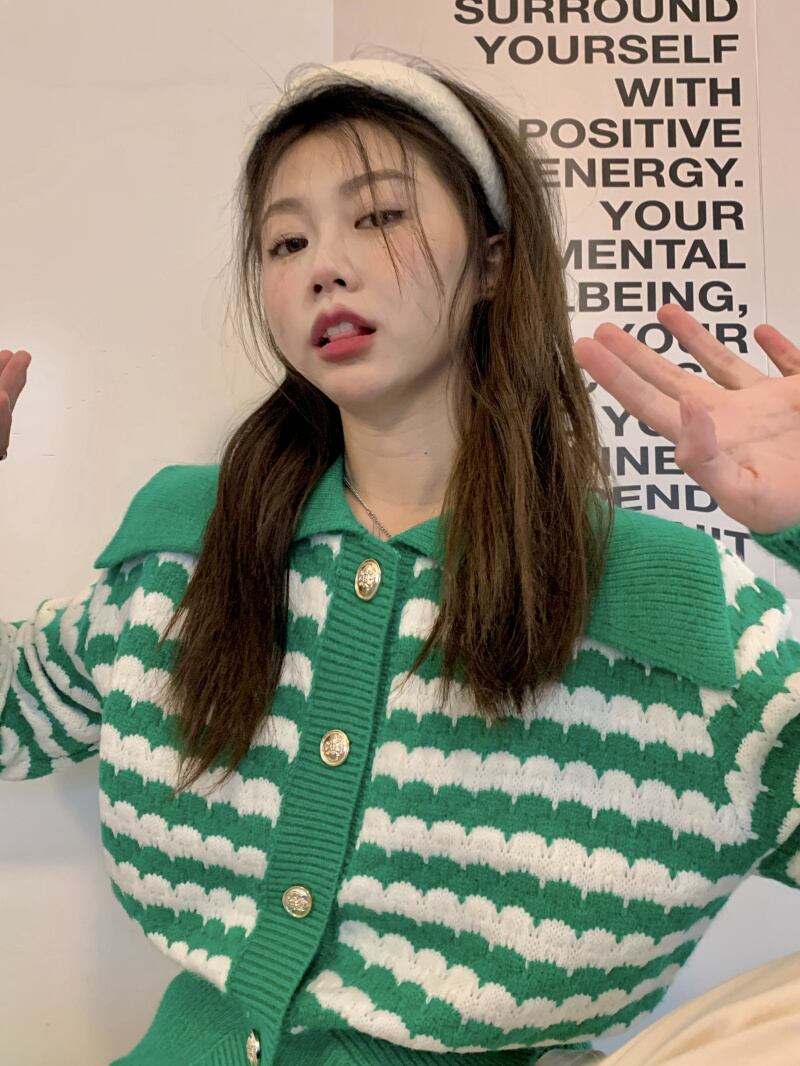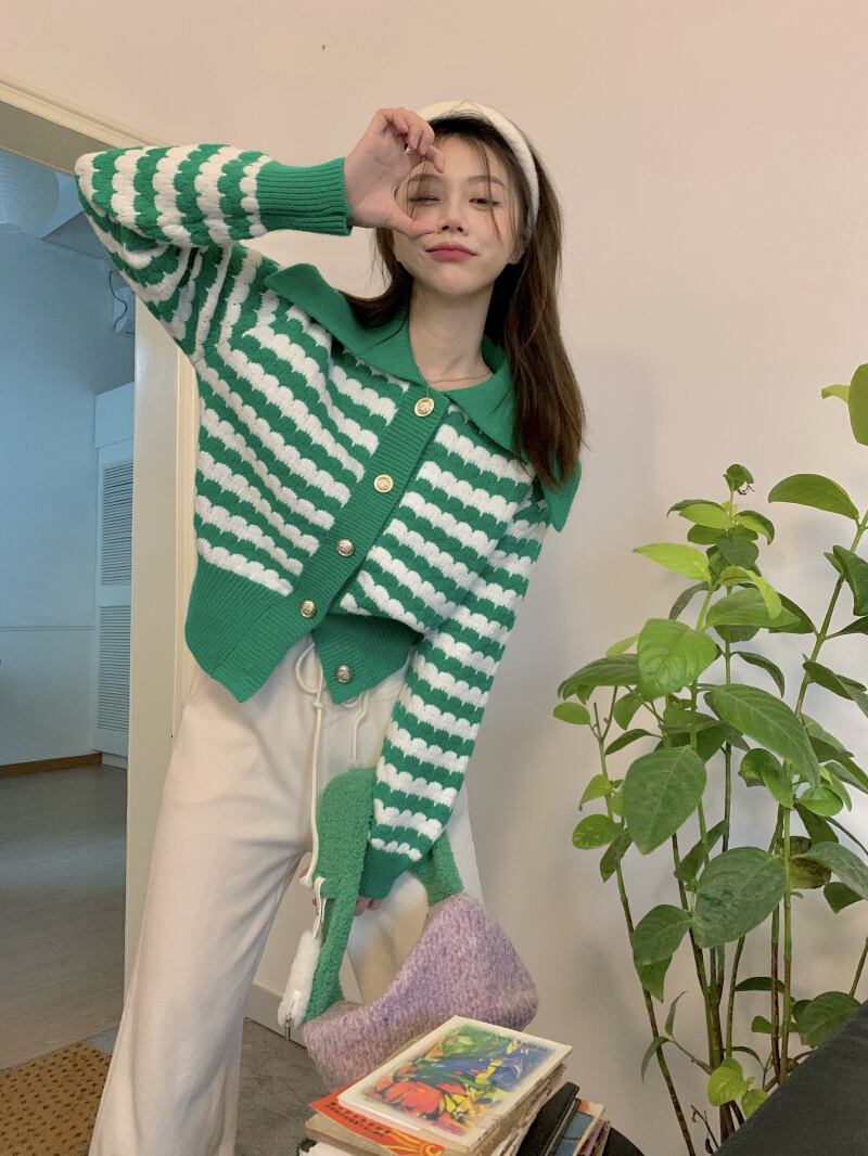 グリーンホワイトストライプセーター コート レディーススプリング秋物スタンダードニットカーディガン レトロ 春物 オータム SYJ13861138921
