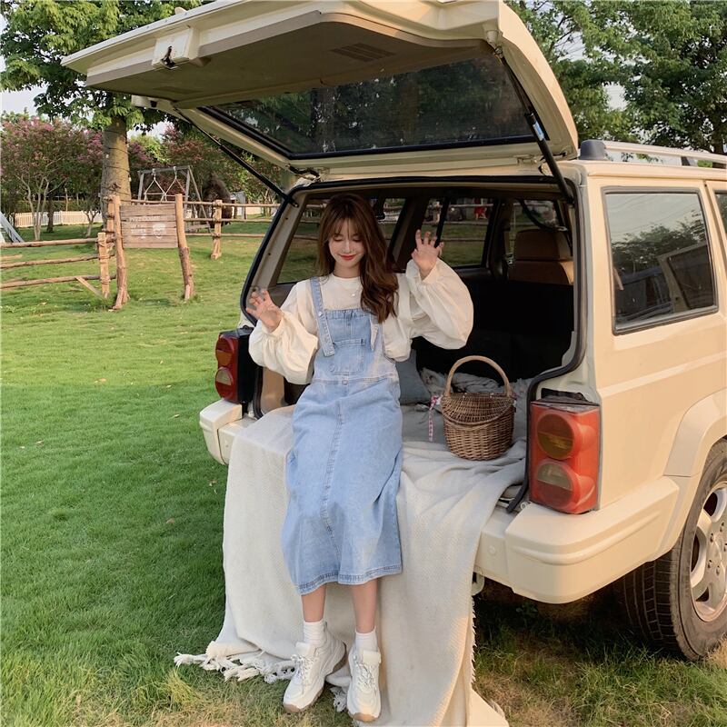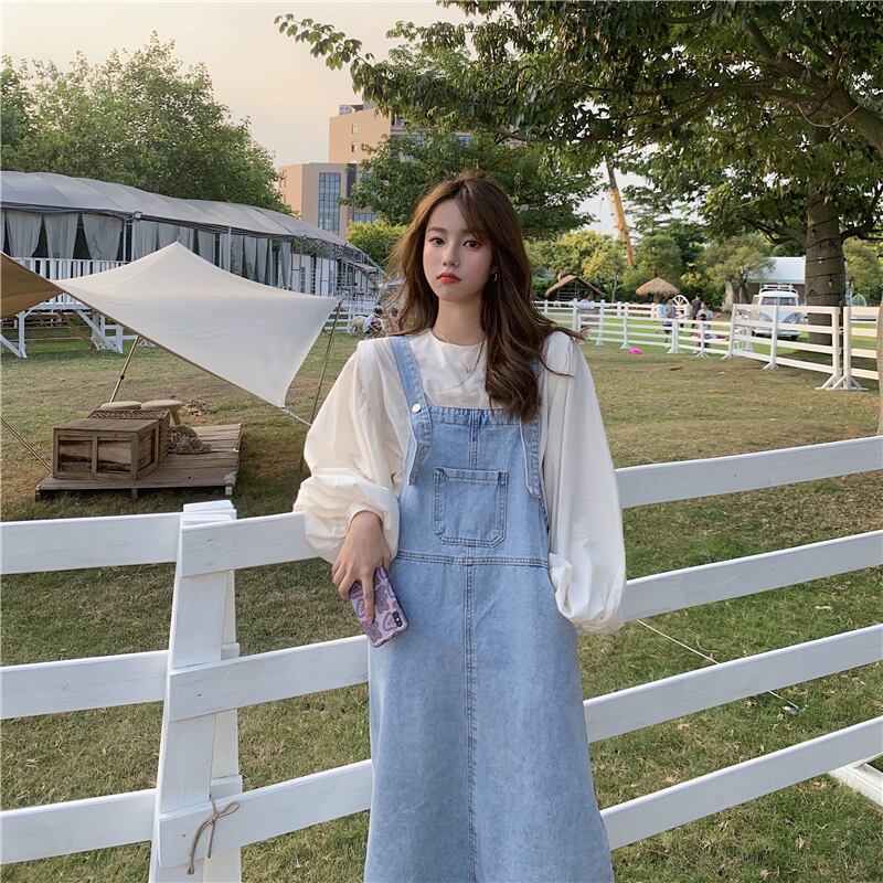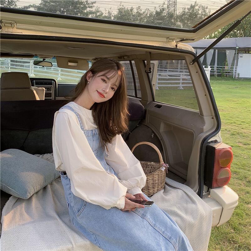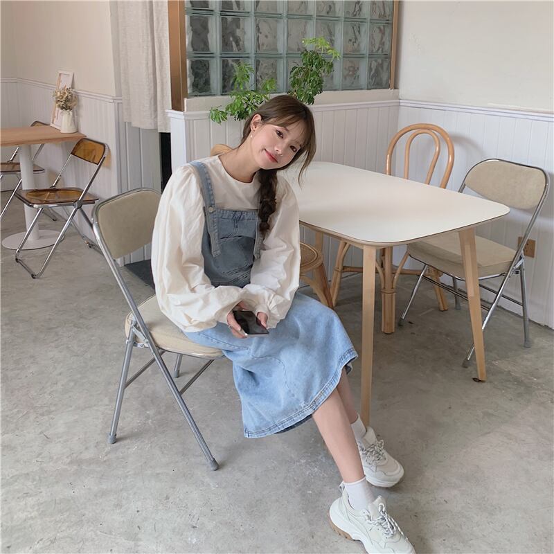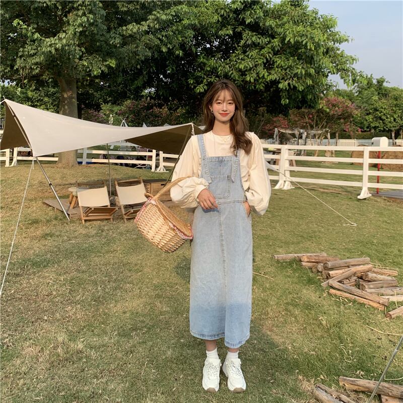 色:ワンピースアプリコットシャツ,デニムサスペンダースカートワンピース