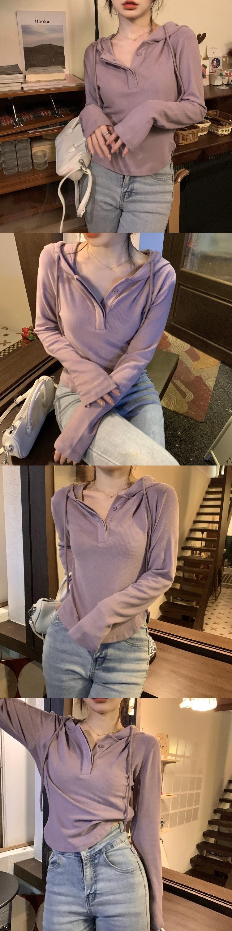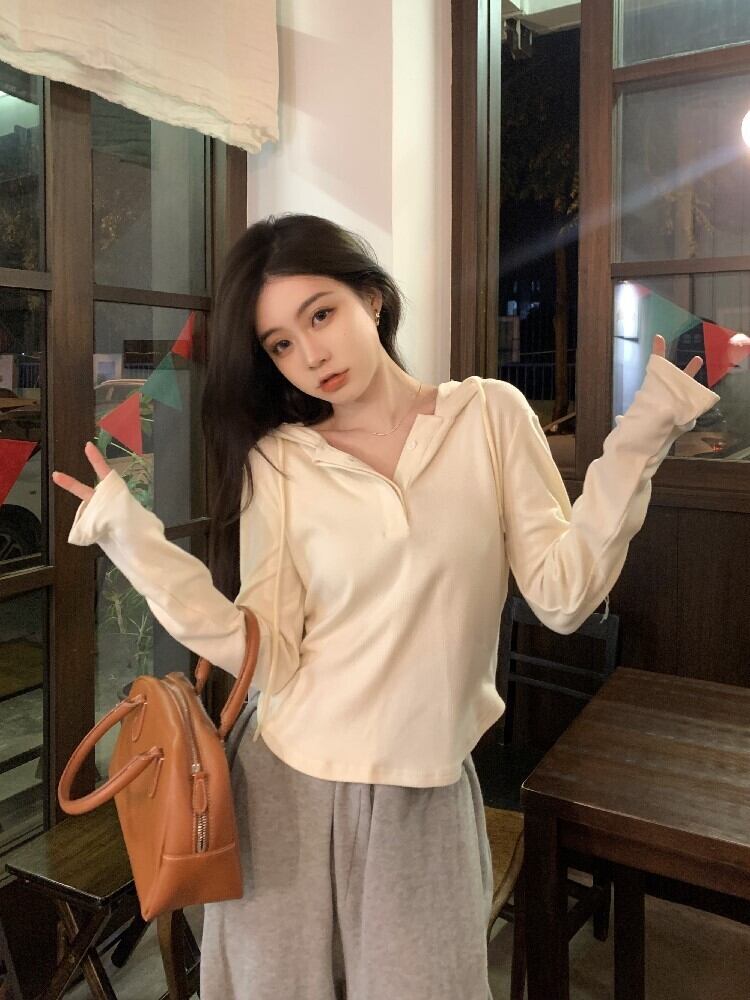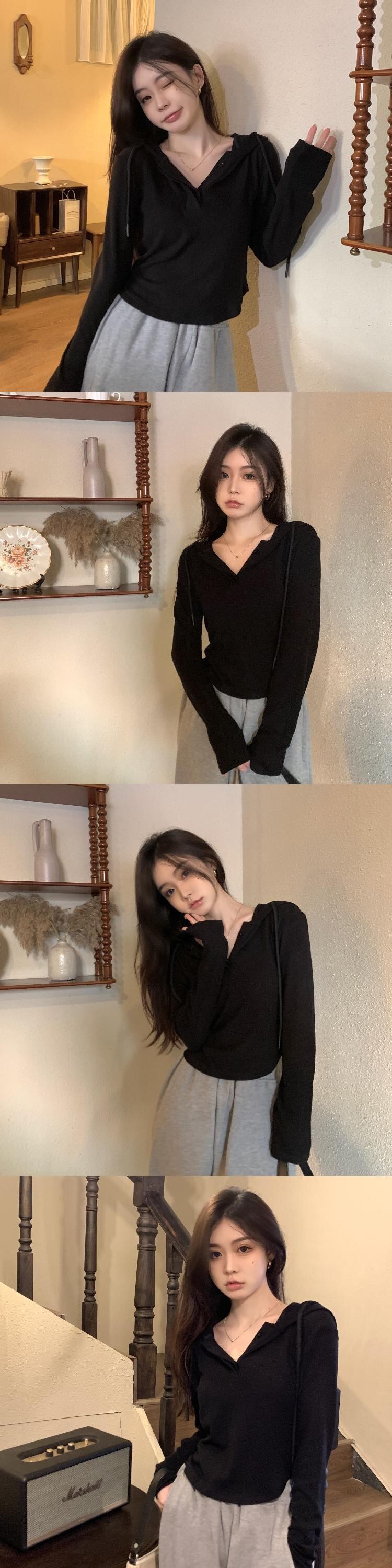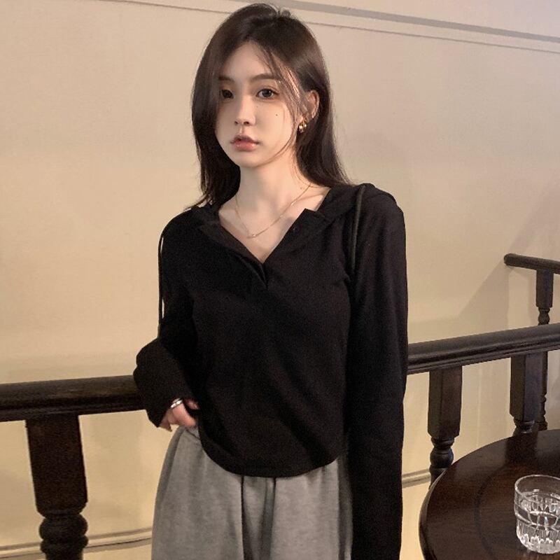 ショートトップス スプリング韓国ファッションブラックフードTシャツNEW ロング 春物 長袖 SYJ71483508980