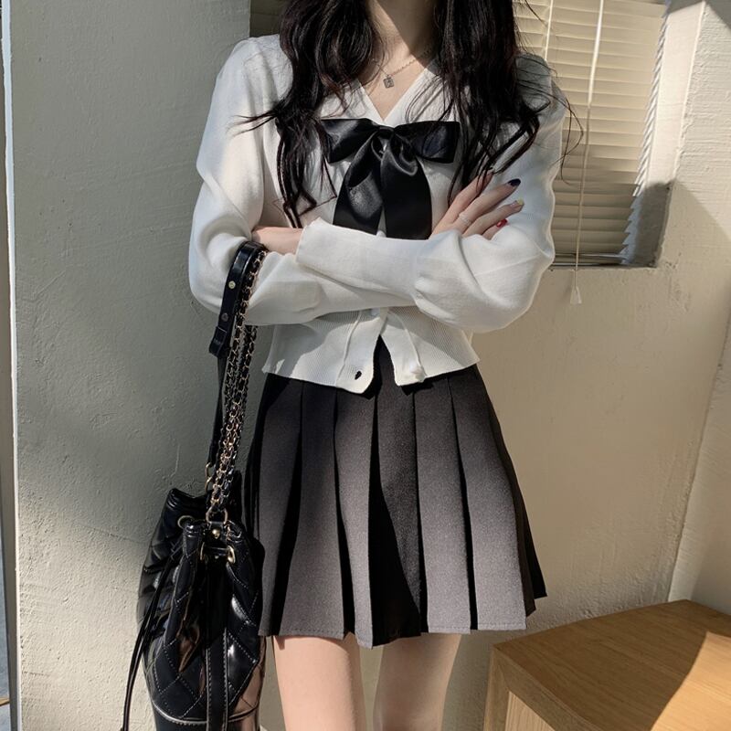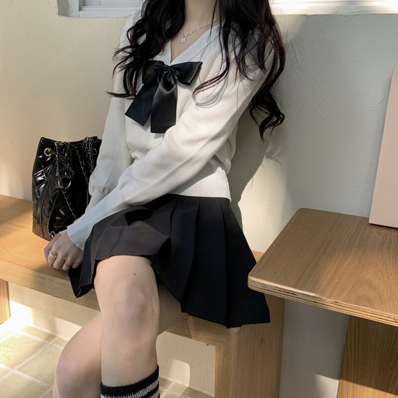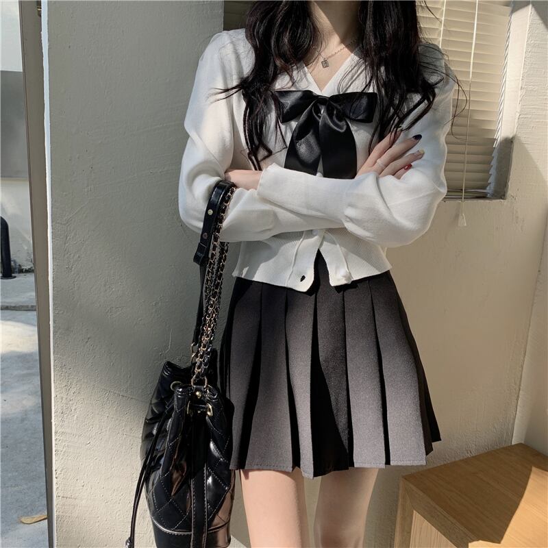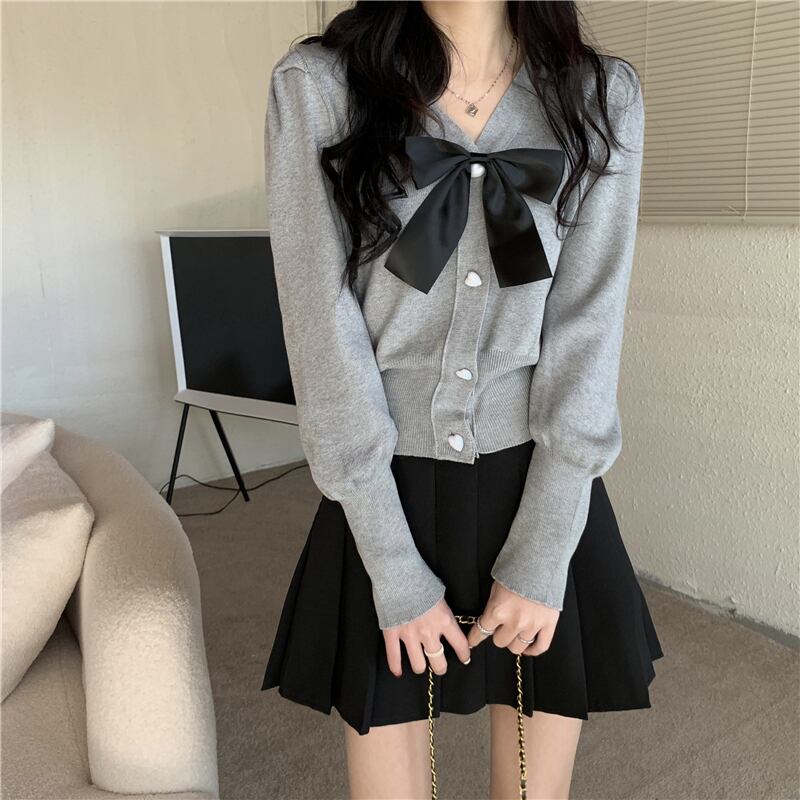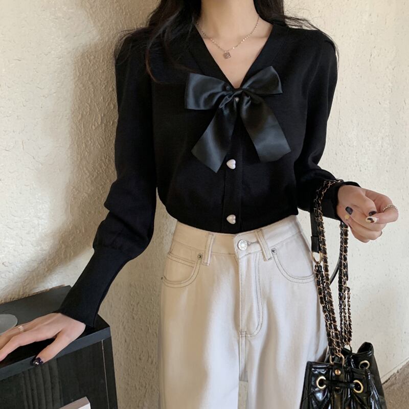 ホワイトリボンニットカーディガンスプリングショートセーター コート 春物 SYJ729690293