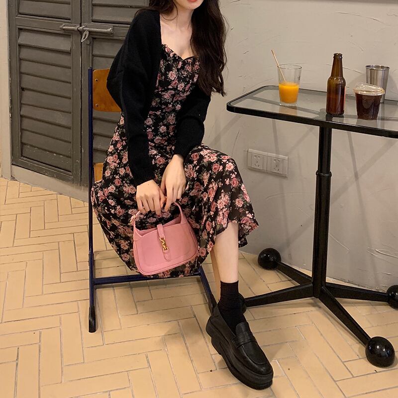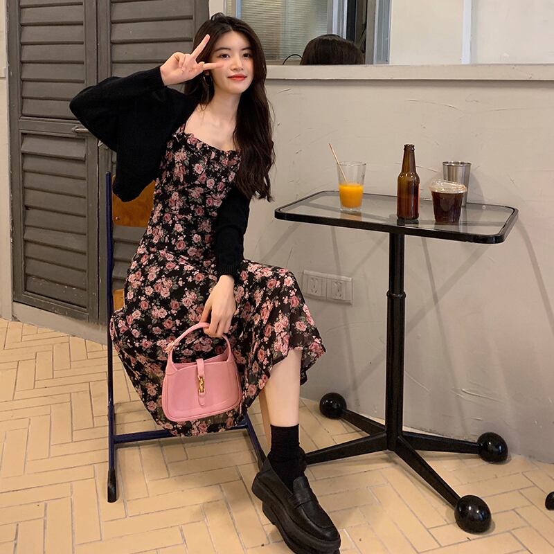 フローラルワンピーススプリングスタンダードロングスカート レトロ 春物 花柄 SYJ50108597580