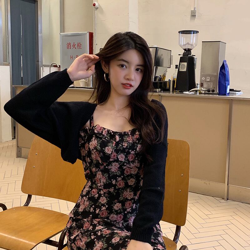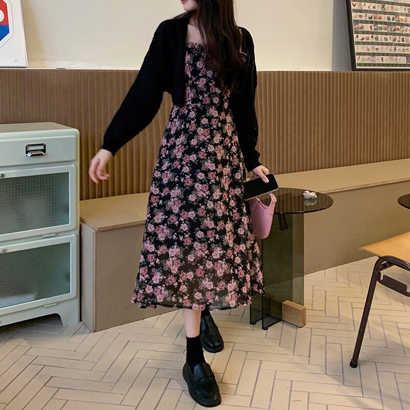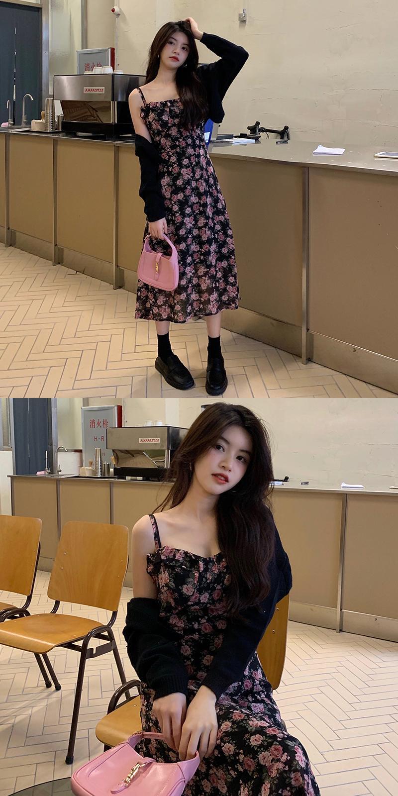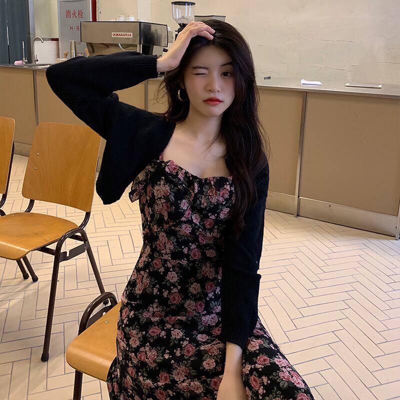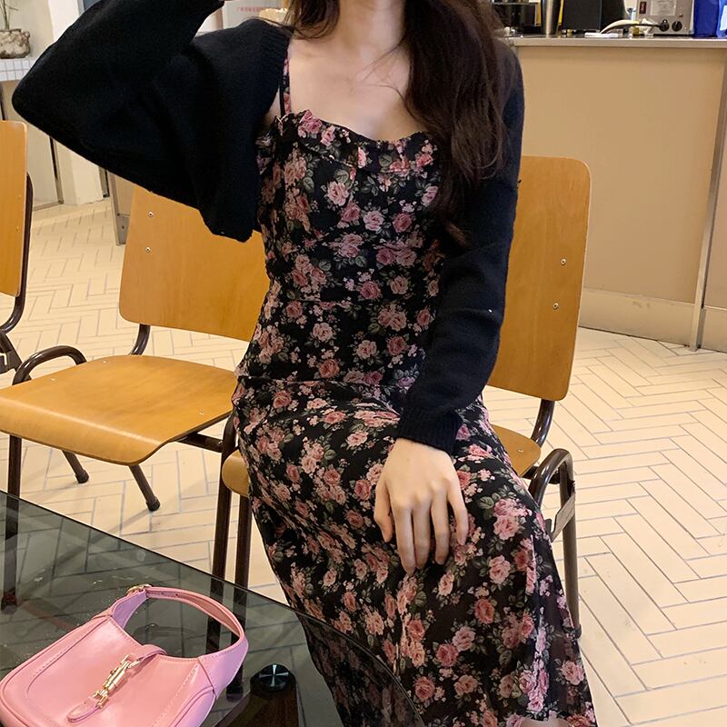 色:ブラックジャケットワンピース,花柄ワンピース