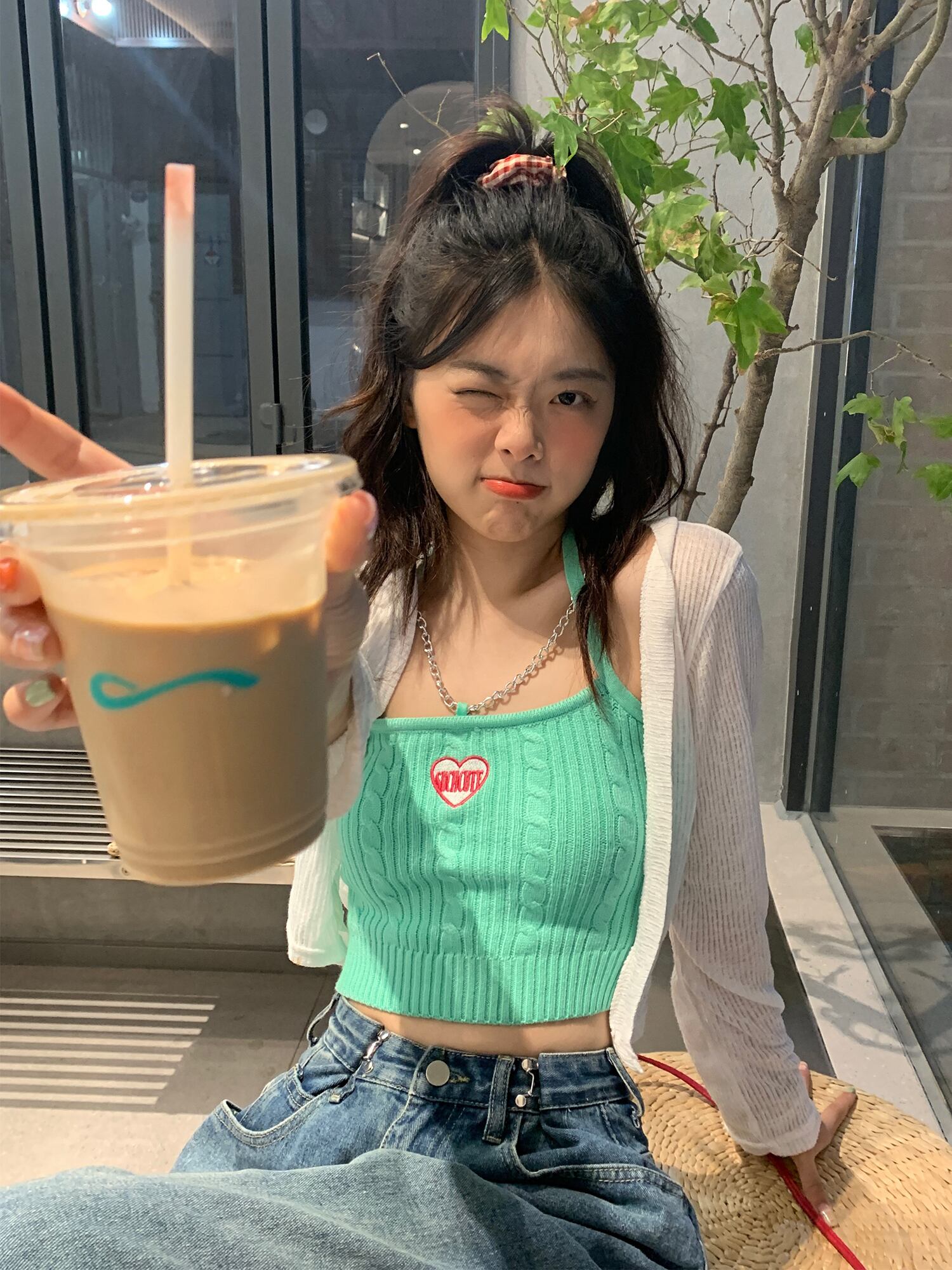 色:グリーンベストワンピース,長袖カーディガンワンピース