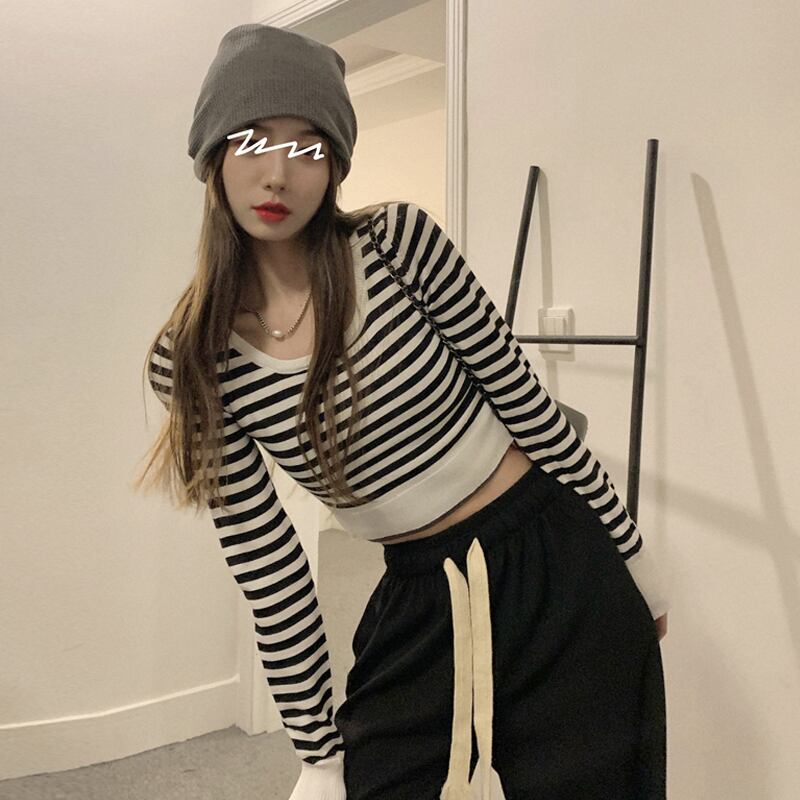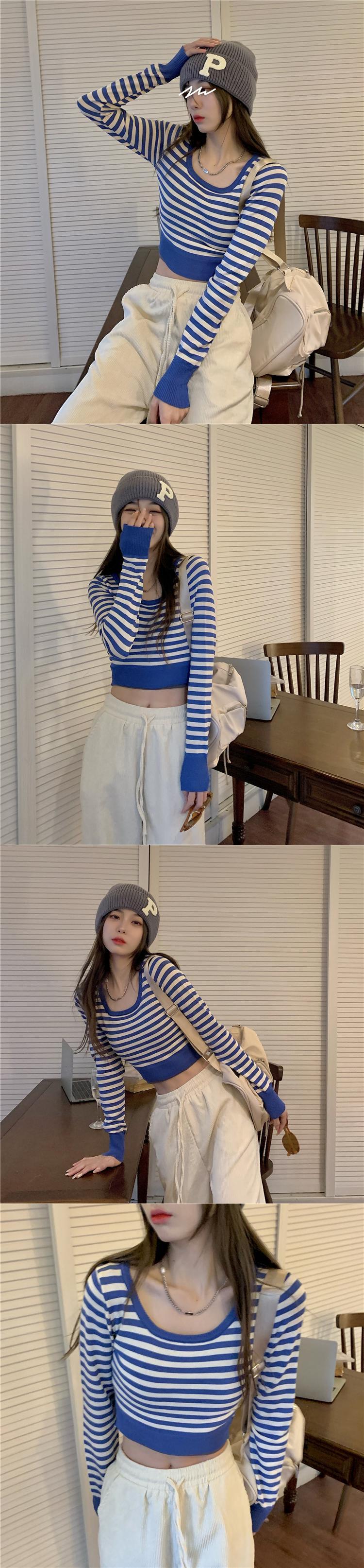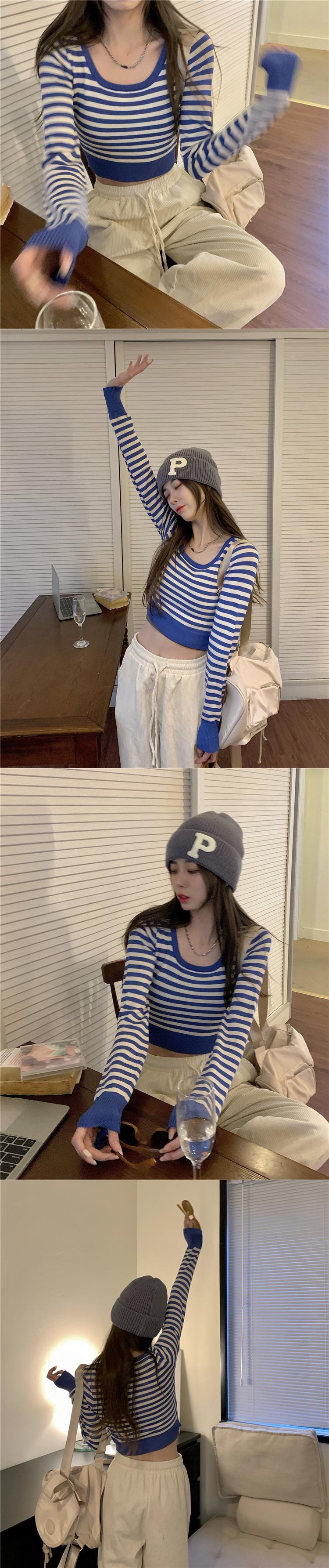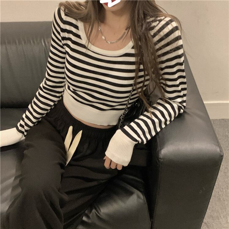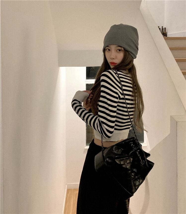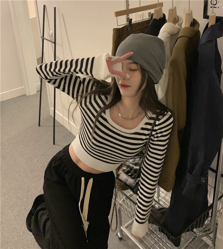 ストライプゆったりシャツ スプリング秋物ショートセーター ニットトップス 春物 オータム ピュア SYJ85793608400