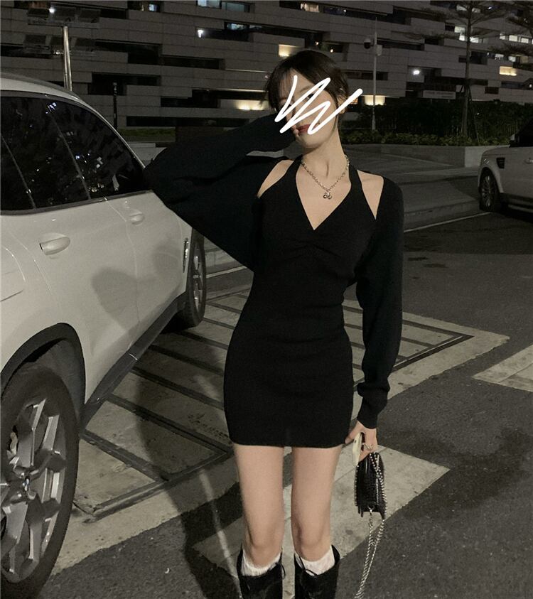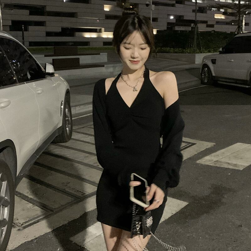 ブラックホルターニットワンピース夏服スリムショートスカート 夏物 SYJ11212561255