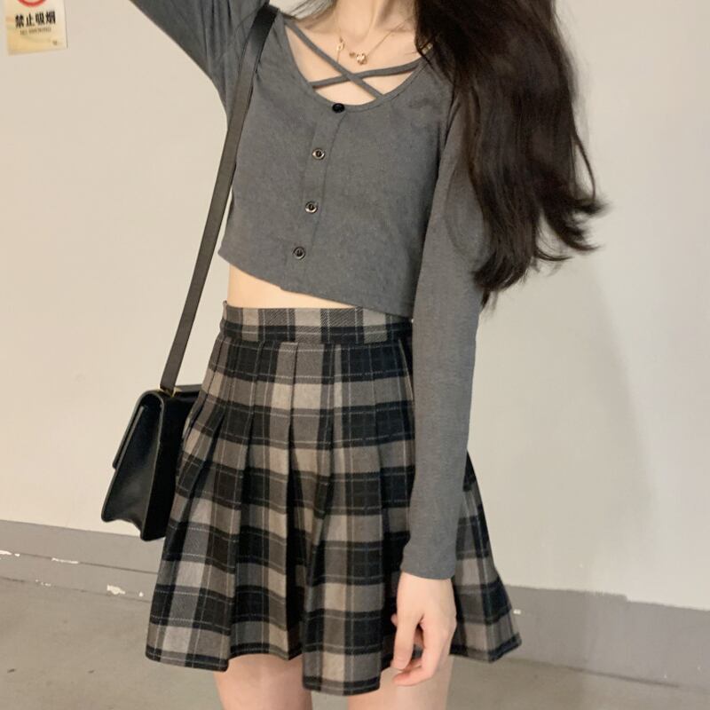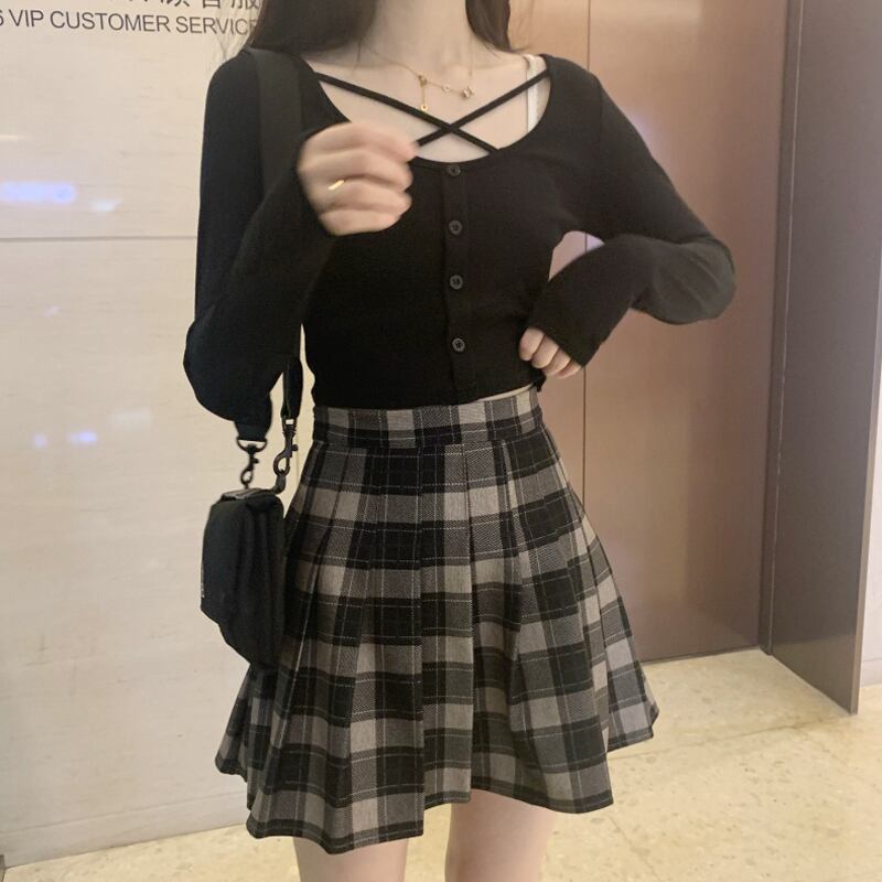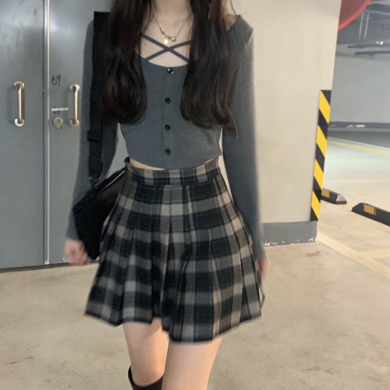 色:ブラックトップシングルピース,ワンピースダークグレートップ,チェック柄プリーツスカートワンピース