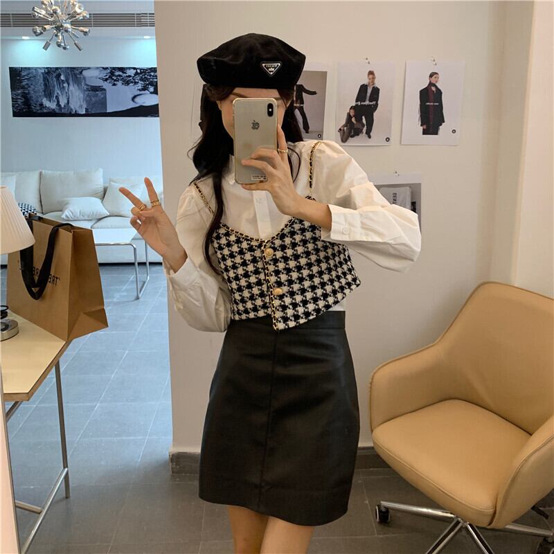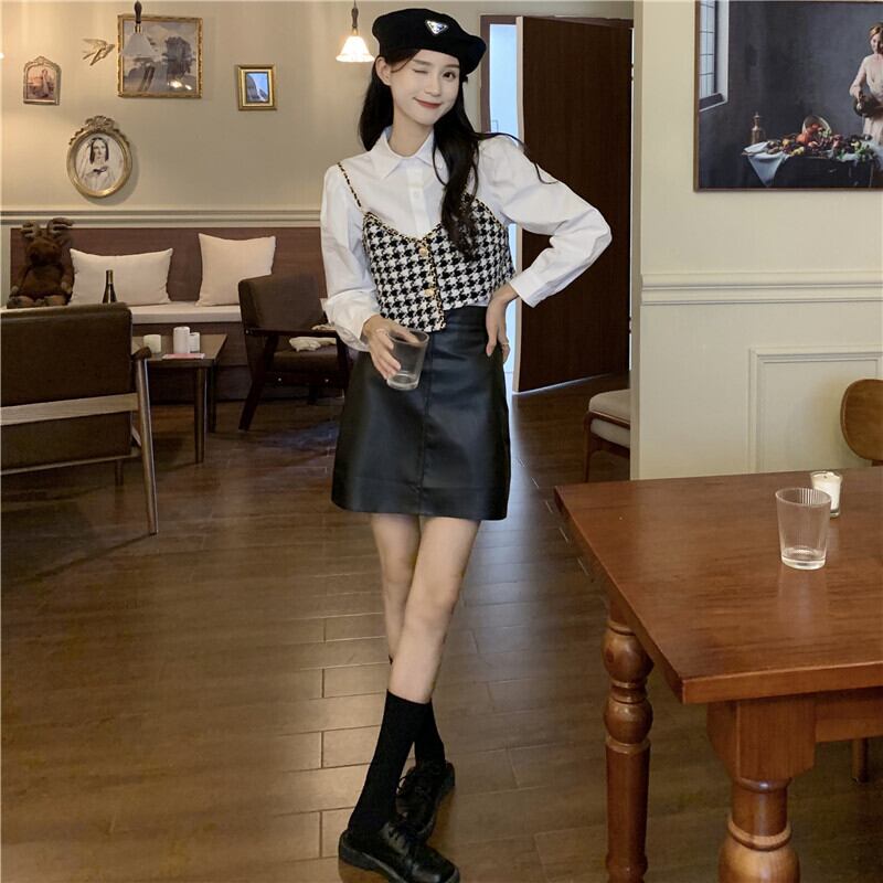 色:白いシャツのワンピース,千鳥格子スリングワンピース,レザースカートシングルピース
