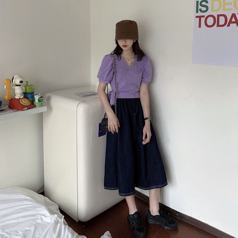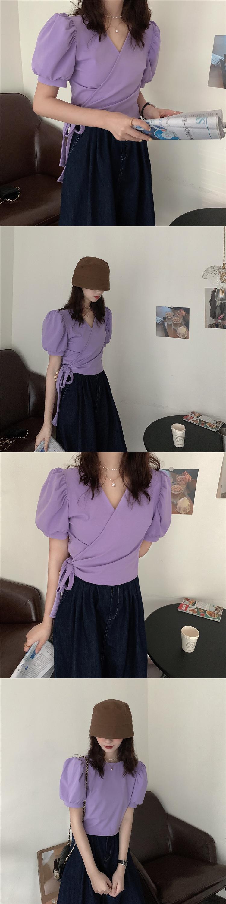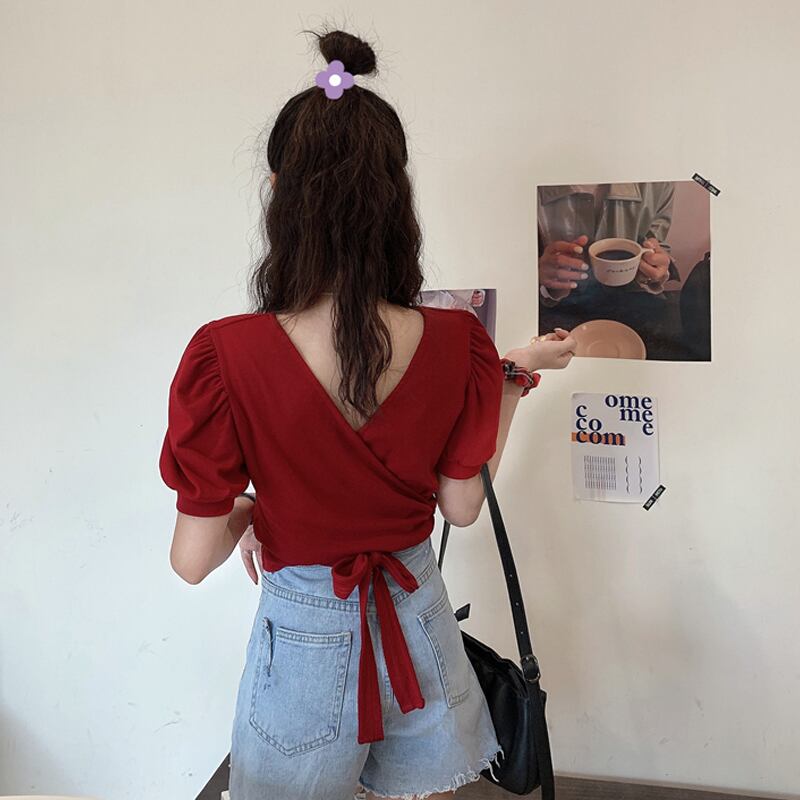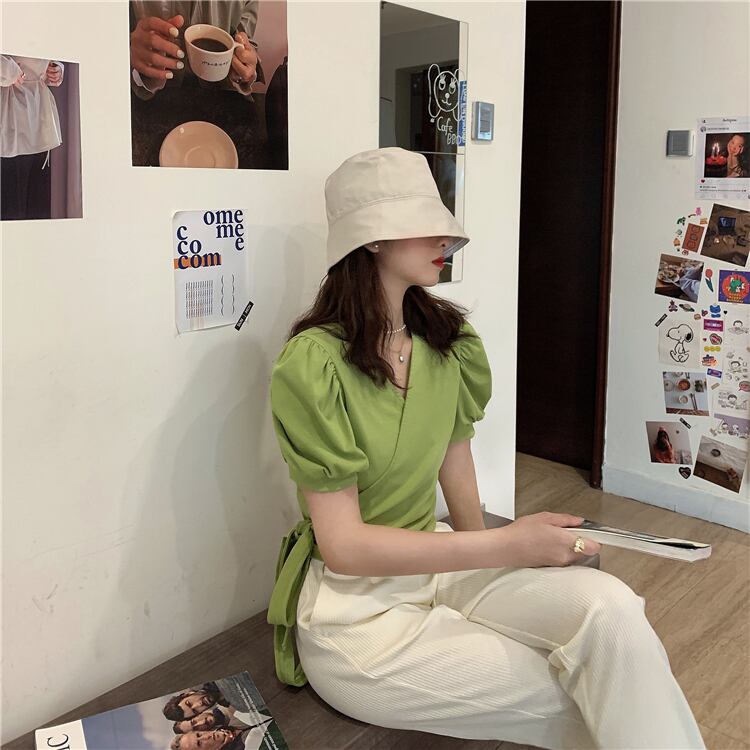 ショートトップス 夏服バンドグリーンVネックTシャツ 夏物 パフスリーブ SYJ39571811976