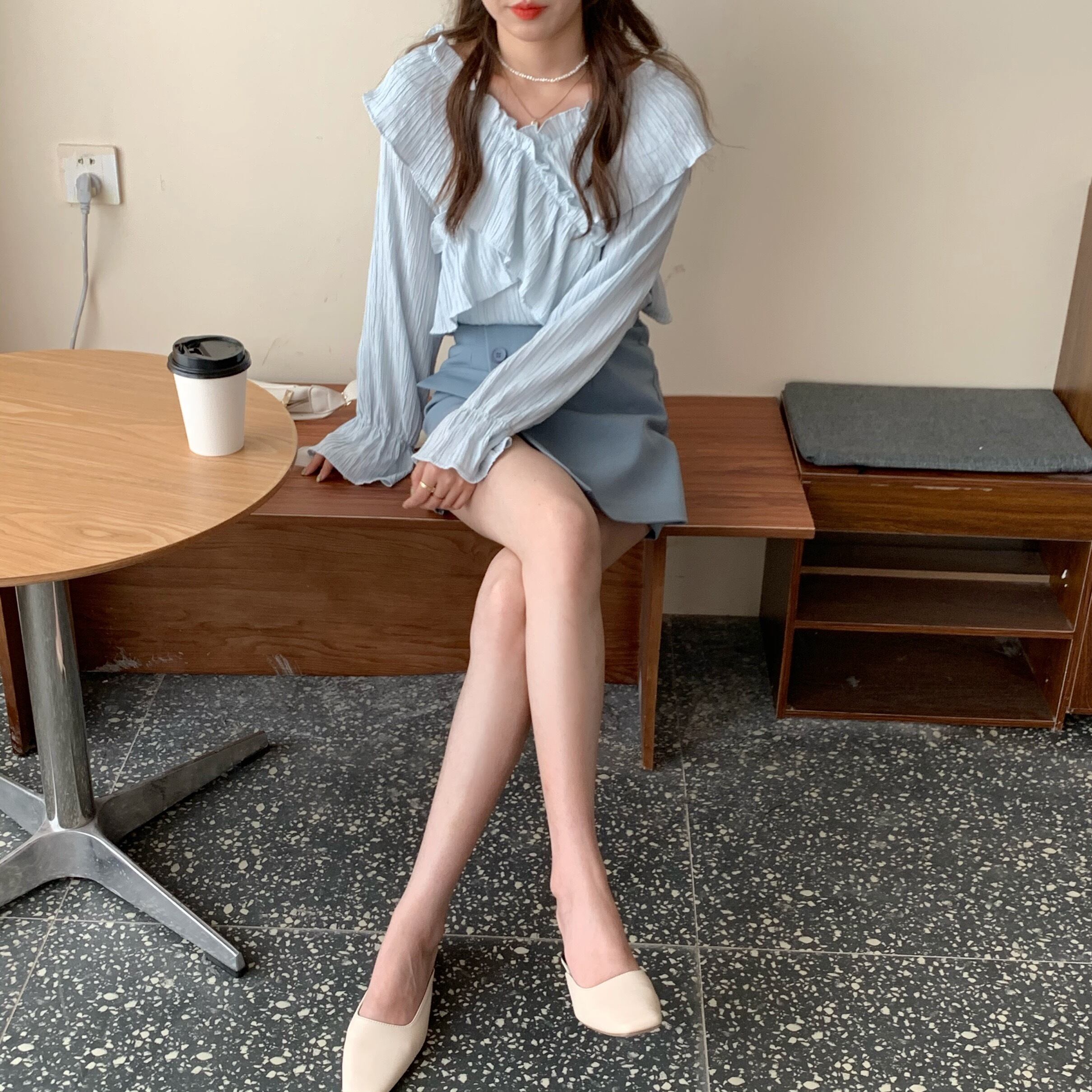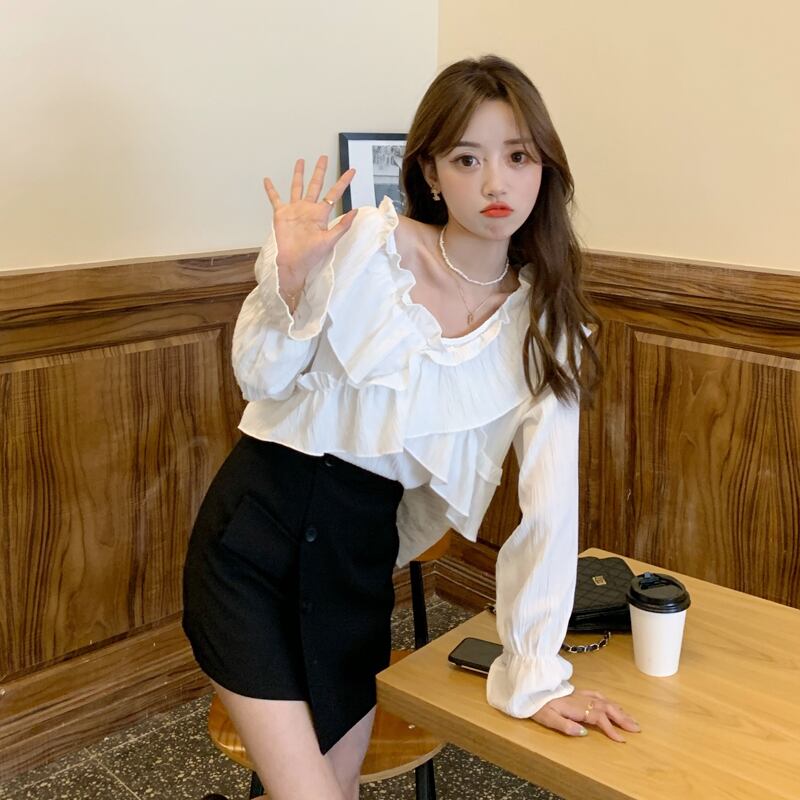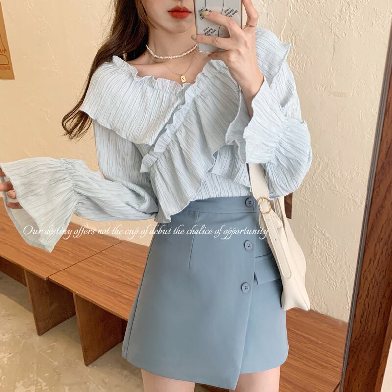 ブルーVネックシャツ スプリングトップス ロング 大人ガーリー スウィート キュート カジュアル 春物 長袖 SYJ84057540084