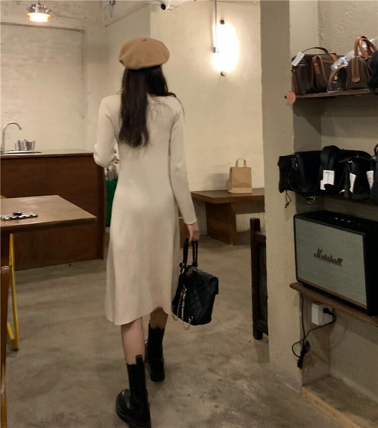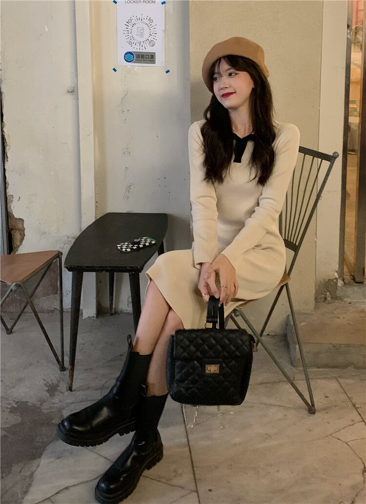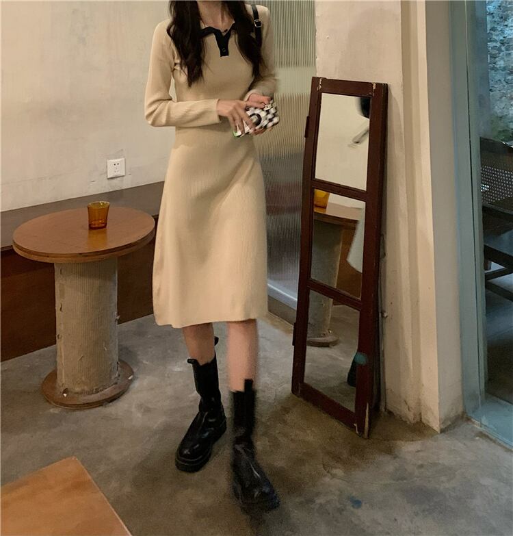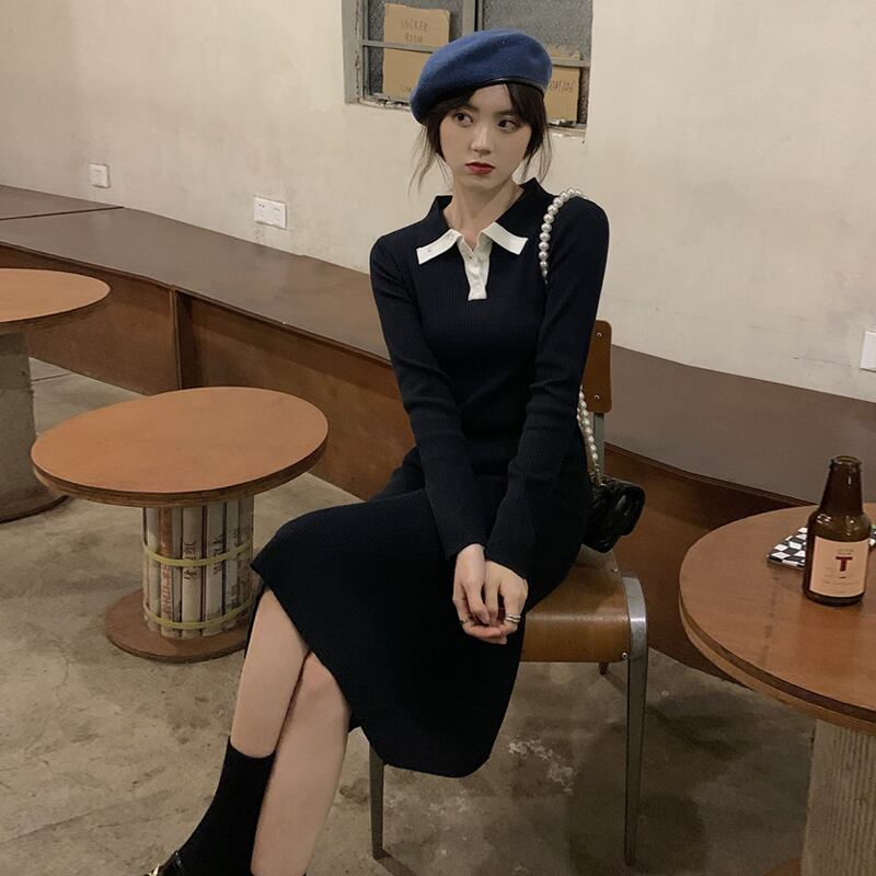 ブラックニットワンピーススプリング秋物スタンダードスリムスカート ロング レトロ 春物 オータム 長袖 SYJ98300493402