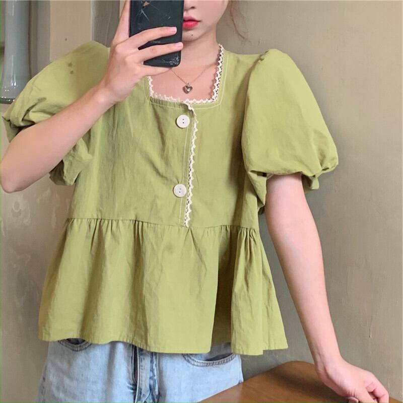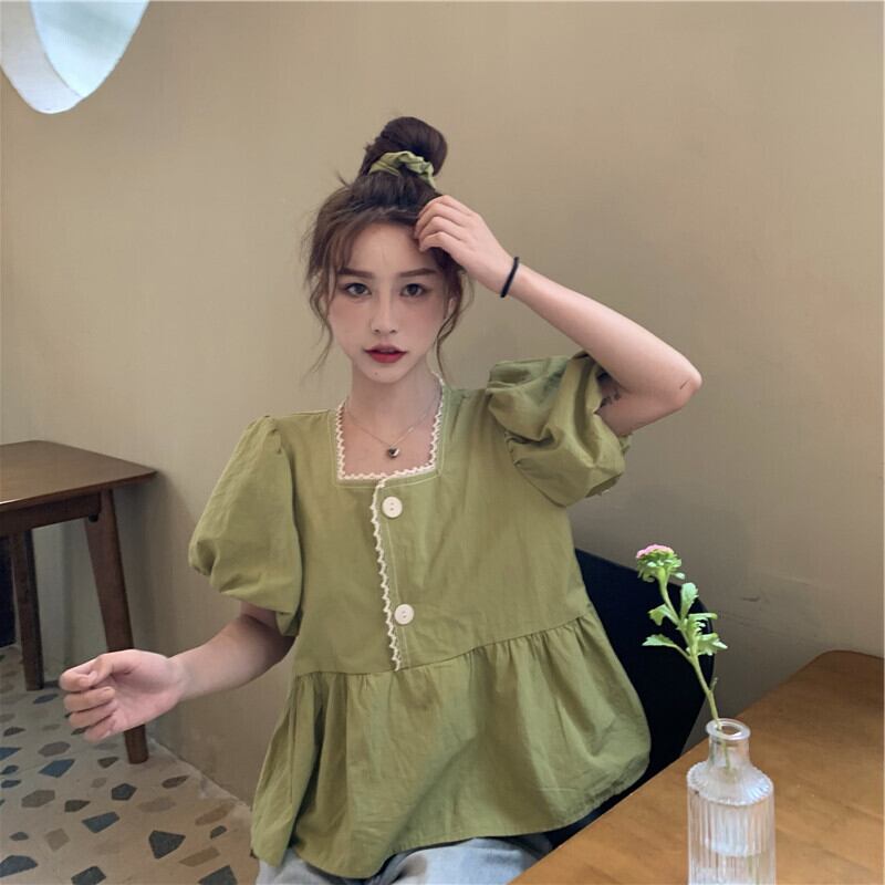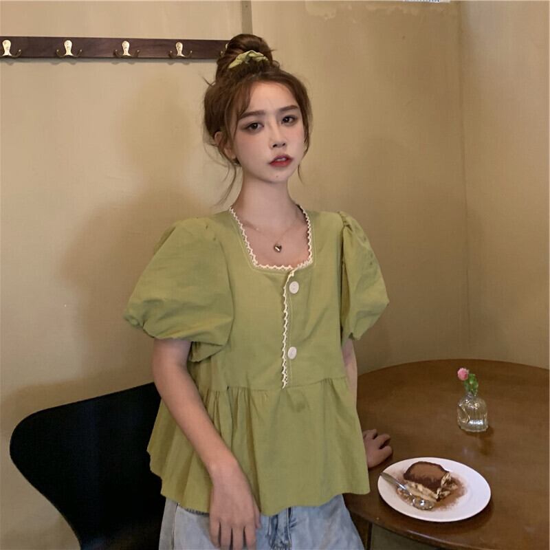 トップス 夏服韓国ファッションスタイルカラーシャツ 大人ガーリー スウィート キュート カジュアル 夏物 スクウェア パフスリーブ SYJ35542695847