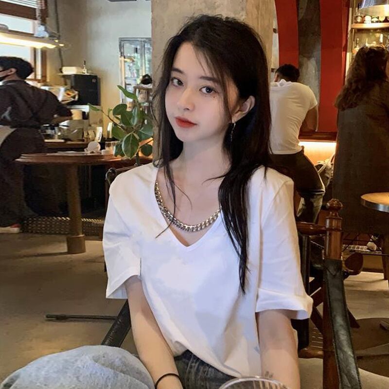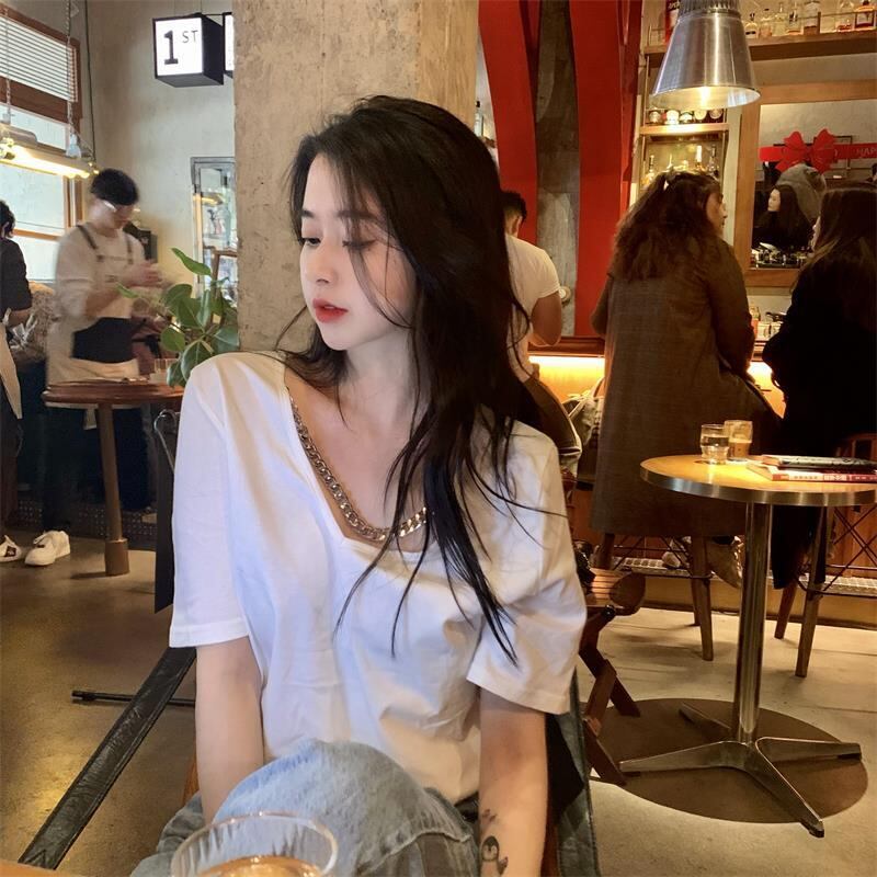 ホワイトVネックTシャツ夏服ルーズスタイルトップス NEW 夏物 SYJ39409447538