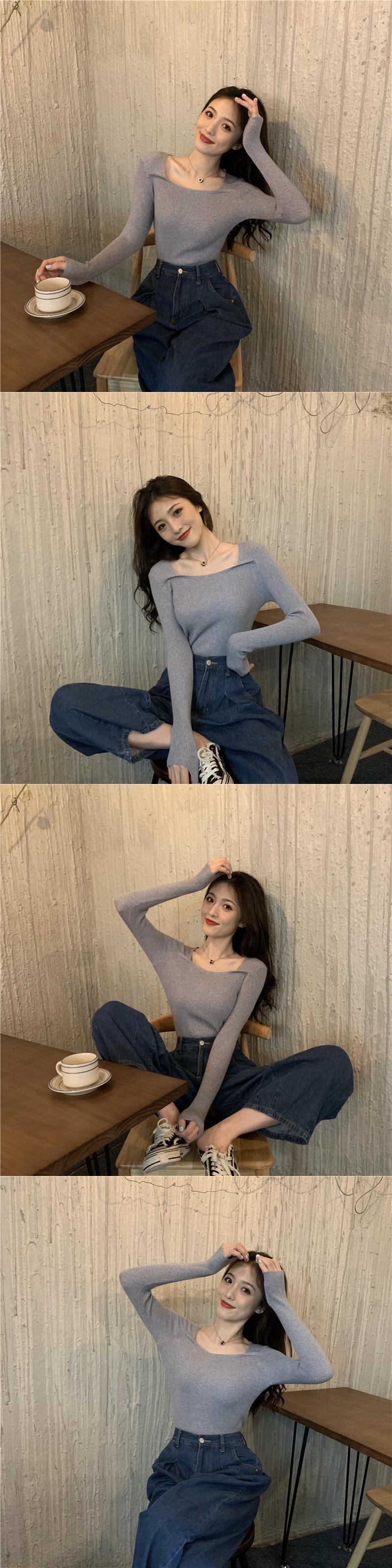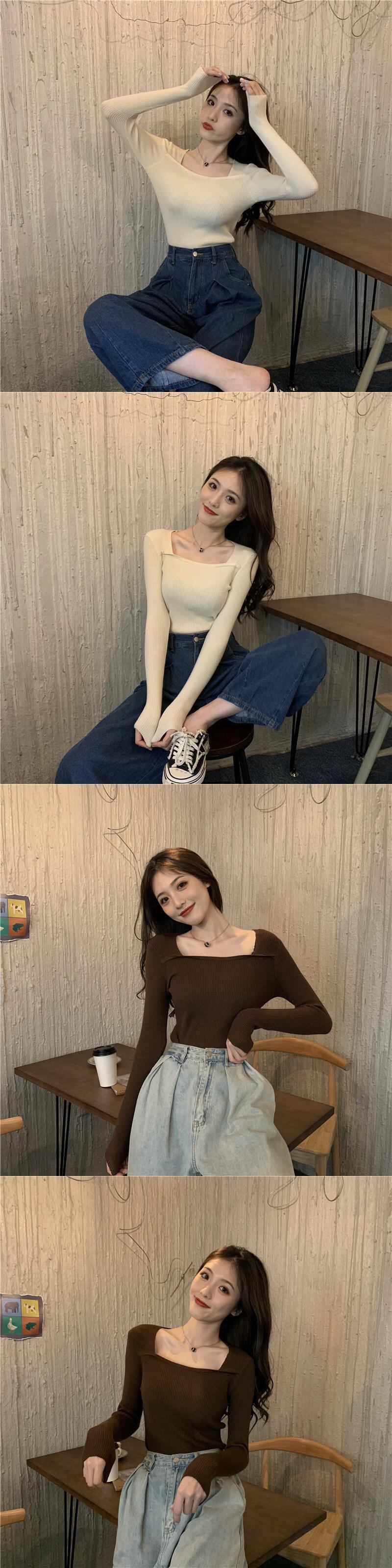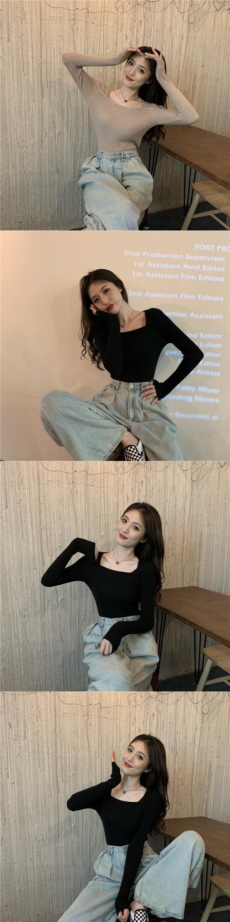 ブラックTシャツシャツ スプリングニットゆったりトップス ロング 春物 スクウェア 長袖 NEW SYJ87924606452